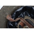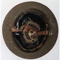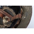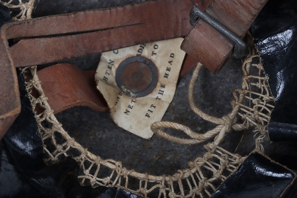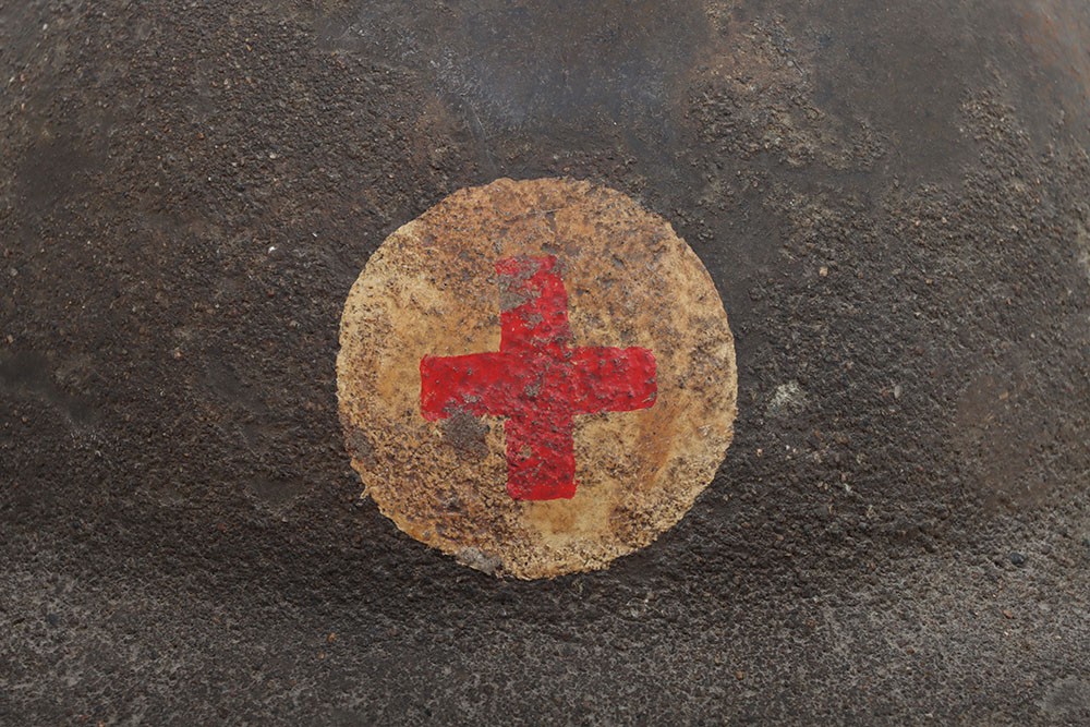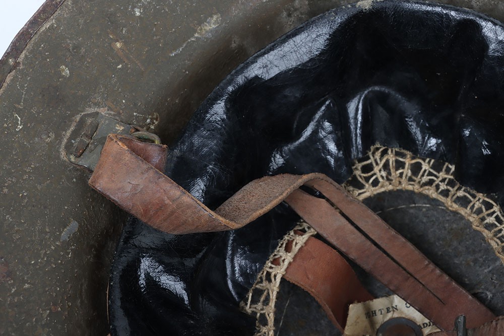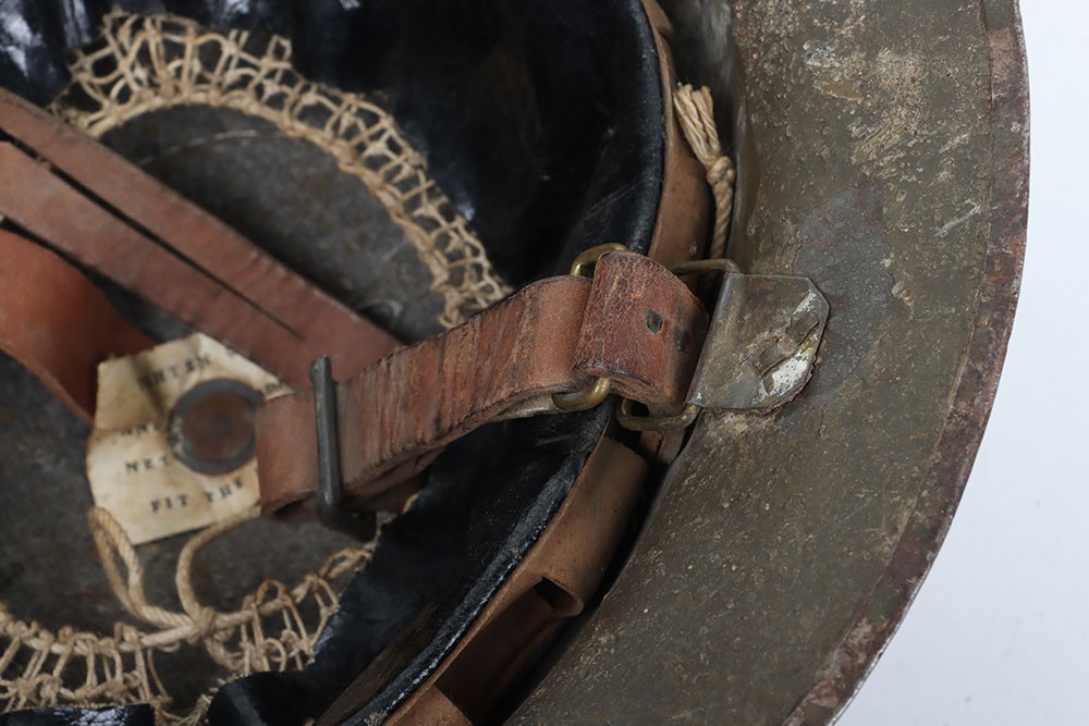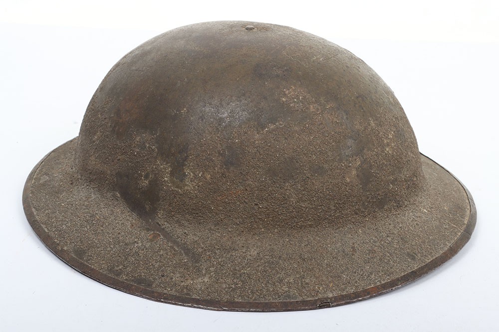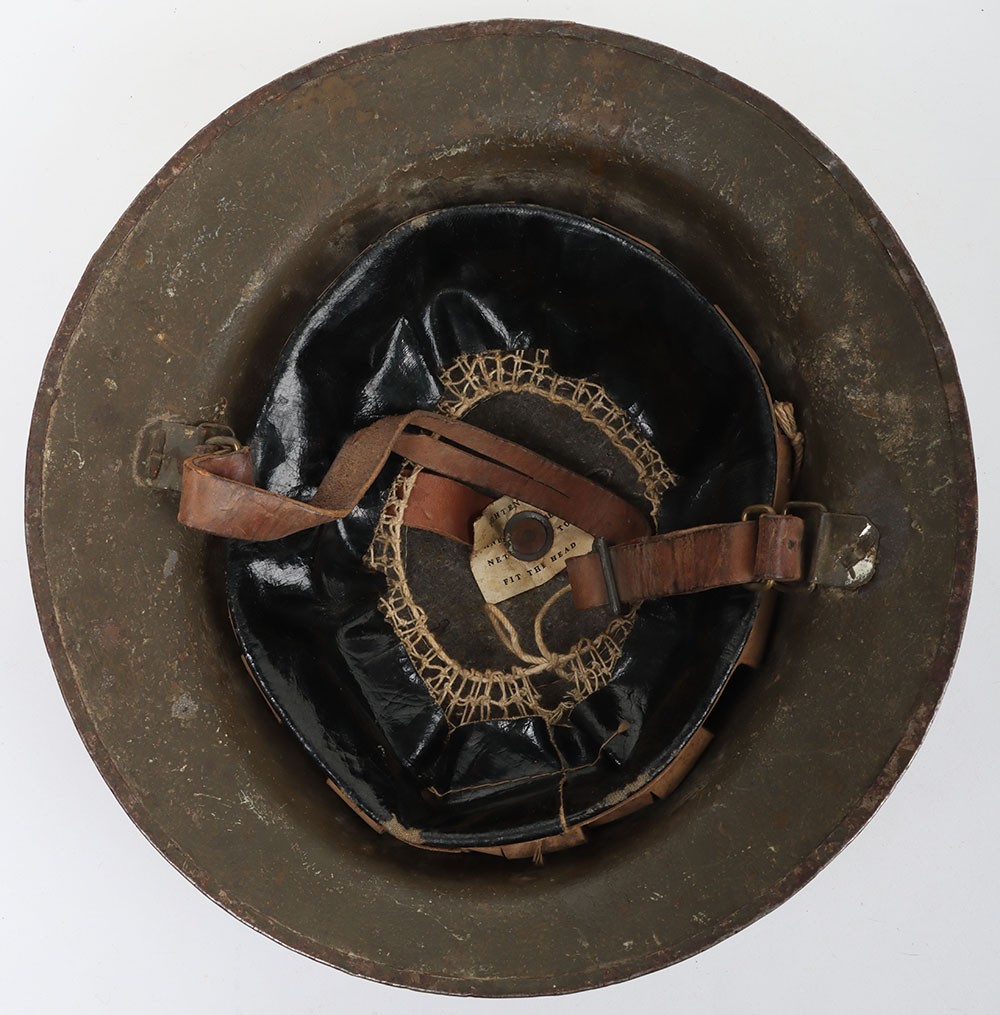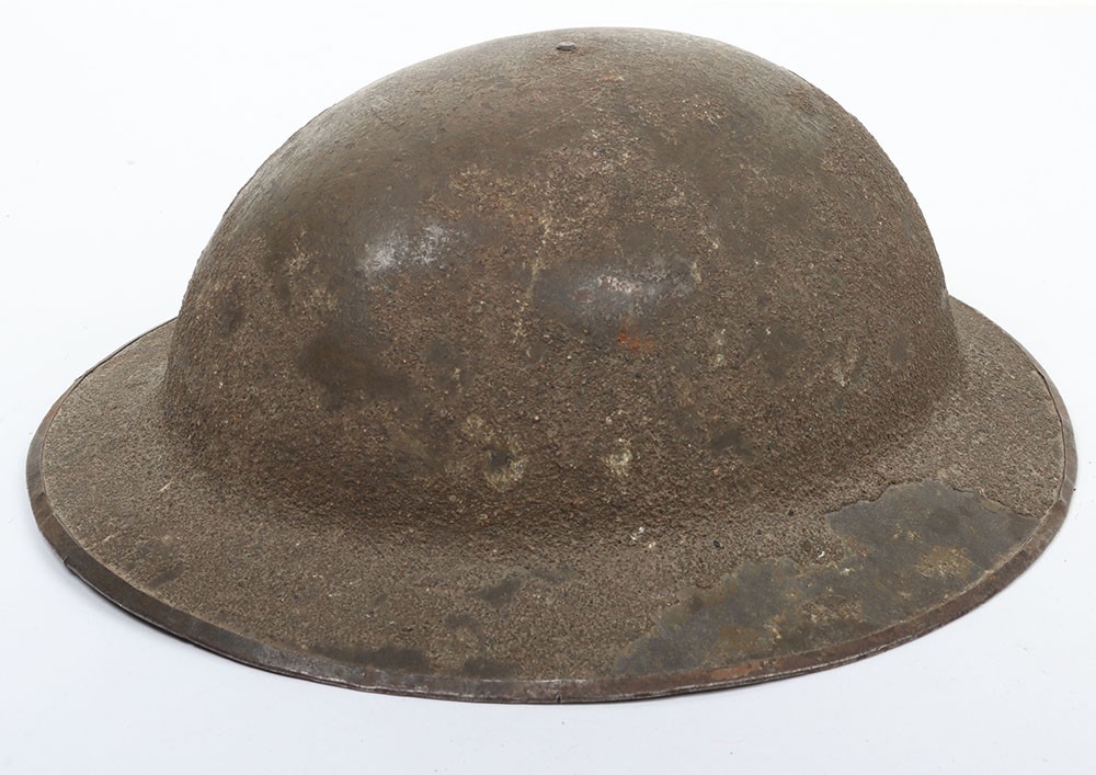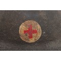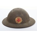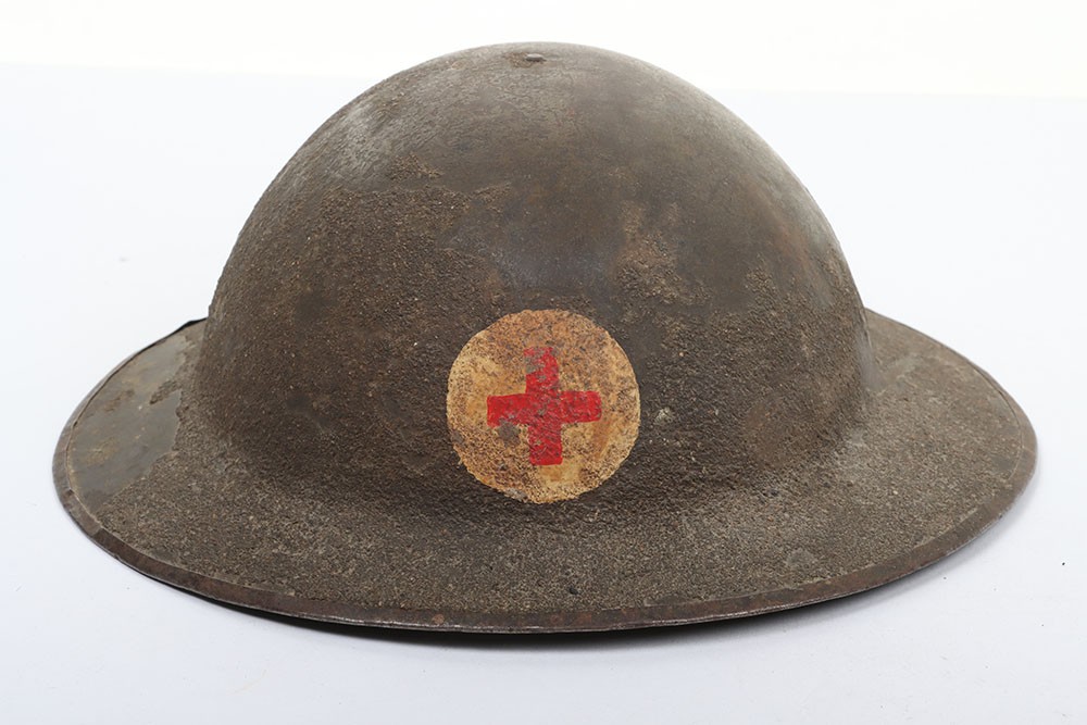 WW1 British Other Ranks Medics Steel Combat Helmet, fine example of a 2nd type brodie steel helmet which retains much of its original rough textured combat camouflage type paint finish to the exterior of the shell. Helmet has the brim covering. The front of the helmet has painted red cross medics insignia. Interior with the original oilskin liner system, leather chinstrap with the chinstrap mounts having the split pins. Overall a very nice example of a desirable WW1 steel helmet.