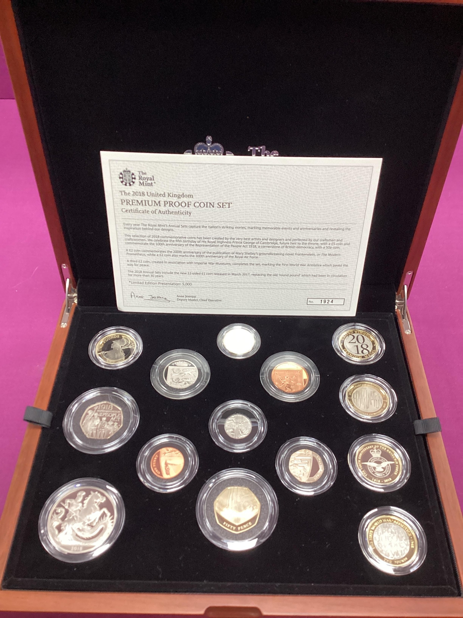 2018 Royal Mint UK Premium Proof Coin Set, cased with a certificate of authenticity.