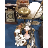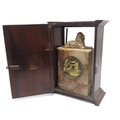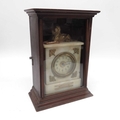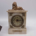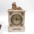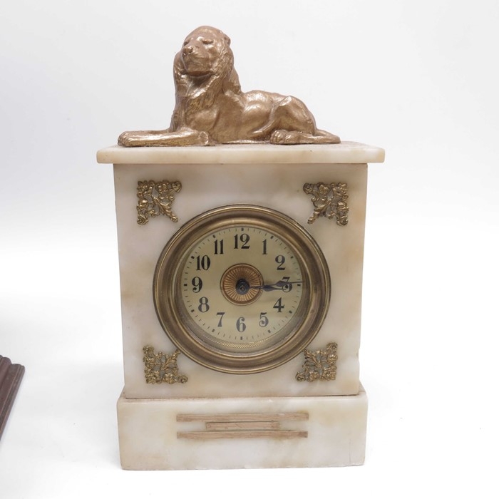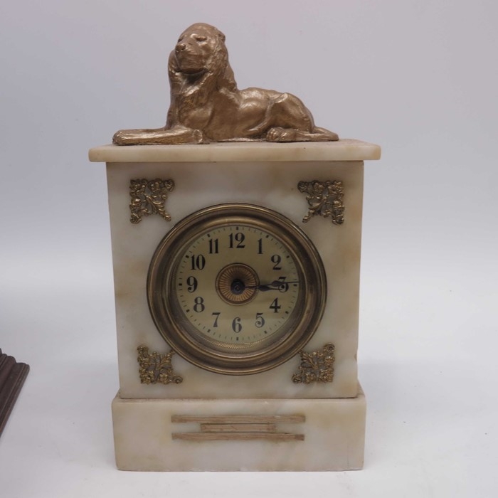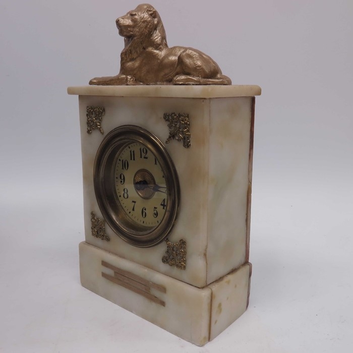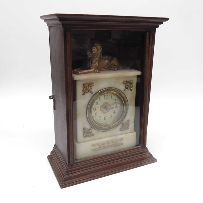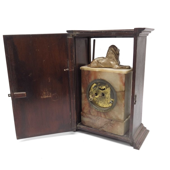 A marble cased mantel clock with cast metal lion surmount, in glazed wooden case. 26cm high