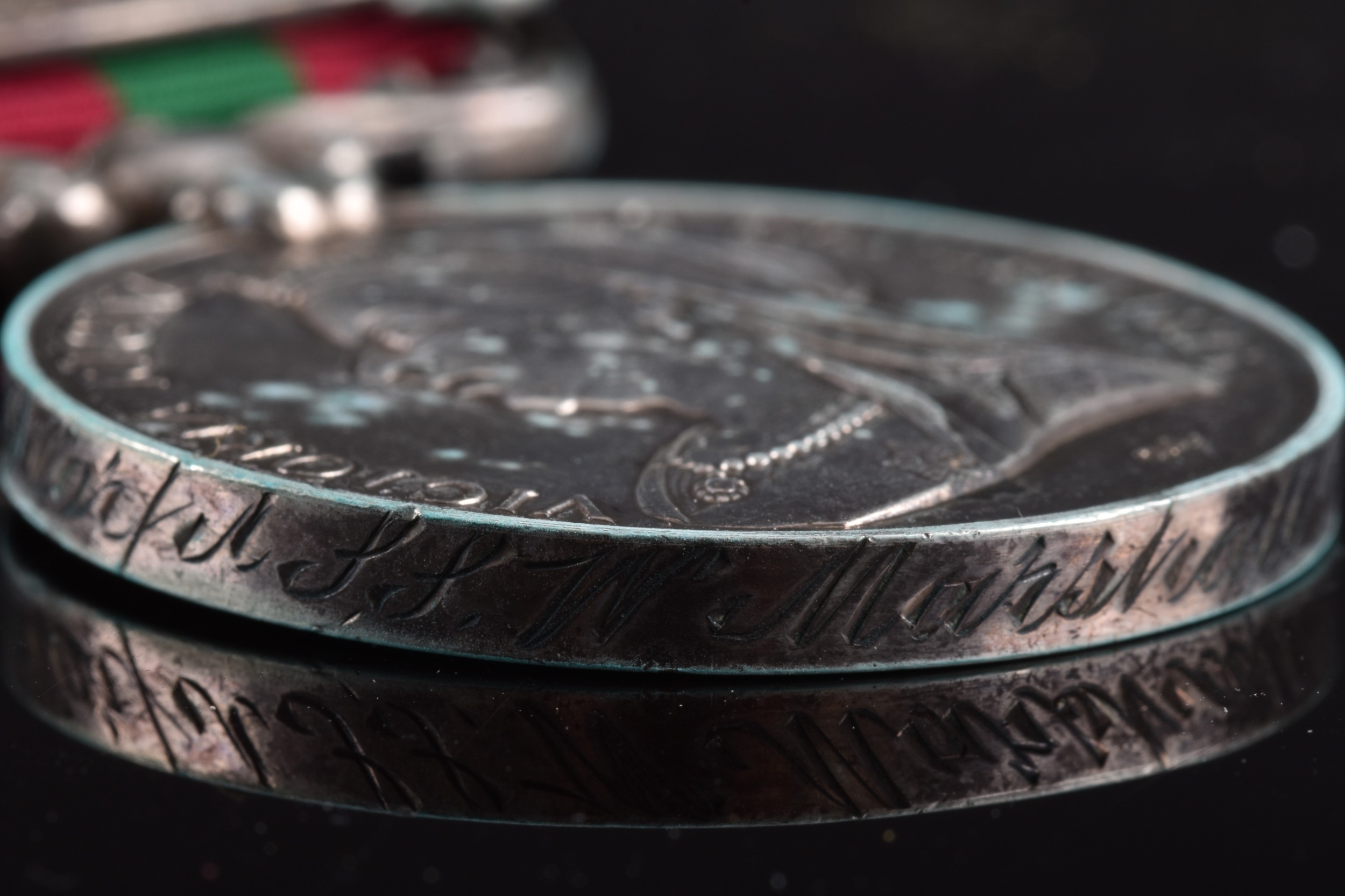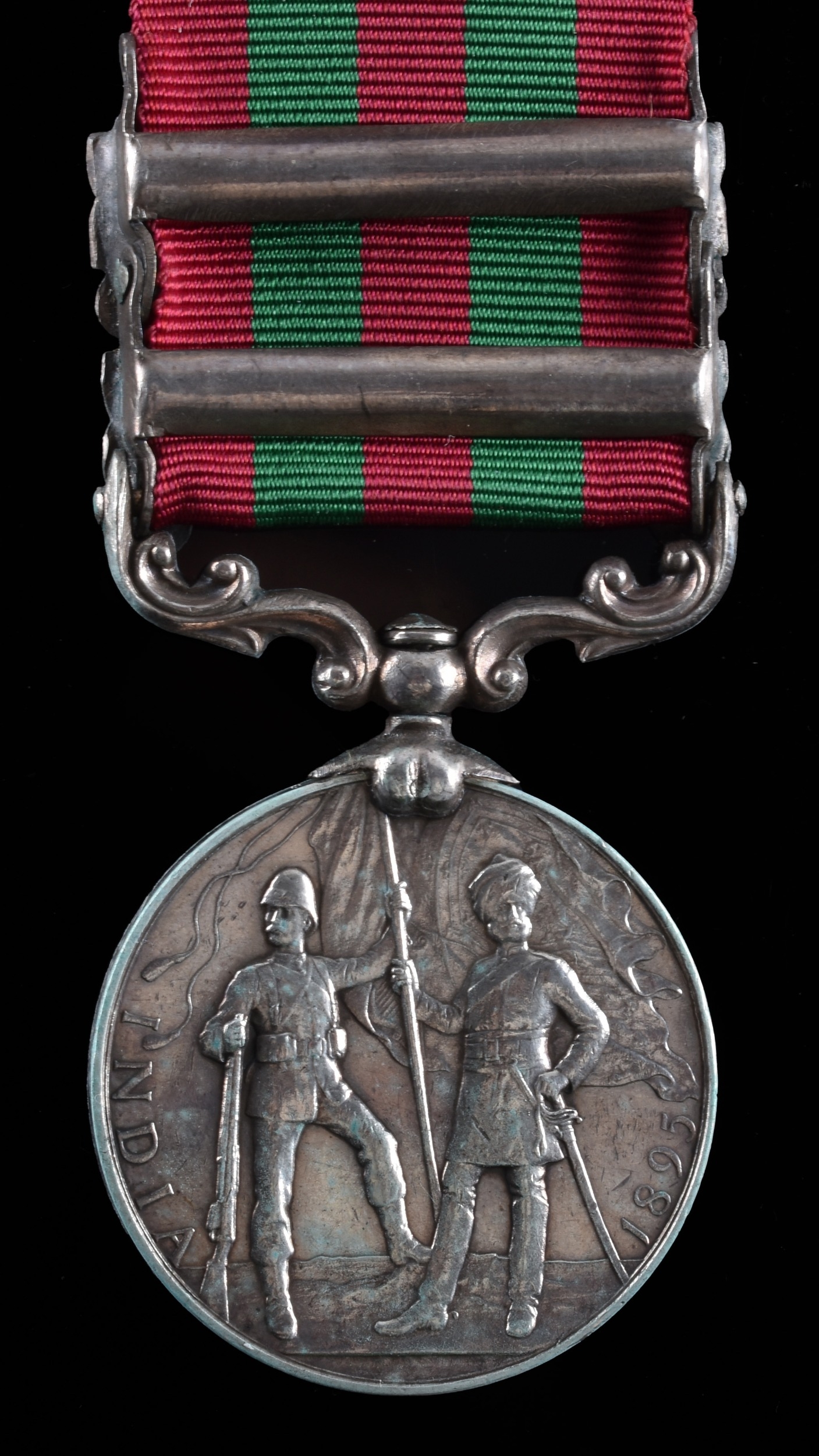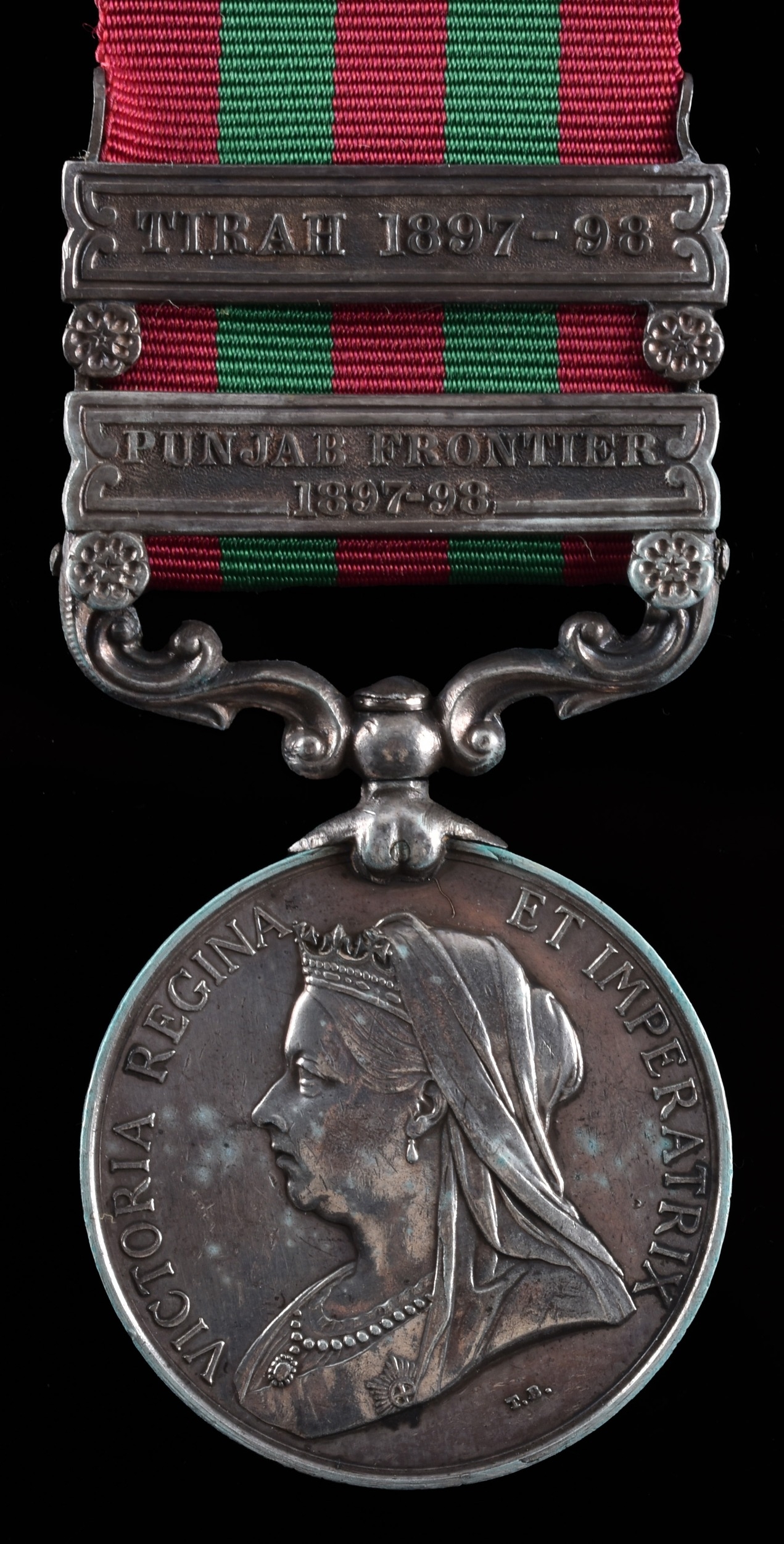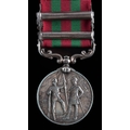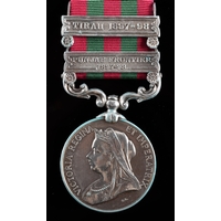 An India Medal 1895 with 2 clasps, Punjab Frontier 1897-98, Tirah 1897-98 awarded to: Corporal Marshal, 24th Field Battery, Royal Artillery (75149 Corpl S. S. W. Marshall, 24th Fd By R.A.).
