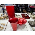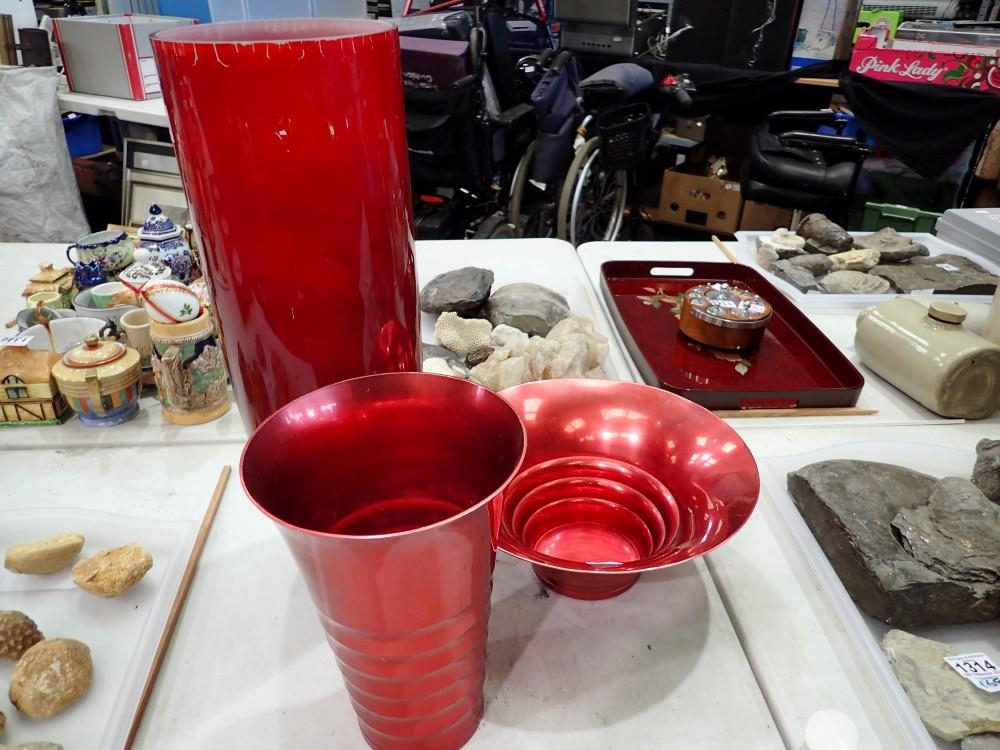 Very large red glass modern vase with a Kaymet branded red aluminium case and bowl, largest H: 50 cm (3). Not available for in-house P&P