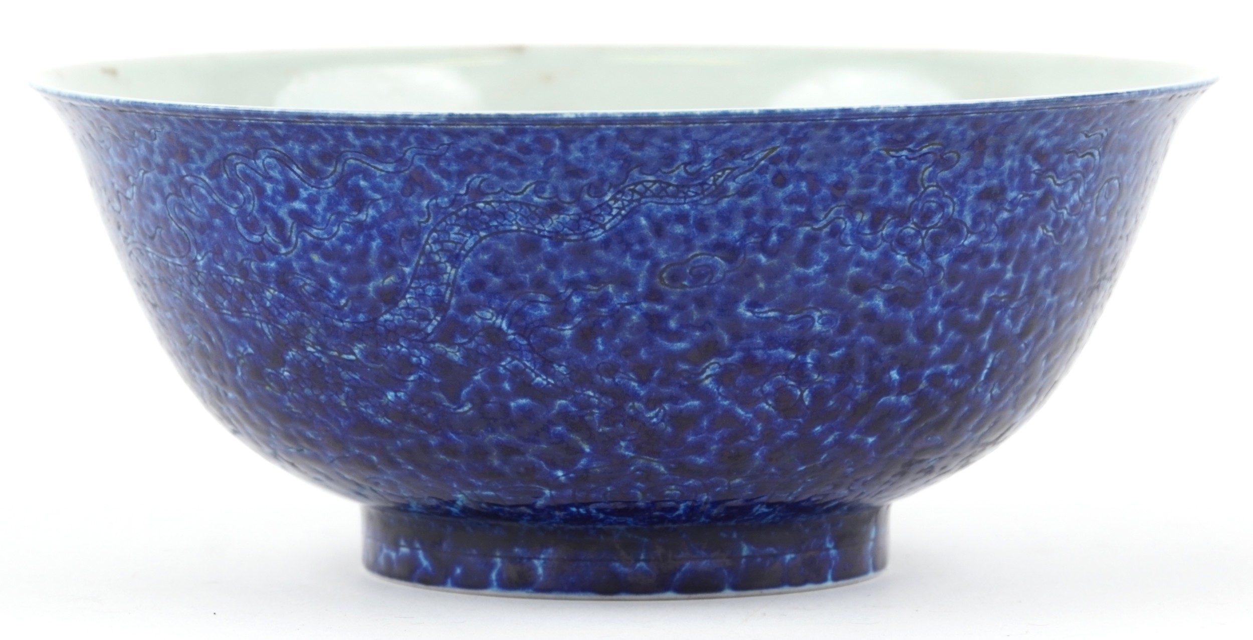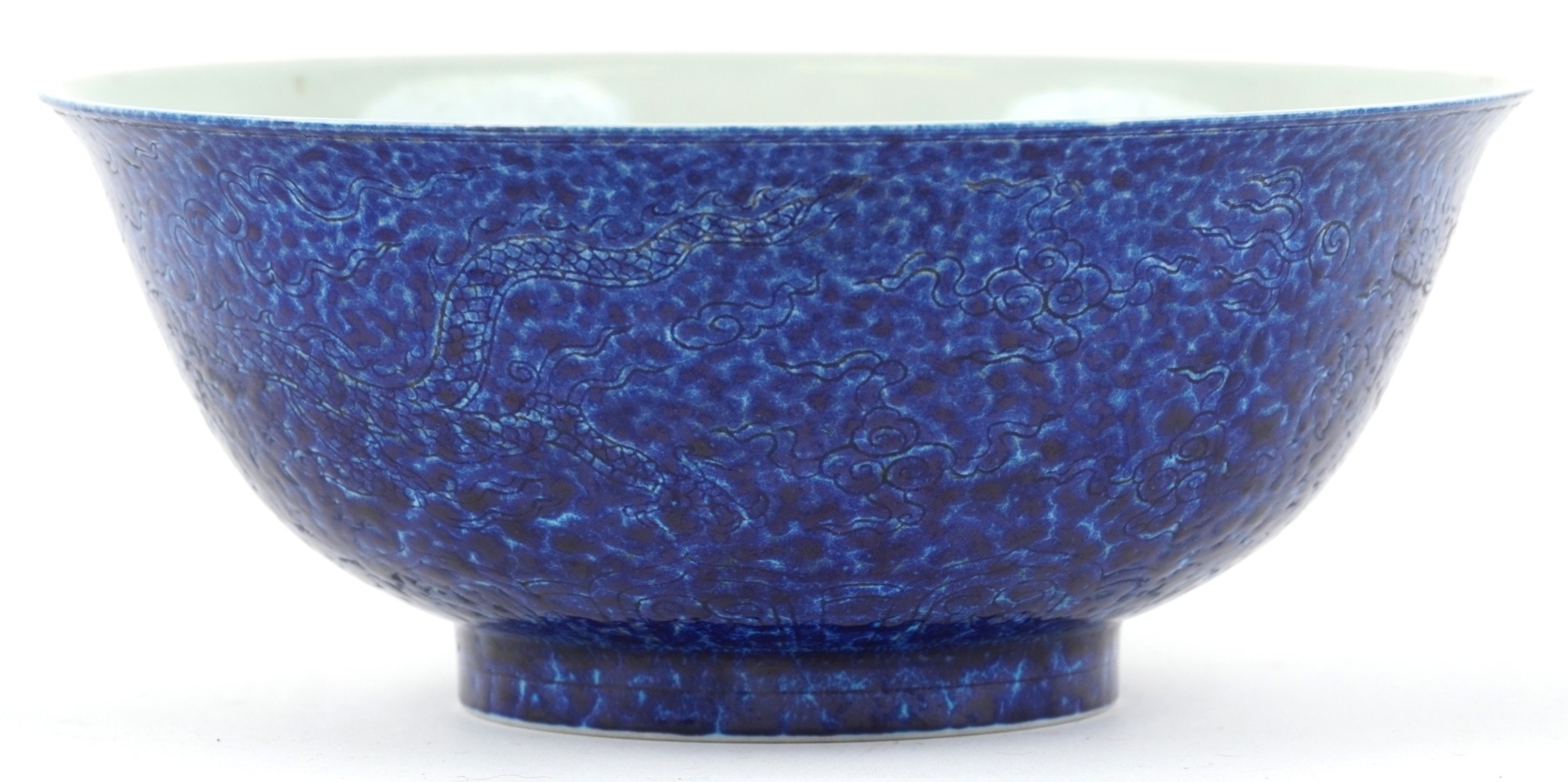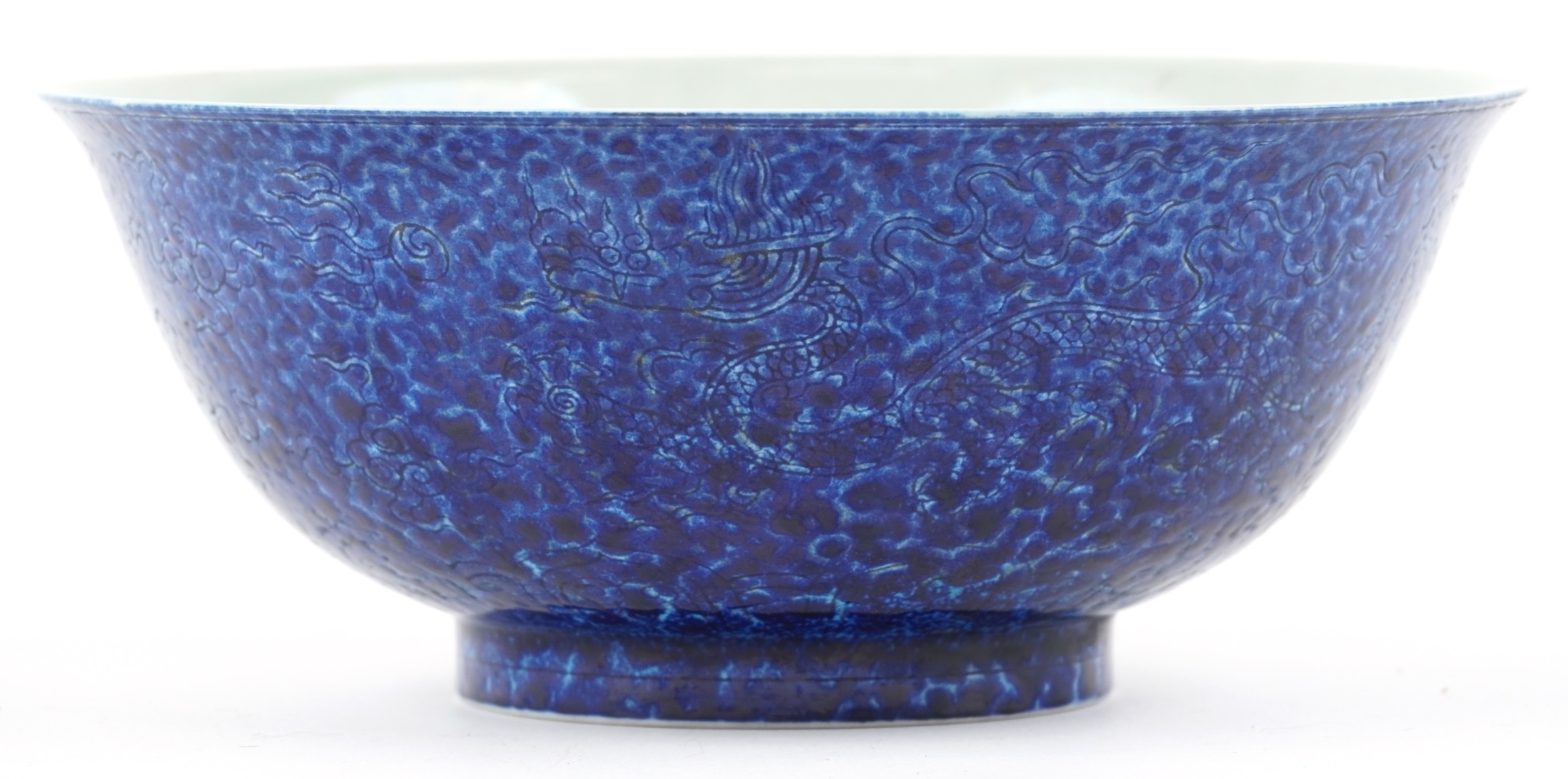 A Chinese porcelain bowl having a mottled blue glaze and hand painted dragons chasing a flaming pearl and incised dragon to the interior, bearing six figure character marks to the base, 8cm high x 21.5cm in diameter.