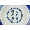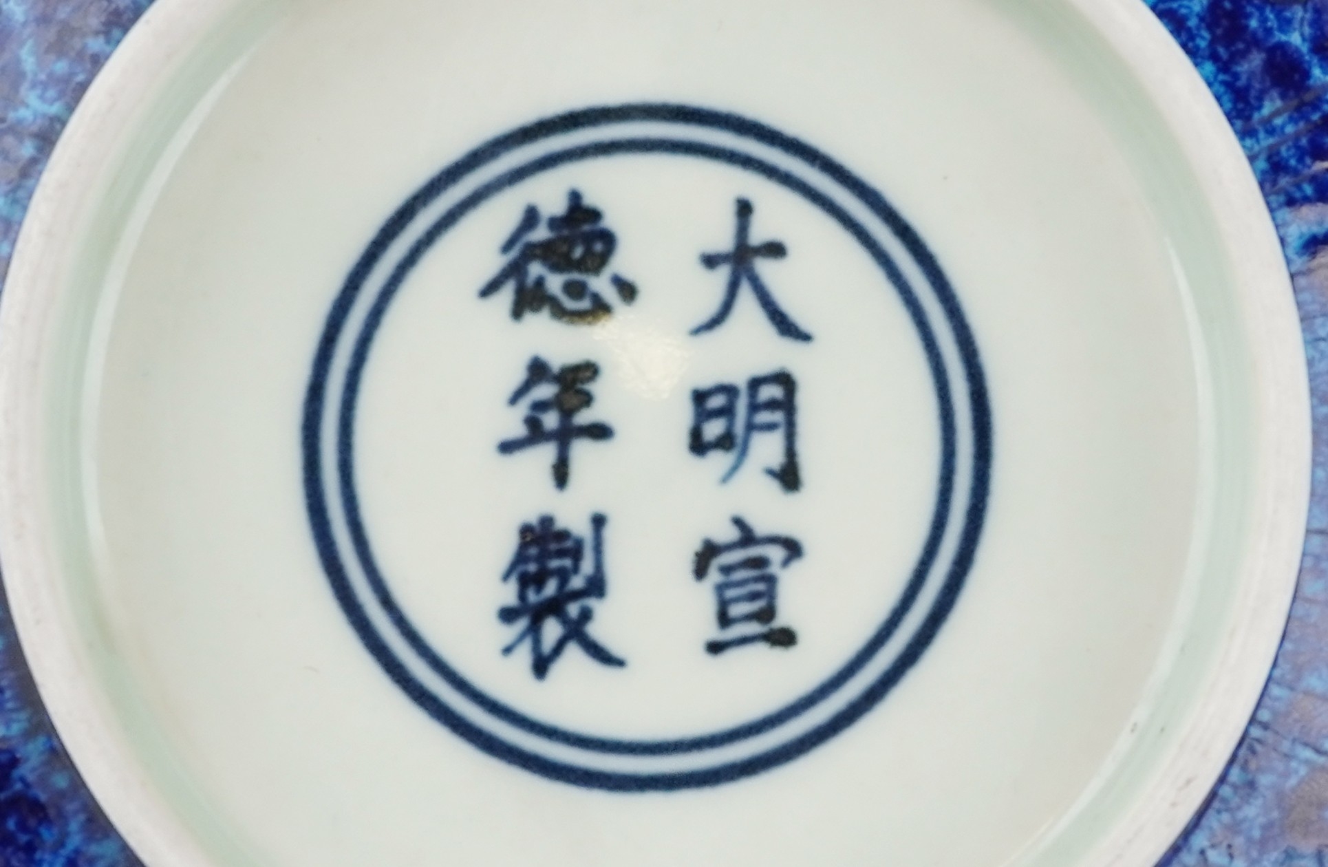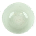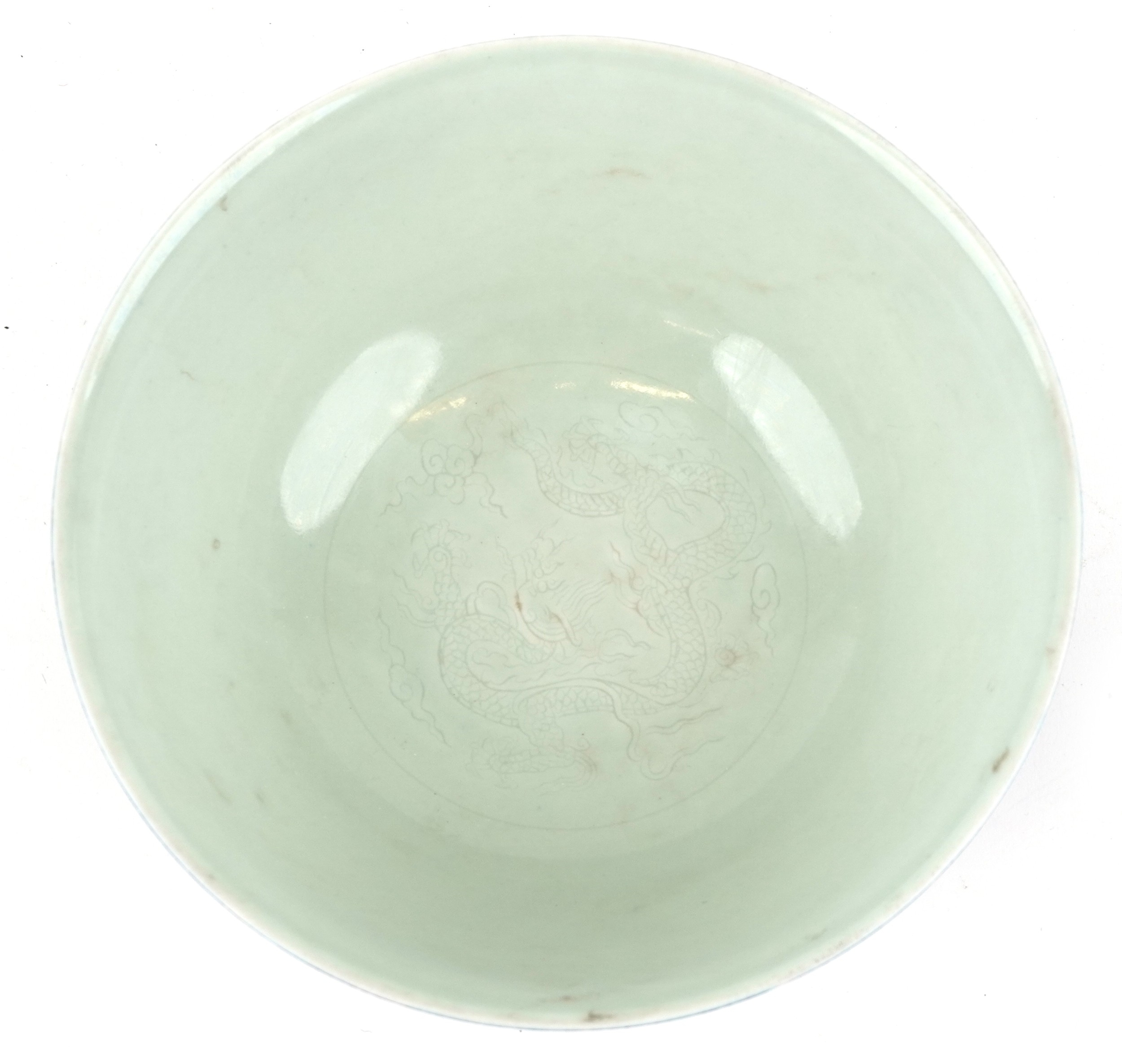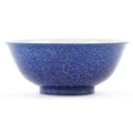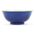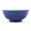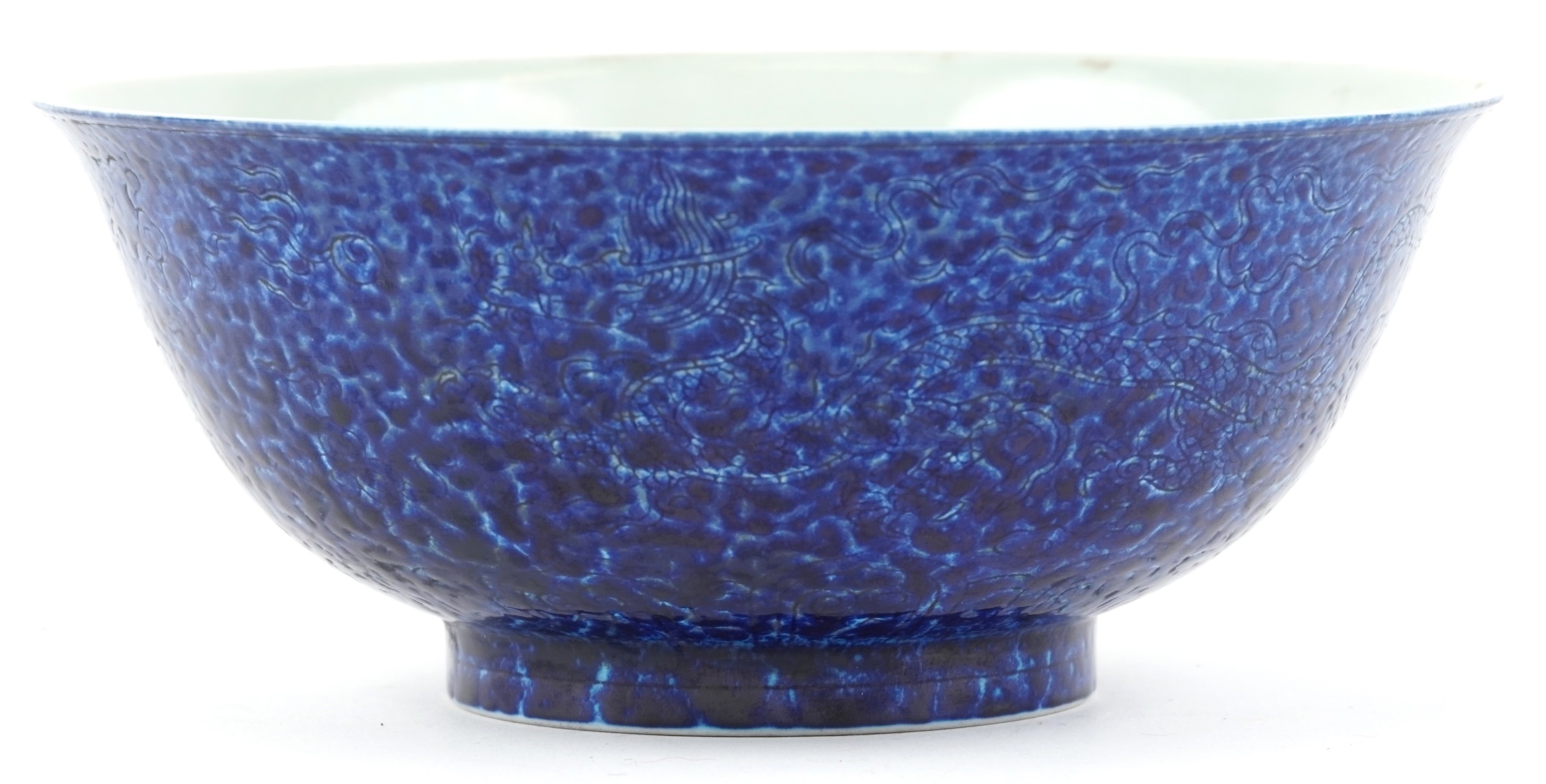 A Chinese porcelain bowl having a mottled blue glaze and hand painted dragons chasing a flaming pearl and incised dragon to the interior, bearing six figure character marks to the base, 8cm high x 21.5cm in diameter.