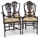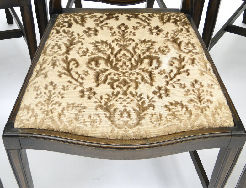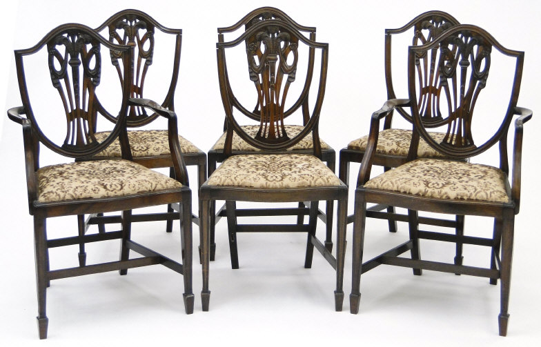 Set of six mahogany Hepplewhite design dining chairs, the shield shaped backs with Prince of Wales feather carved central splats, each with serpentine fronted drop in seat, to include two carvers, 97cm high