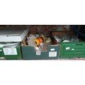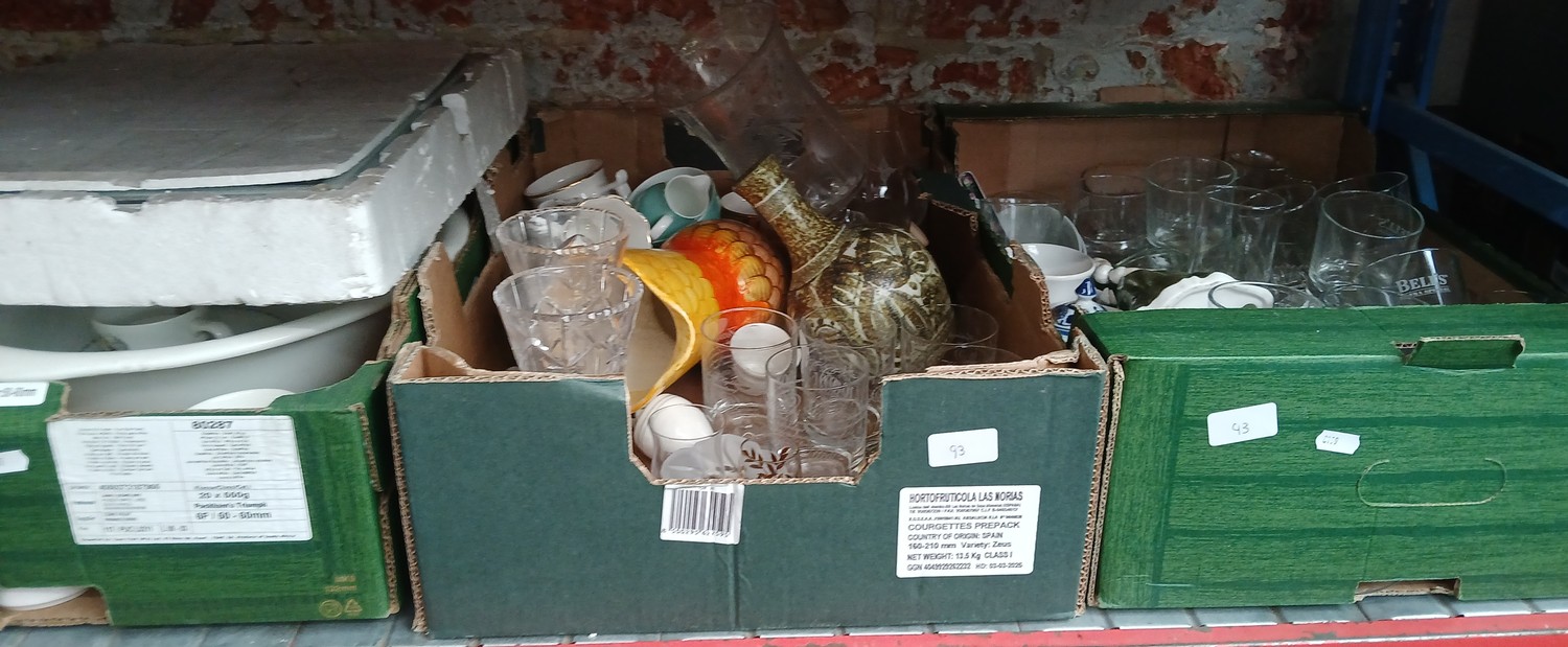 Three boxes of glass and pottery, Doulton figurine, Wedgewood Beatrix Potter pottery, glass chess board with shot glasses for chess pieces