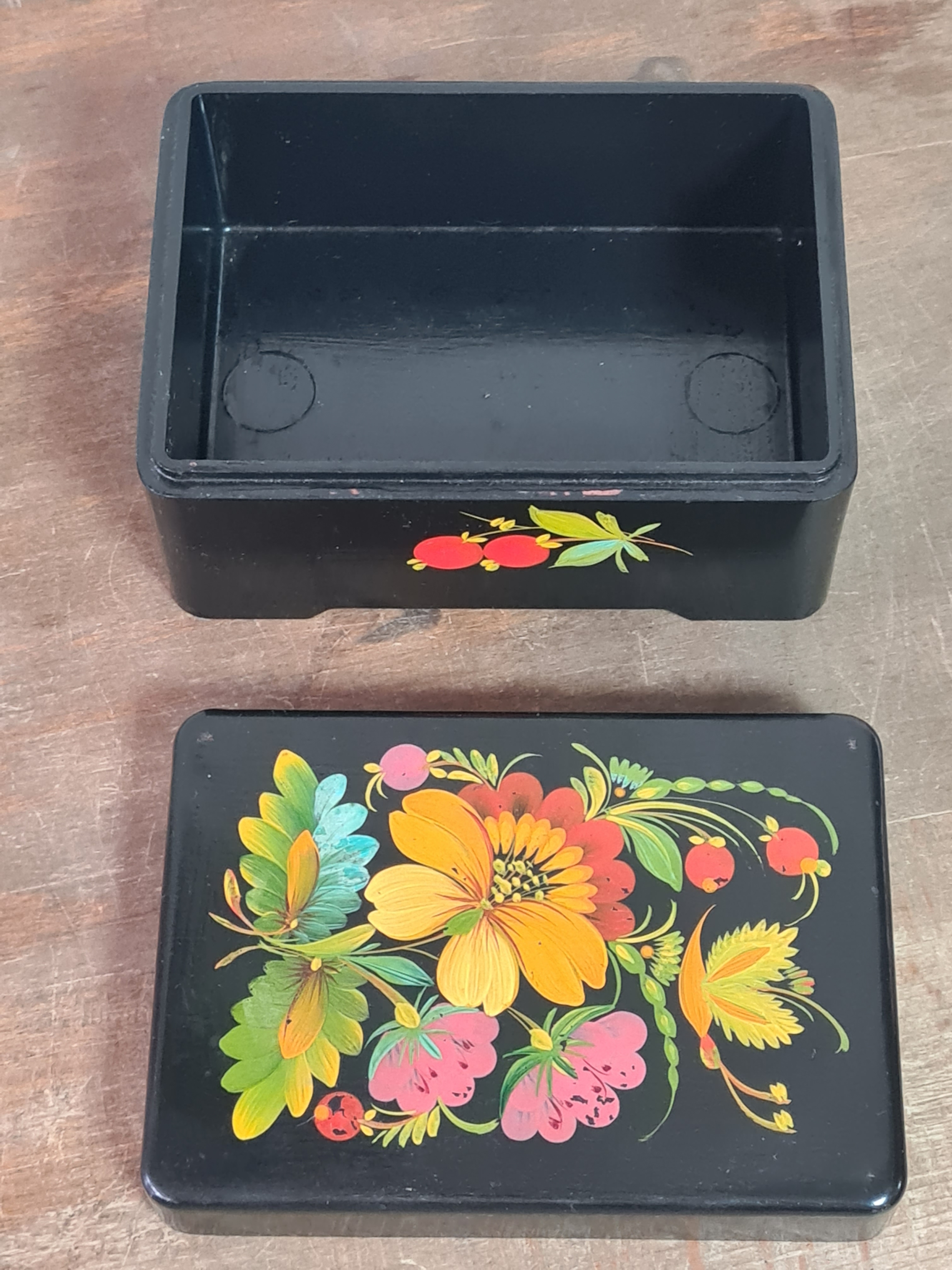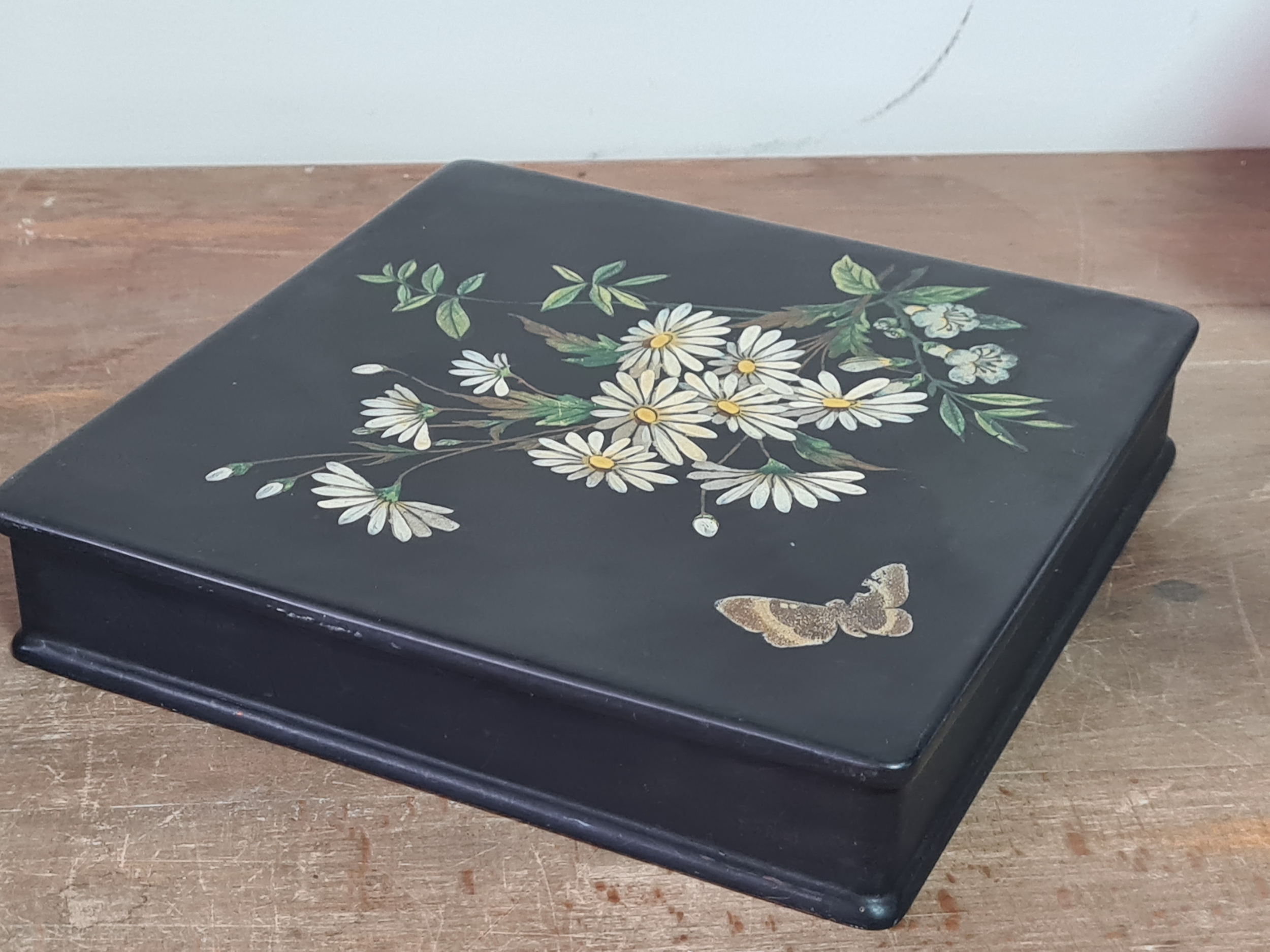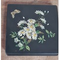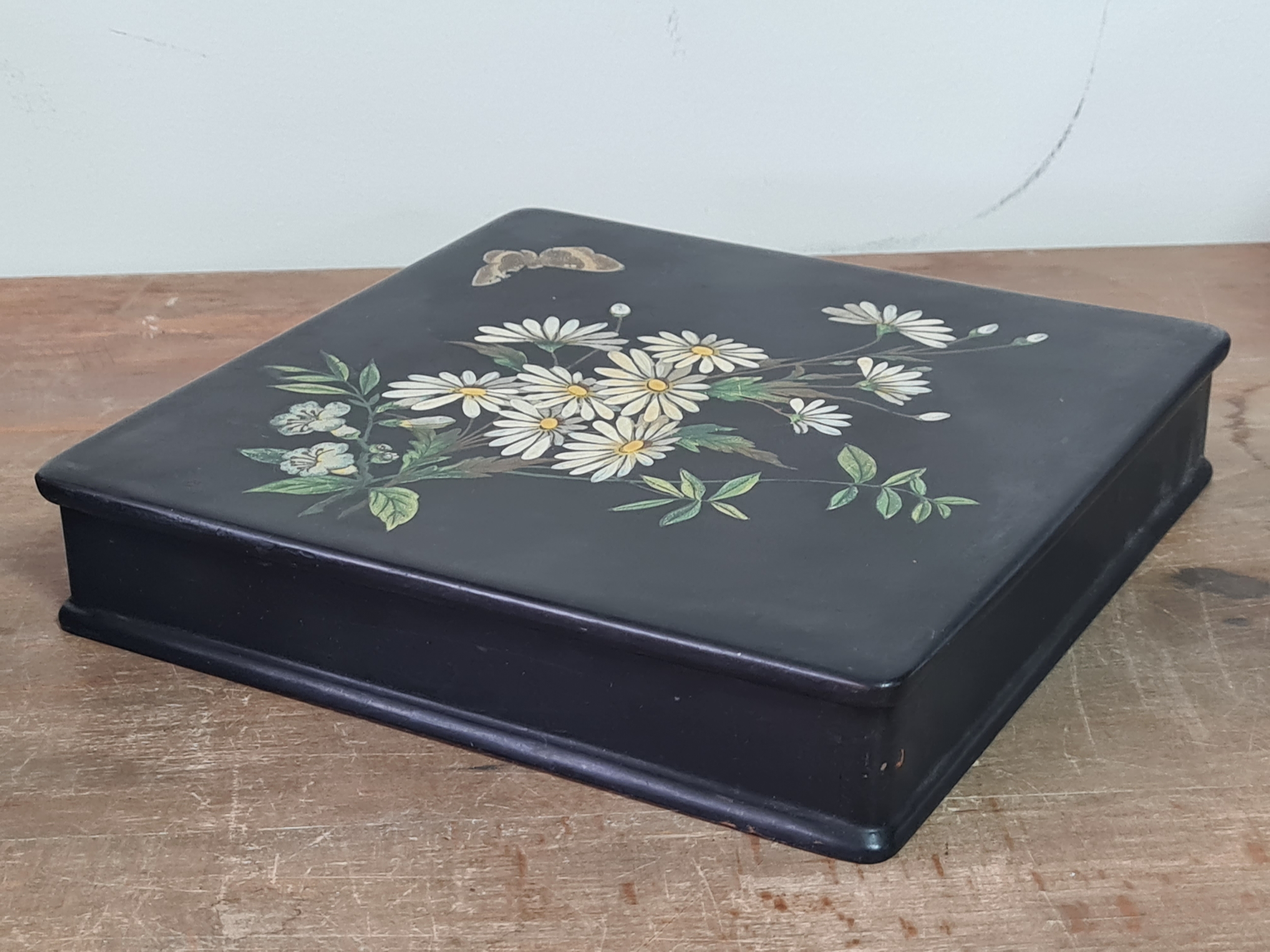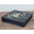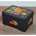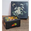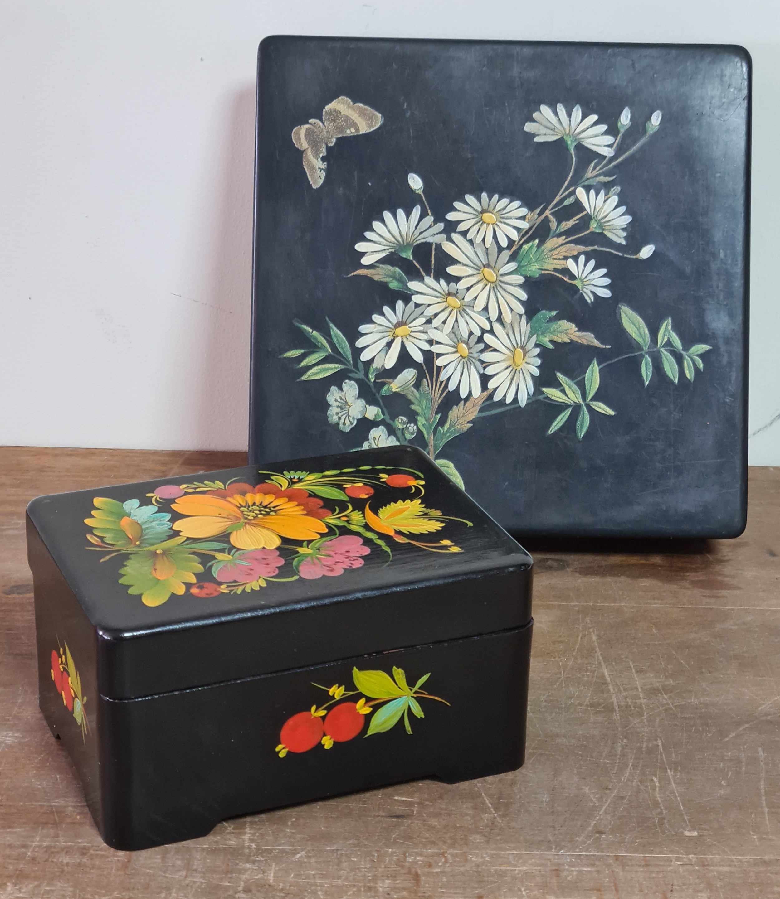 2 vintage black lacquered lidded boxes with hand painted floral designs, the square Victorian style one measures 19cm x19cm x3.5cm high and Eastern European style one measures 14cm x10cm x7.5cm high.