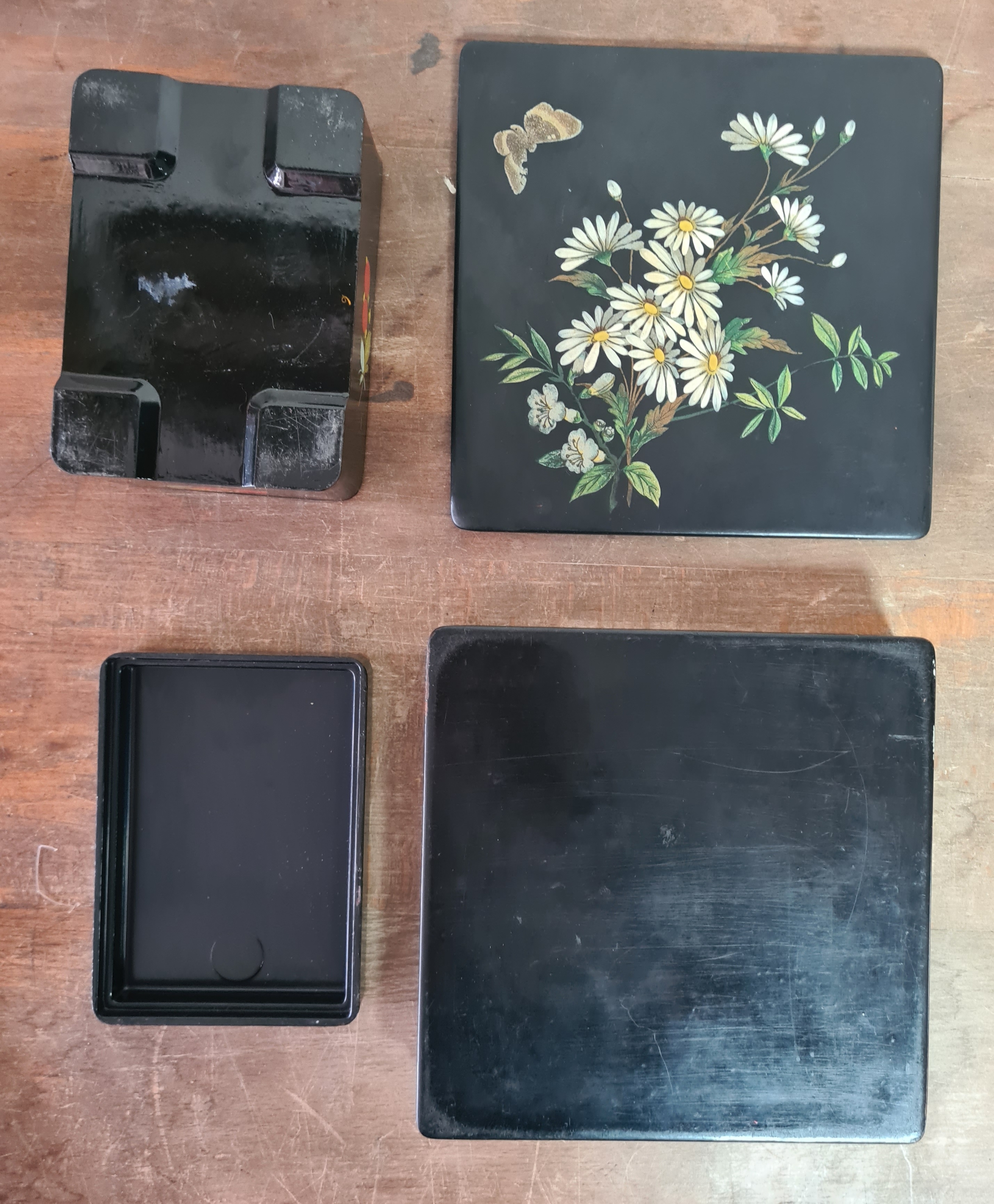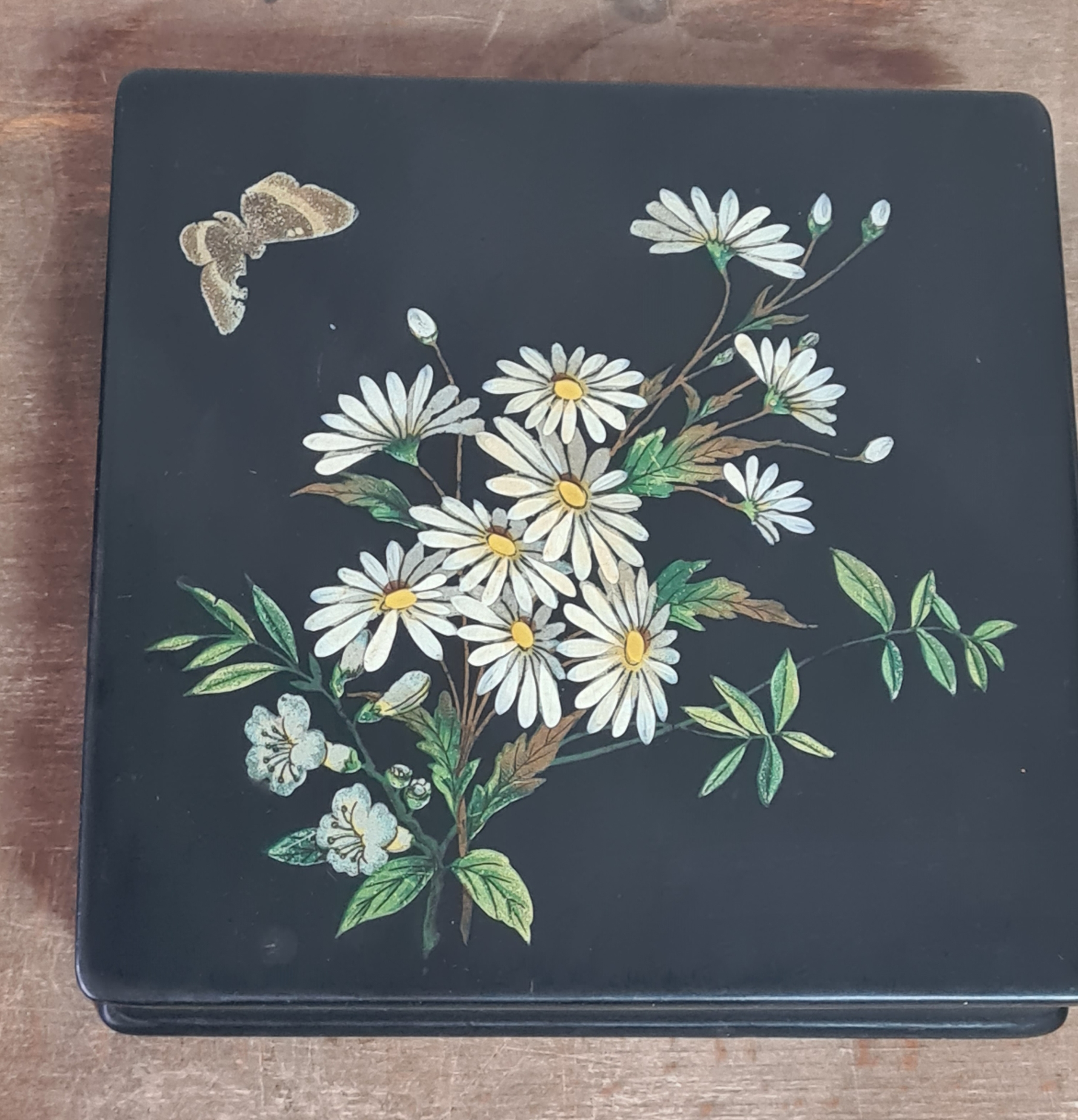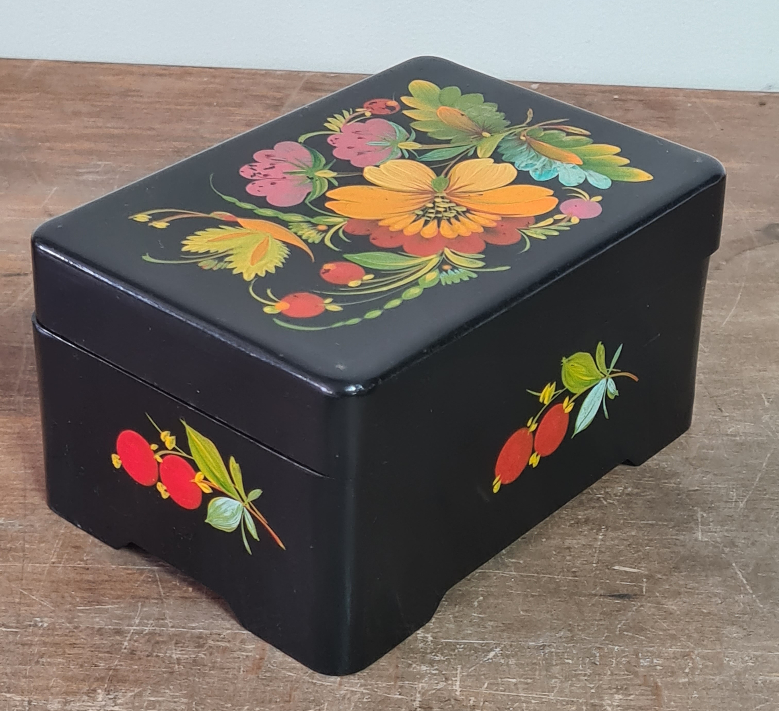 2 vintage black lacquered lidded boxes with hand painted floral designs, the square Victorian style one measures 19cm x19cm x3.5cm high and Eastern European style one measures 14cm x10cm x7.5cm high.