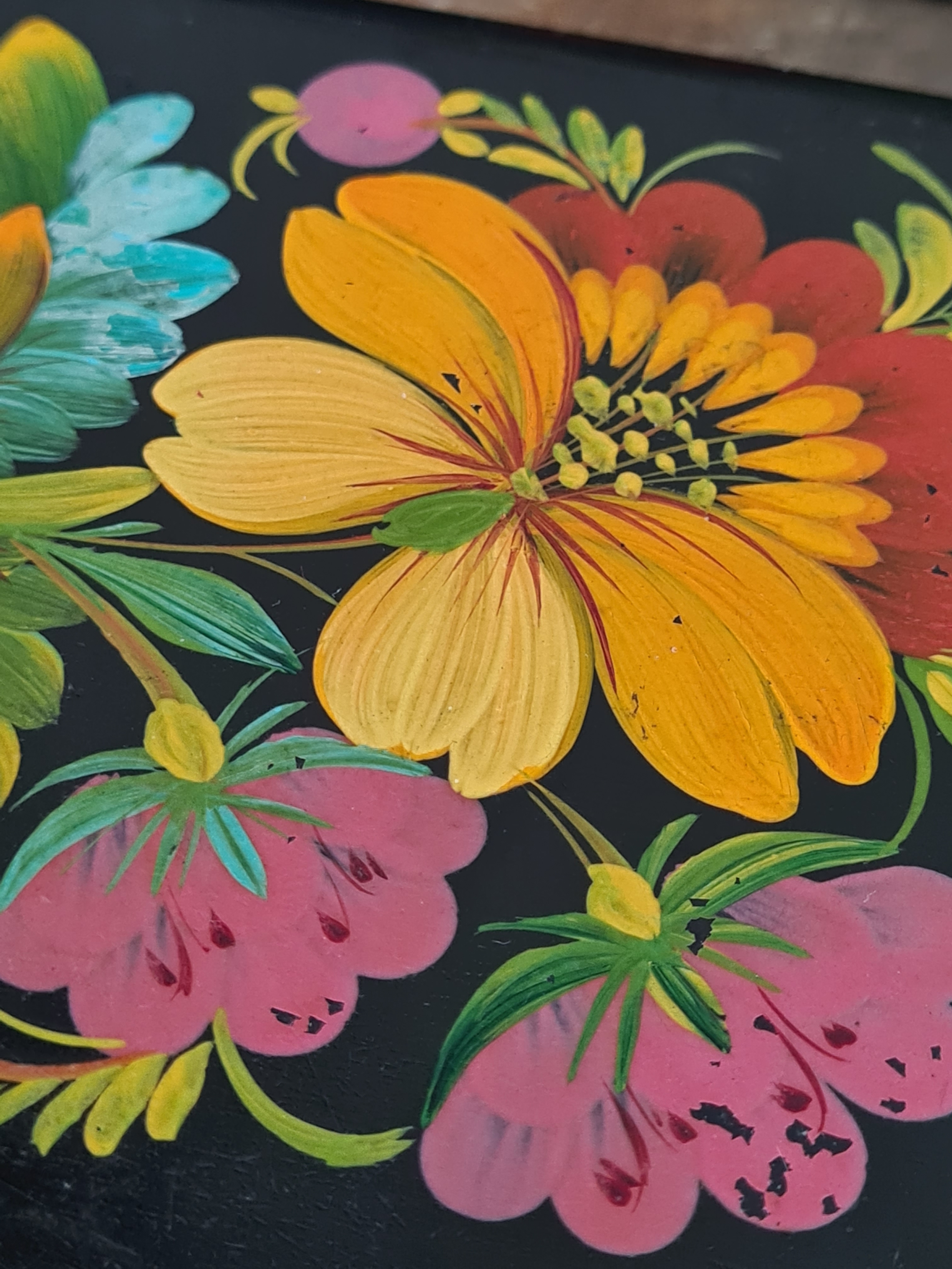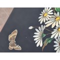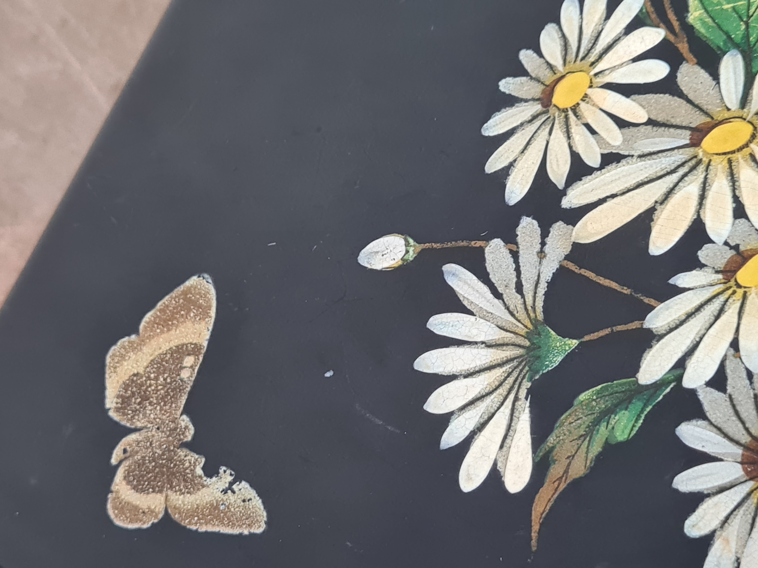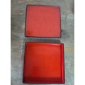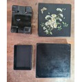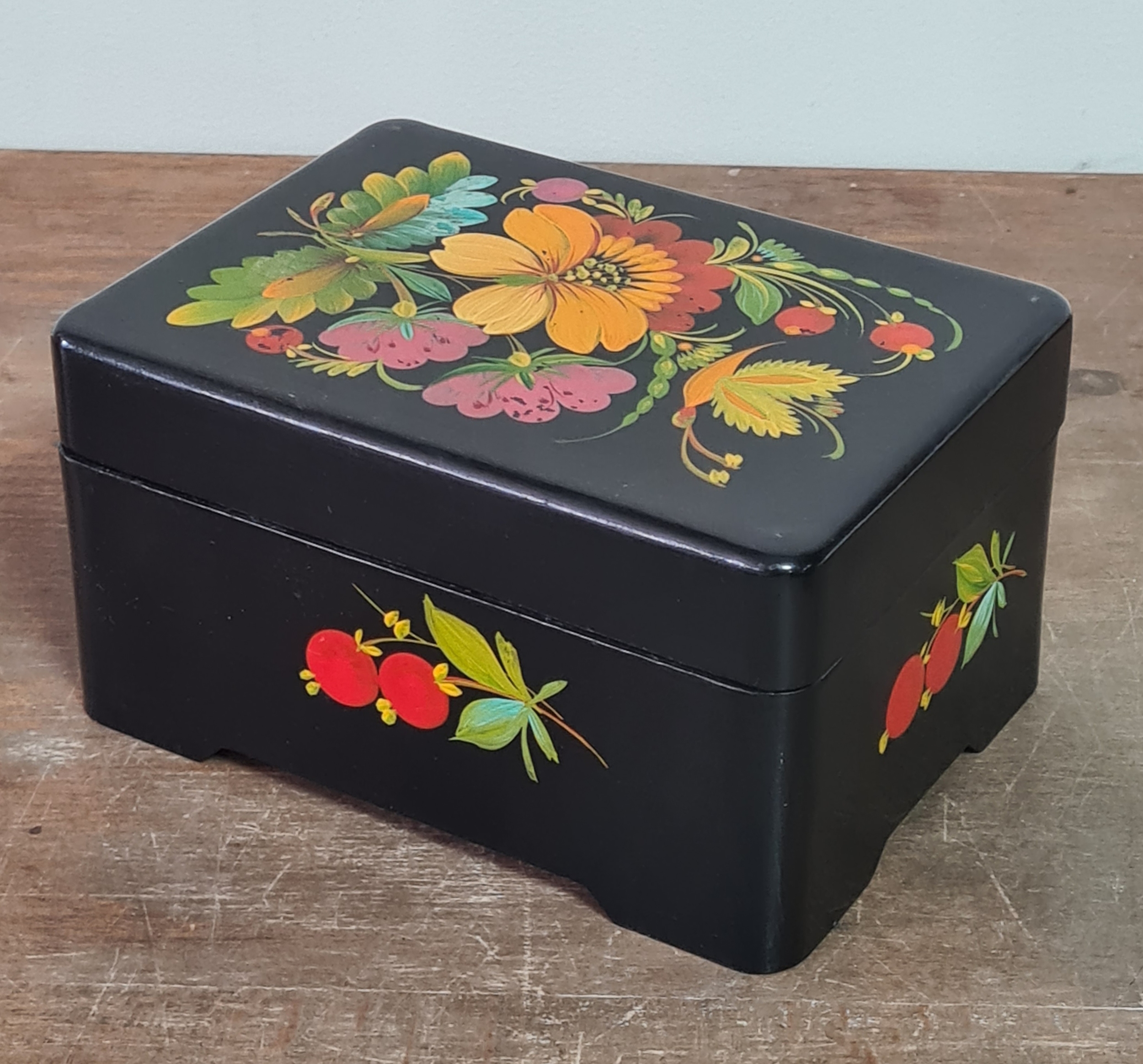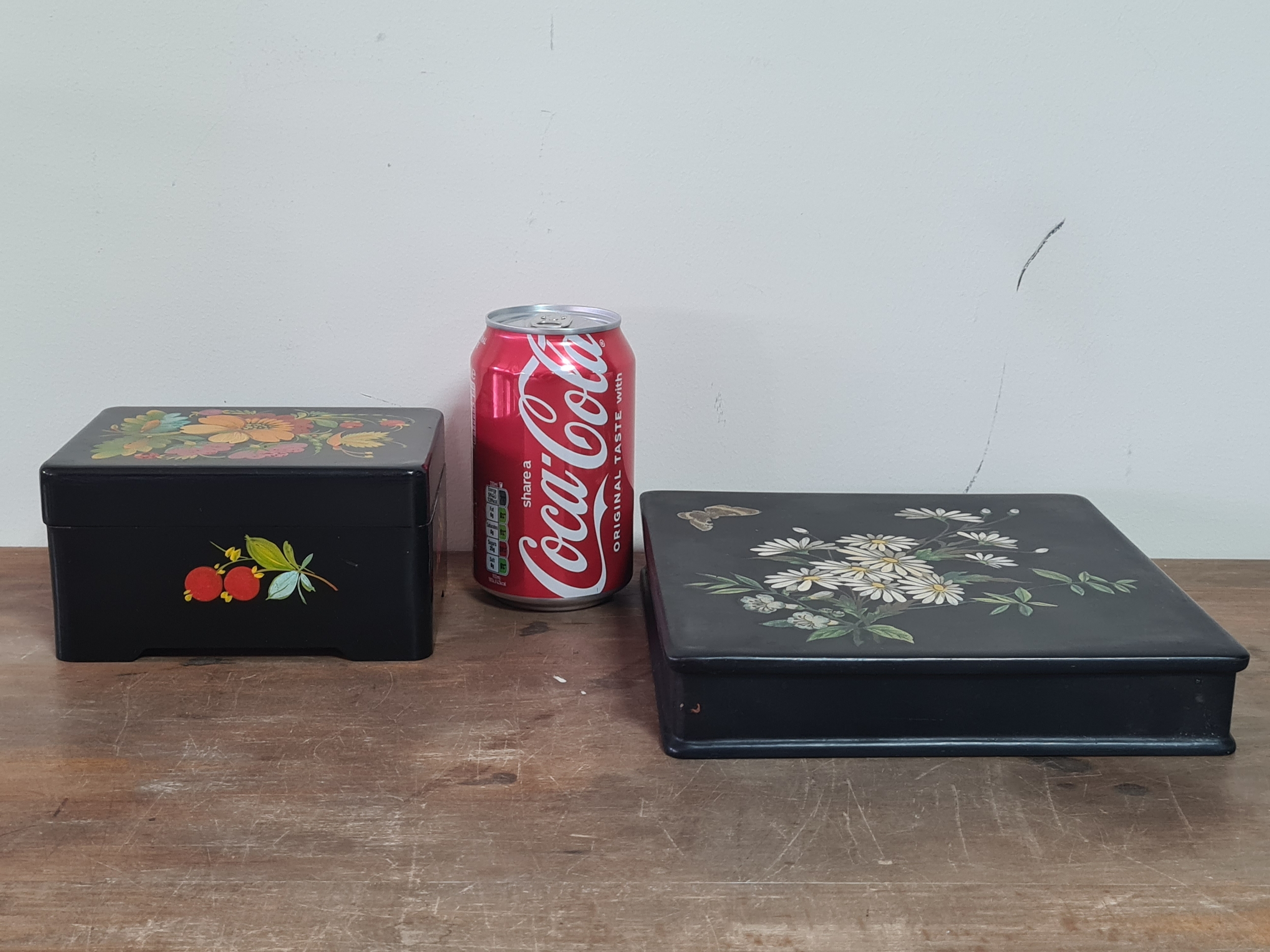 2 vintage black lacquered lidded boxes with hand painted floral designs, the square Victorian style one measures 19cm x19cm x3.5cm high and Eastern European style one measures 14cm x10cm x7.5cm high.