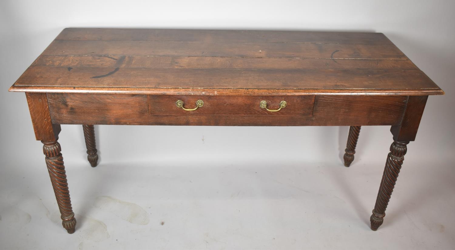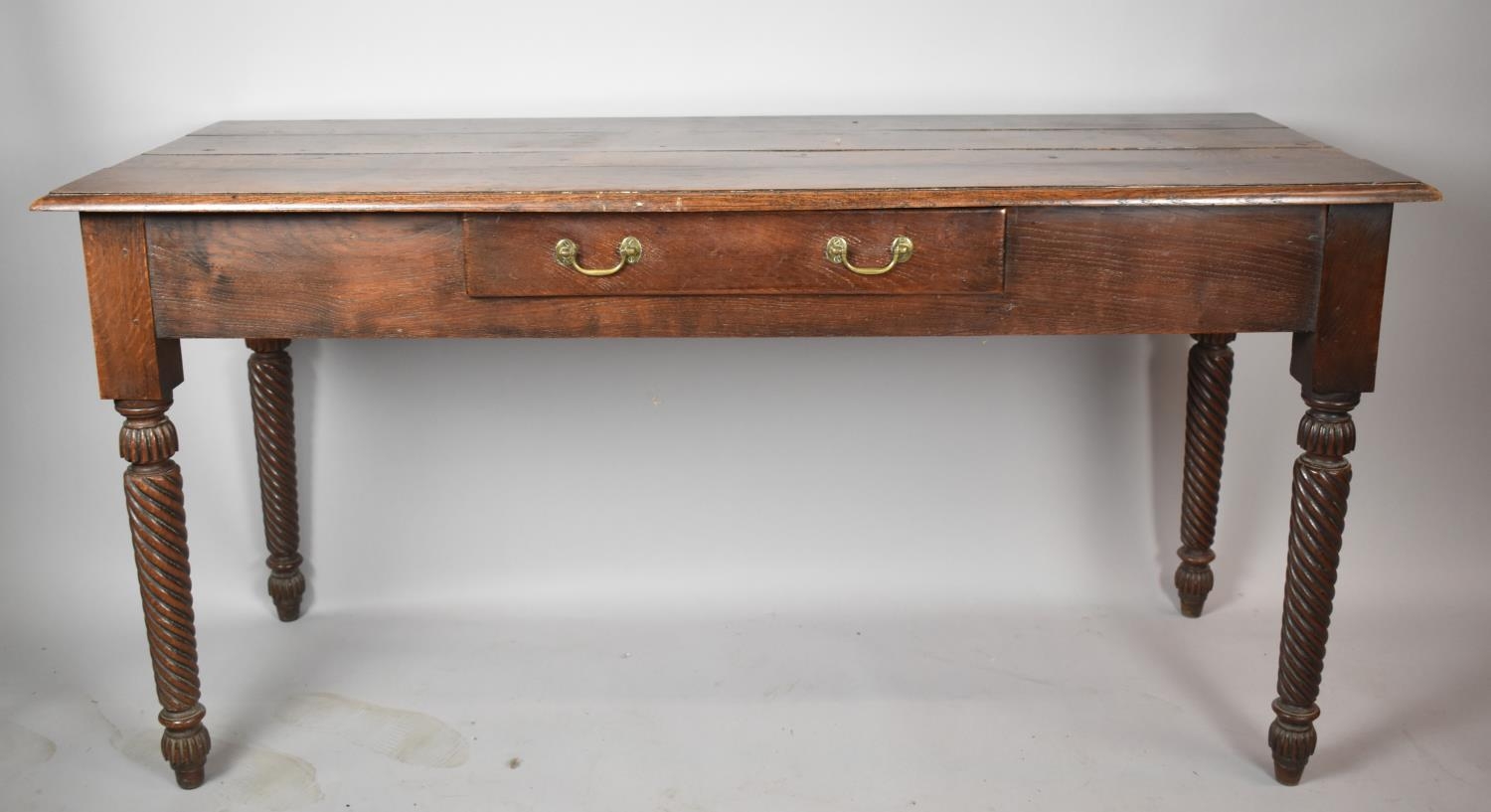 A 19th Century Oak Serving Table with Three Planked Top, Centre Drawer and Turred Spiral Supports, 151cm wide