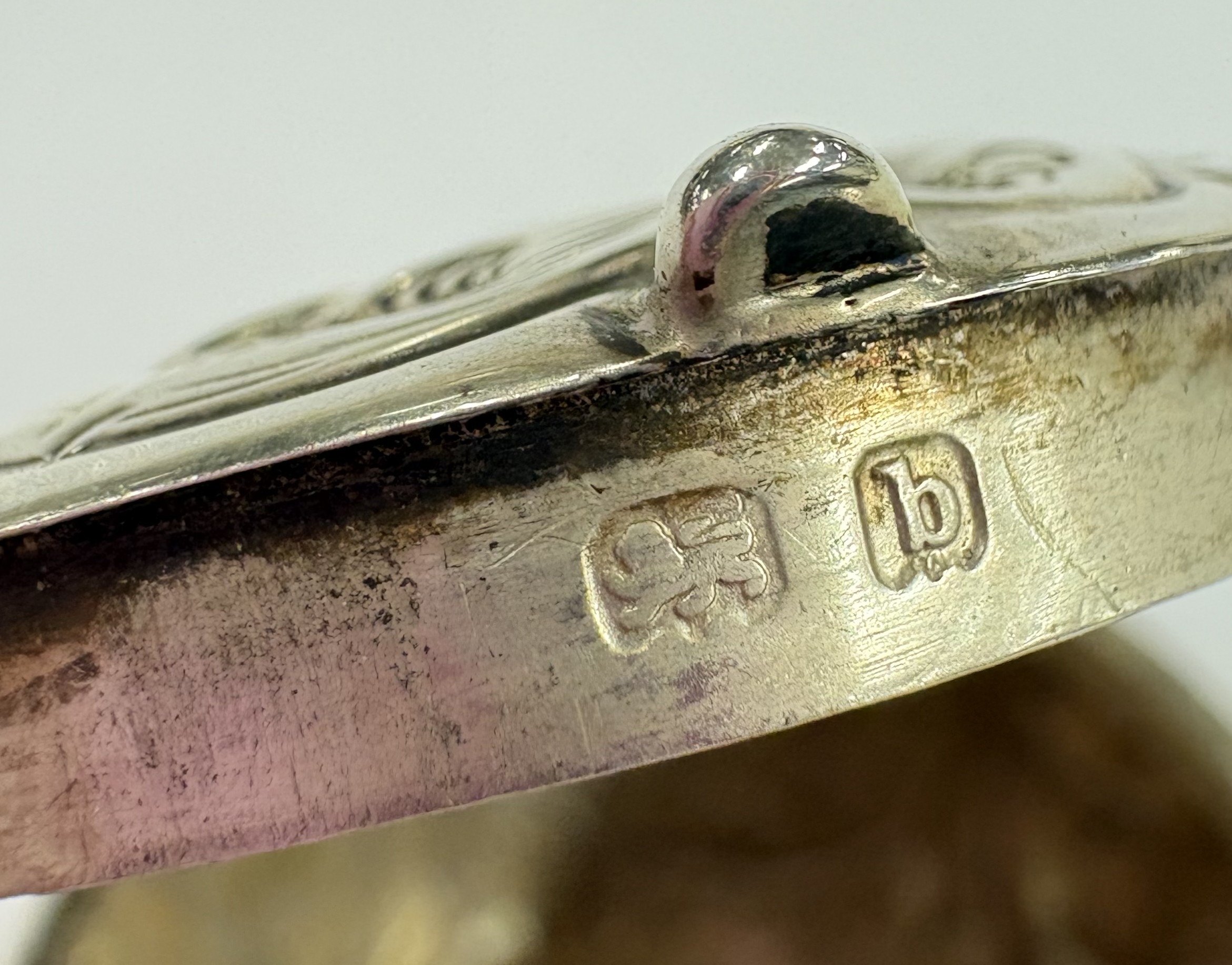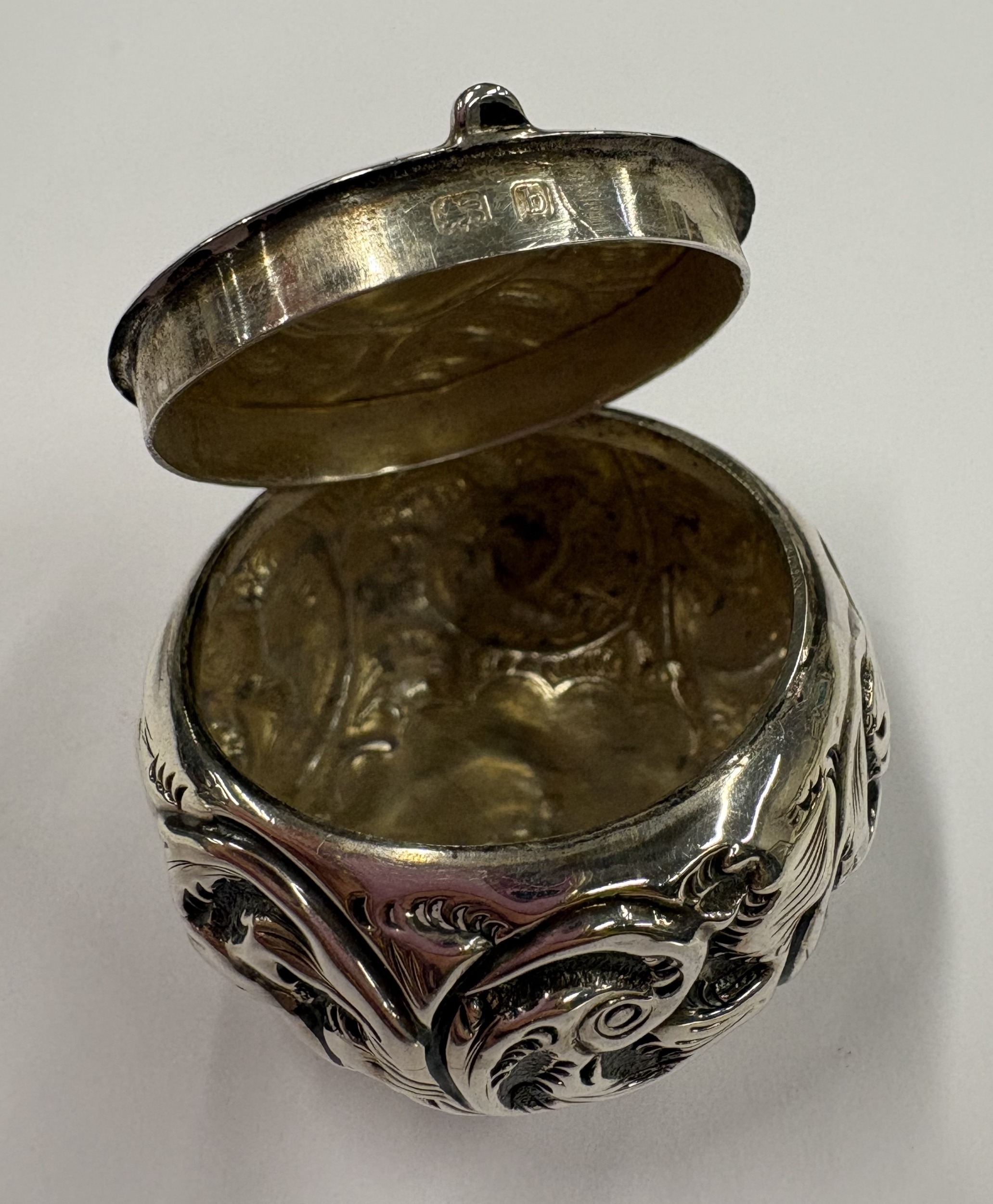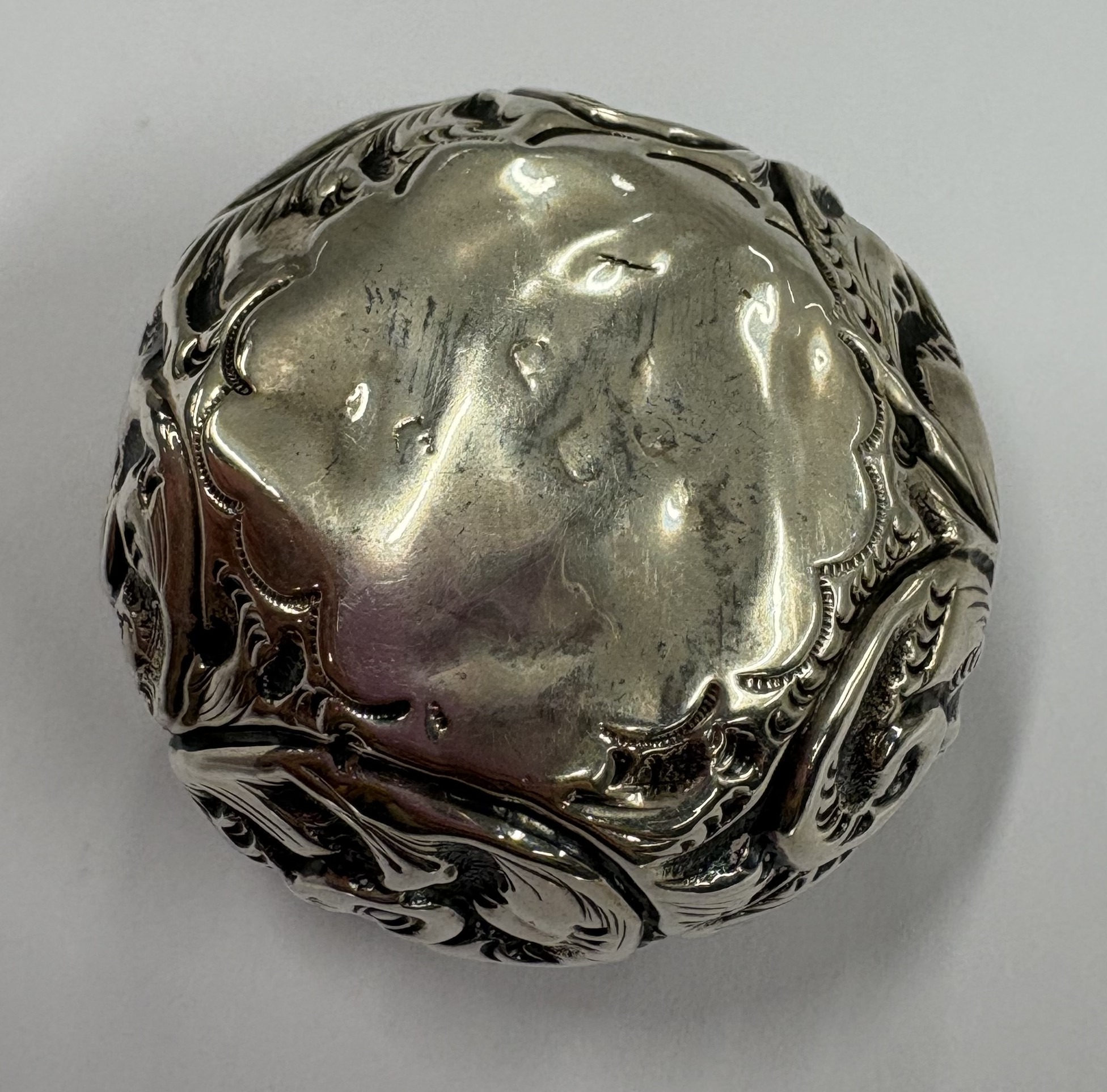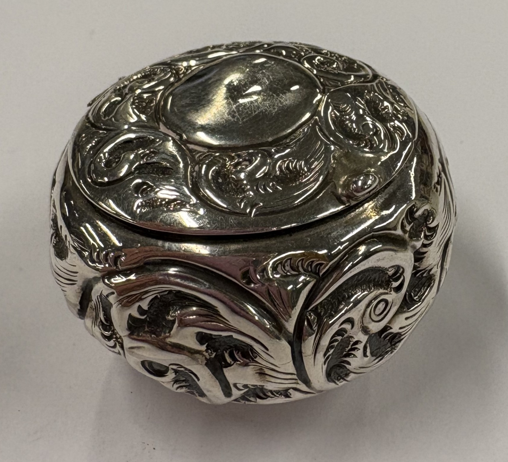 An embossed silver pill box with hinged cover. Birmingham 1901. Approx. 13 grams. Est. £20 - £30.