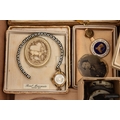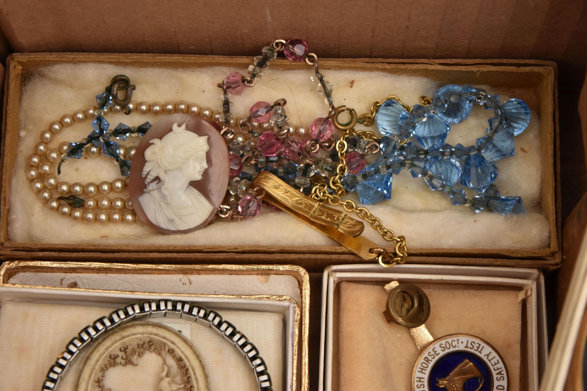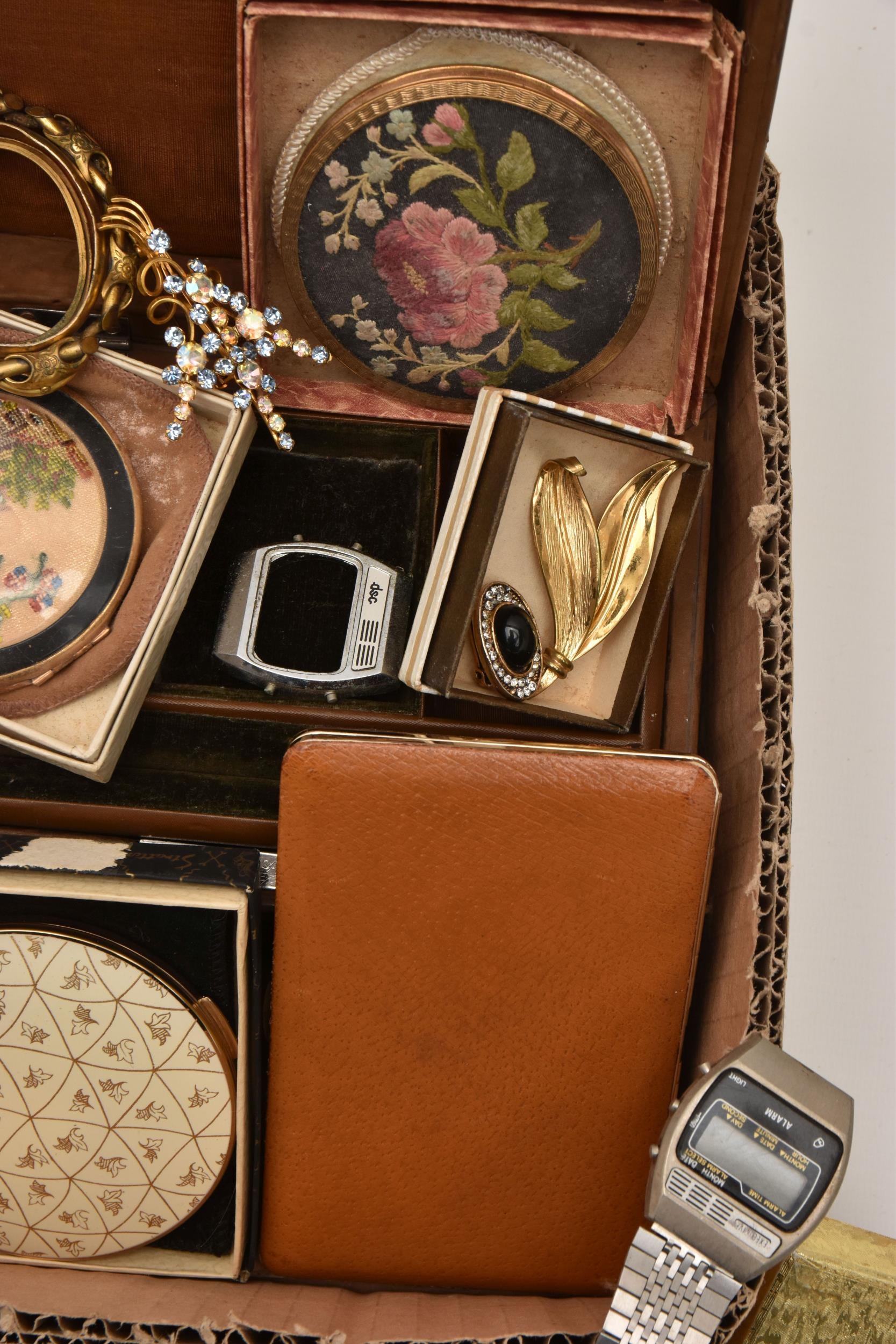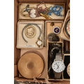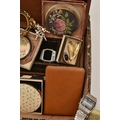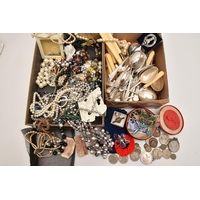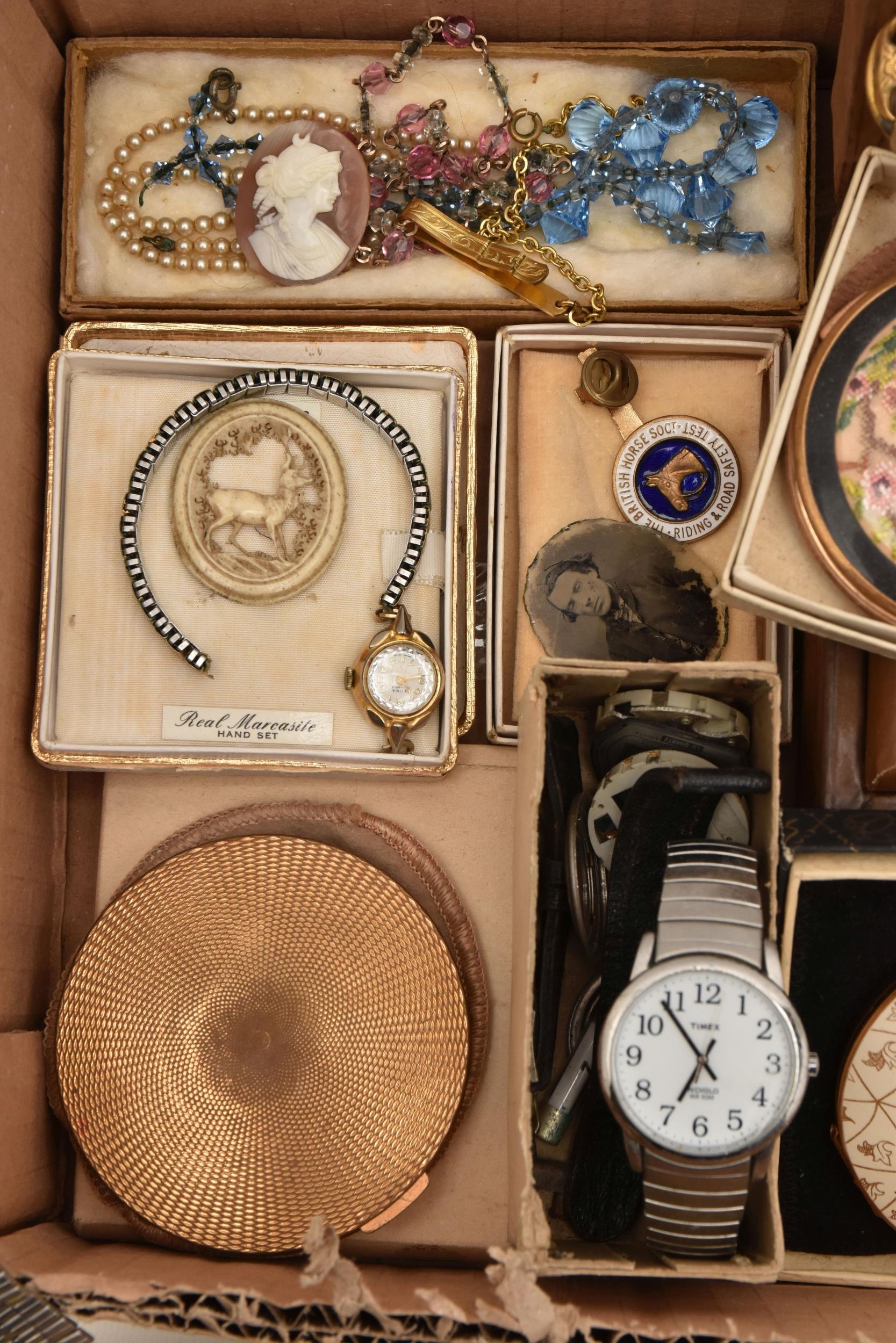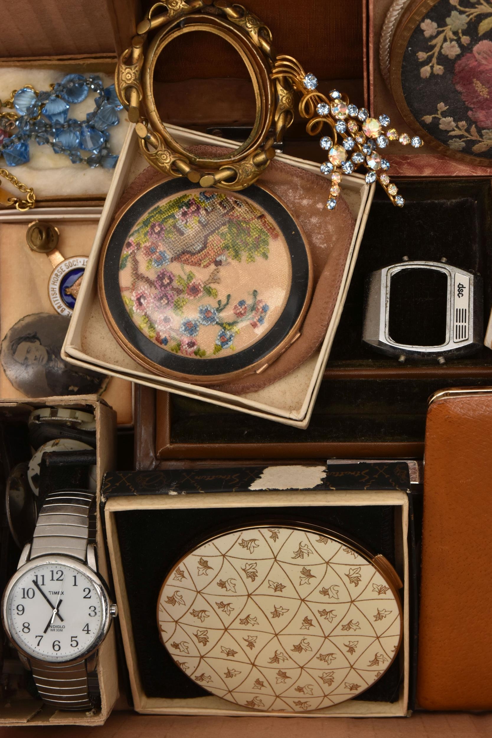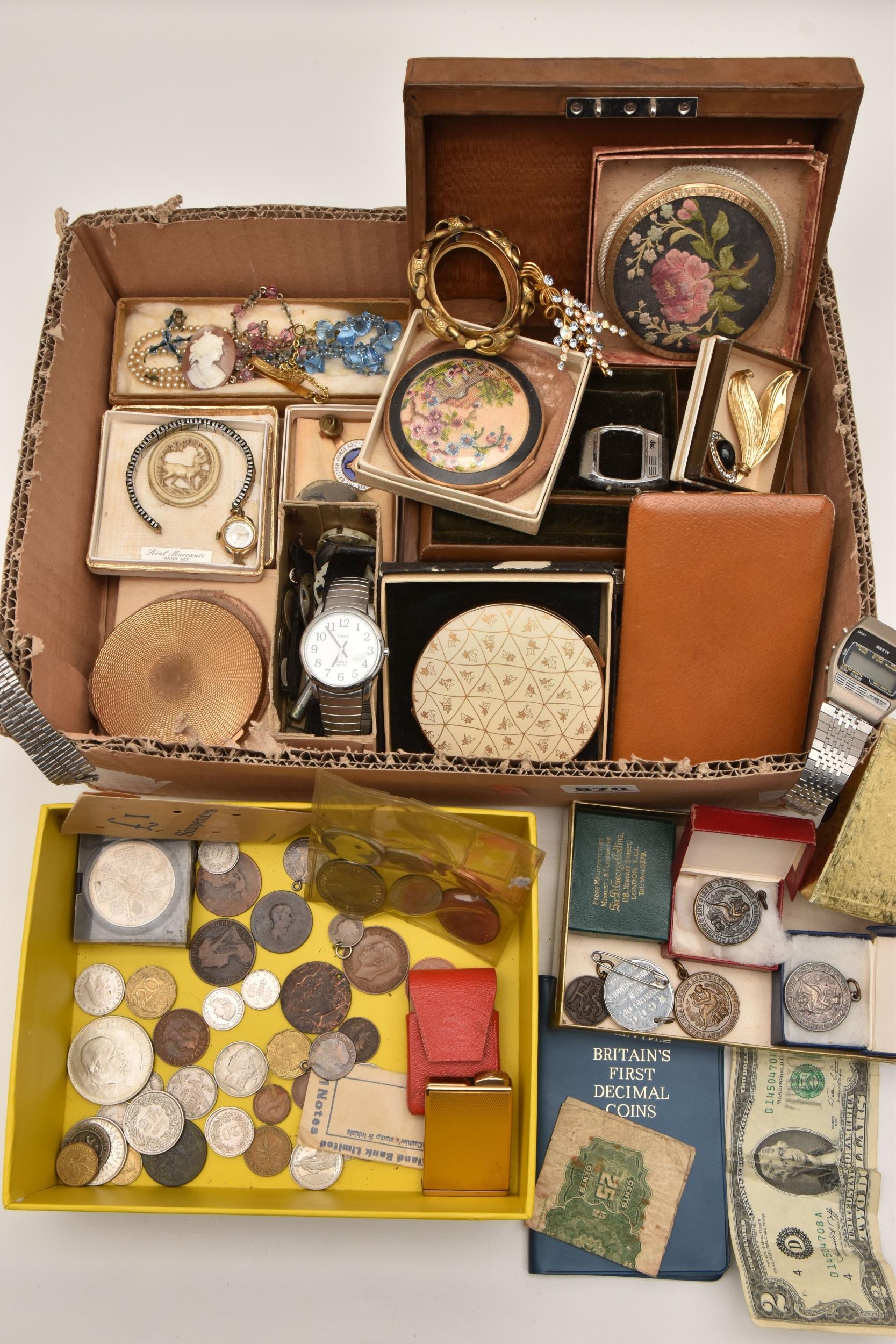A BOX OF ASSORTED COSTUME JEWELLERY, COMPACTS ETC, to include a light brown jewellery box, beaded necklaces, brooches, imitation pearl necklace, a gents 'Timex' wristwatch, 'Stratton' compacts, medals and assorted coins and commemoratives, a gold plated 'Consul Amor' atomiser stamped 'W.Germany'