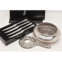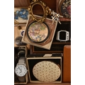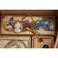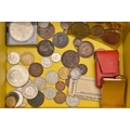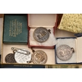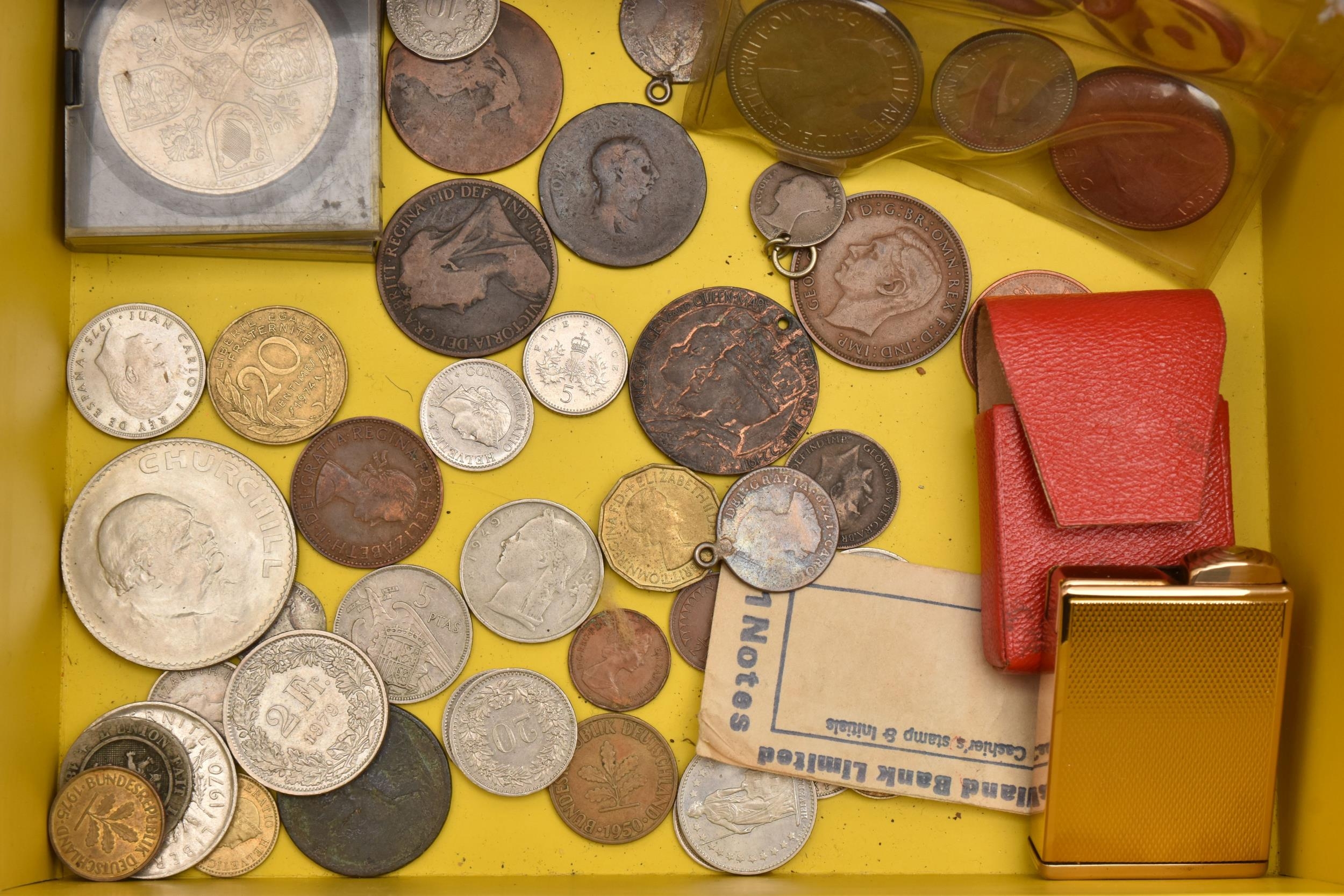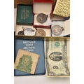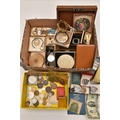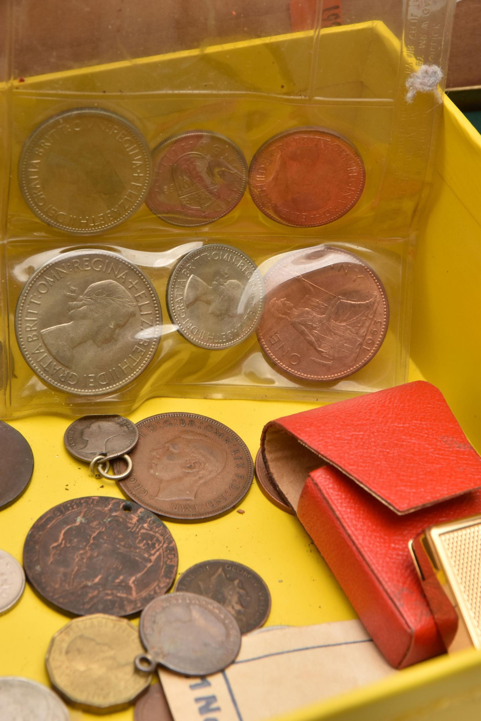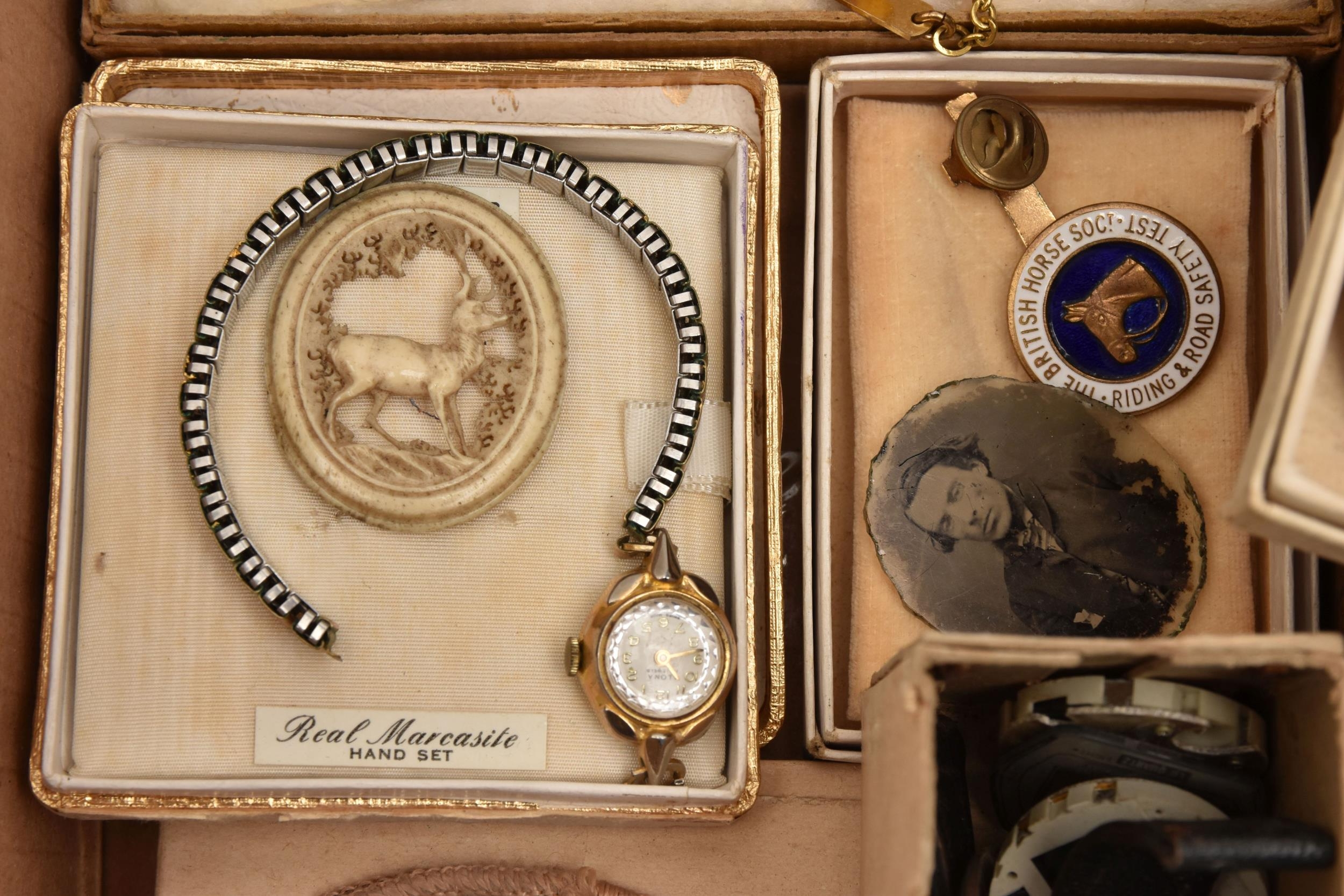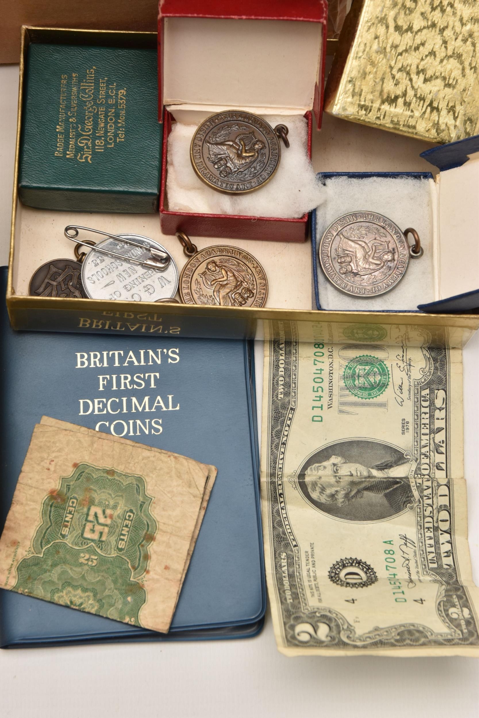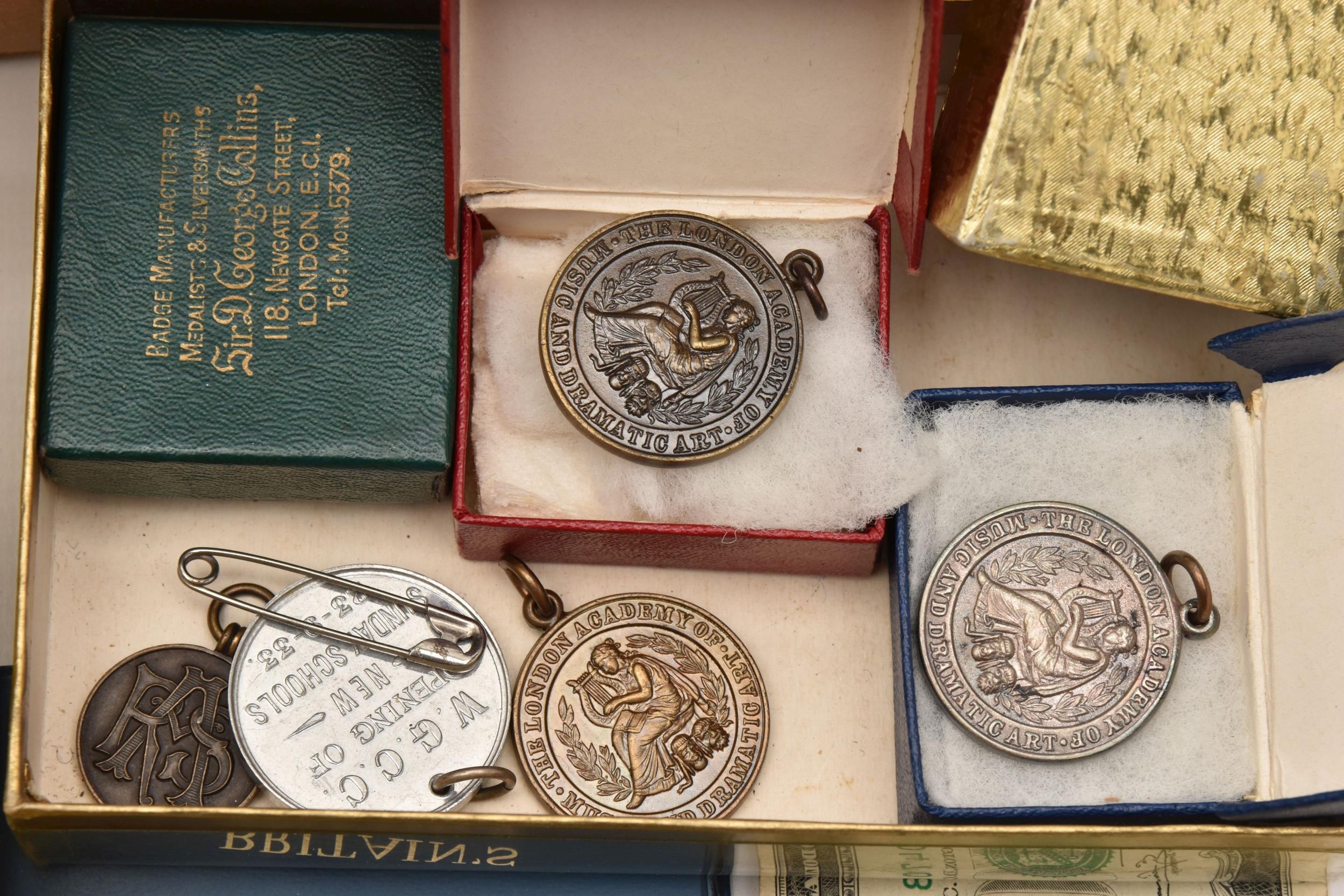 A BOX OF ASSORTED COSTUME JEWELLERY, COMPACTS ETC, to include a light brown jewellery box, beaded necklaces, brooches, imitation pearl necklace, a gents 'Timex' wristwatch, 'Stratton' compacts, medals and assorted coins and commemoratives, a gold plated 'Consul Amor' atomiser stamped 'W.Germany'