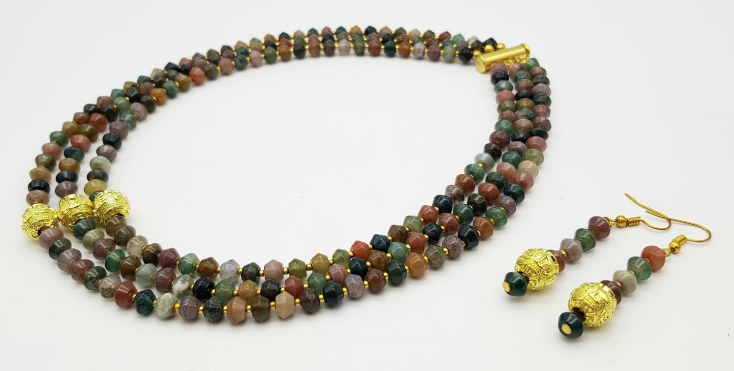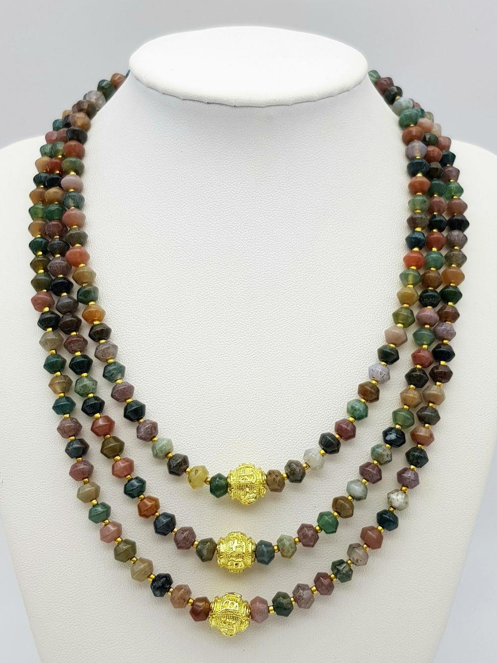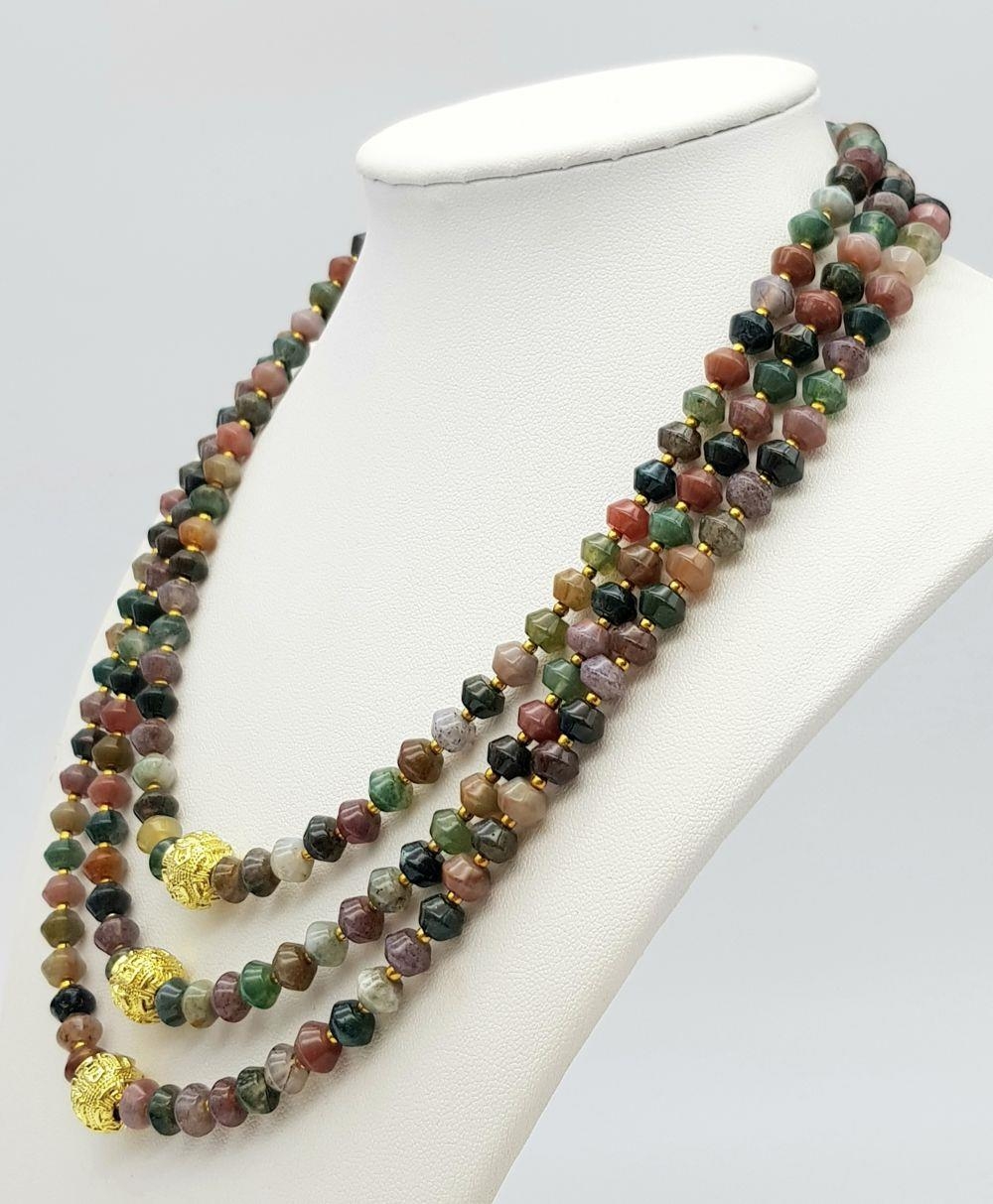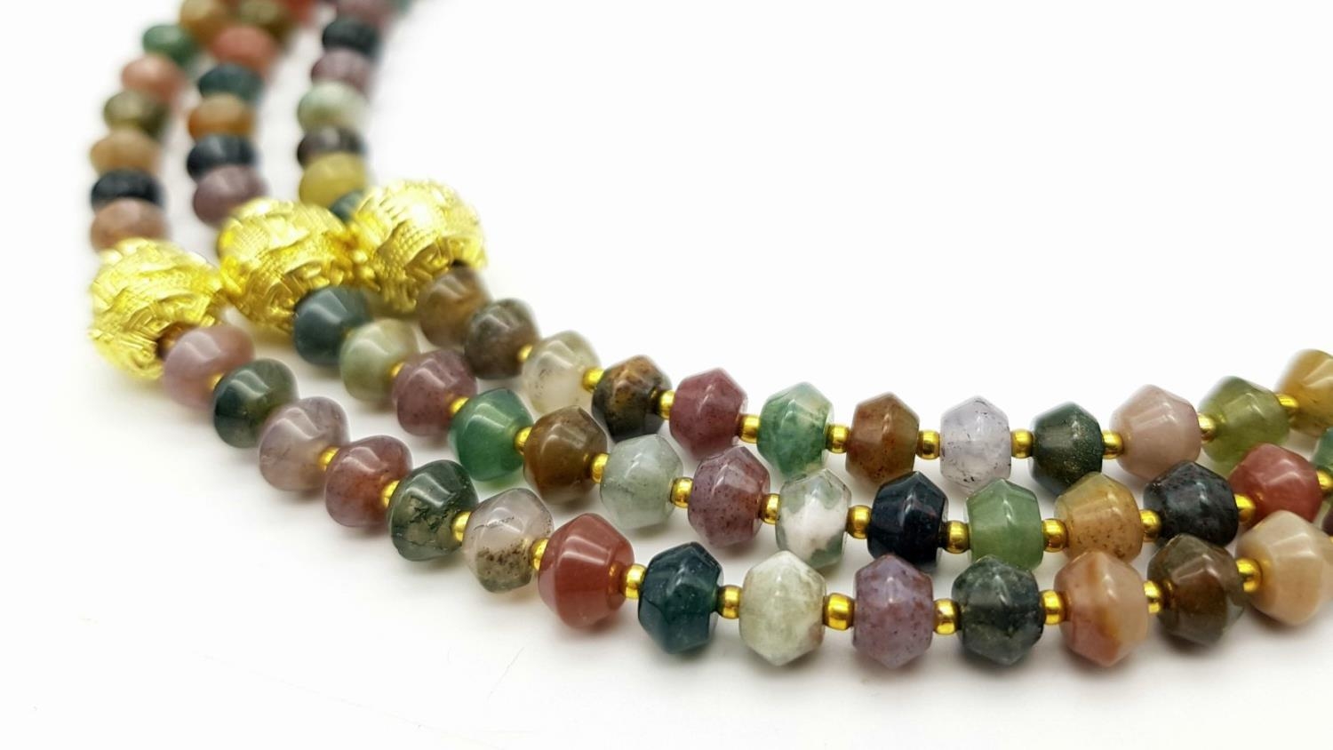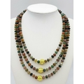 A fascinating three strand necklace with multi-coloured, faceted, round Malaysian Jade beads with gold plated