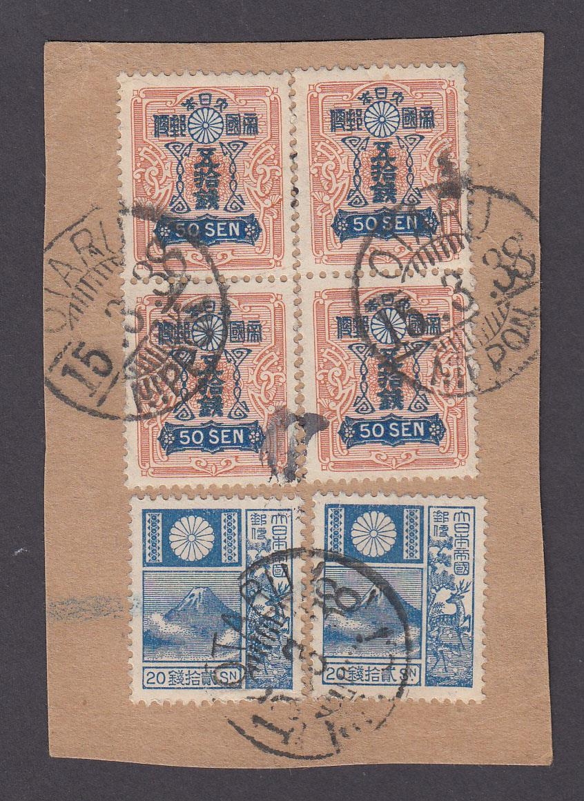 1914 50s x4 fine used on piece plus x2 20s 1937 used, unusual combination