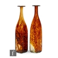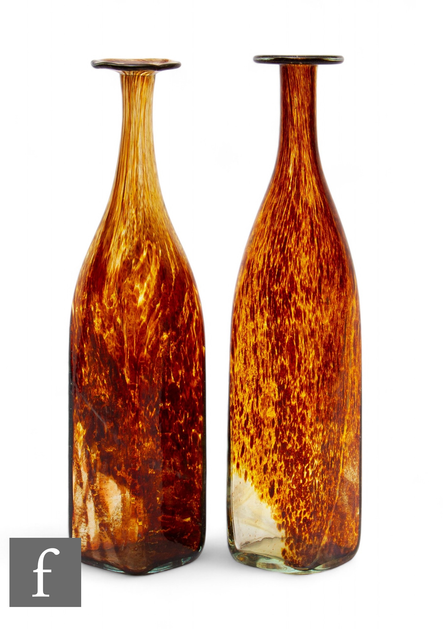Mdina - A later 20th Century glass tortoiseshell bottle vase, of square section, decorated with brown mottling and ochre trails, engraved signature, height 36cm, together with another unsigned example. (2)