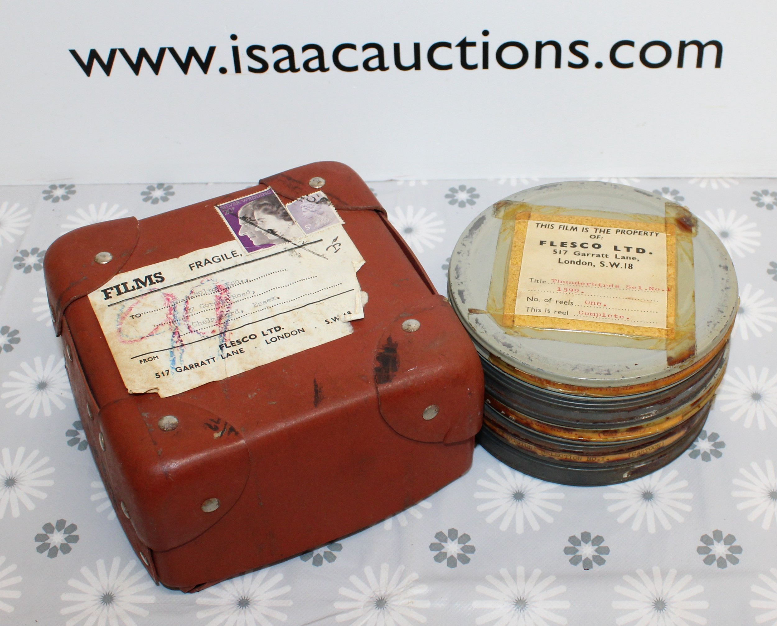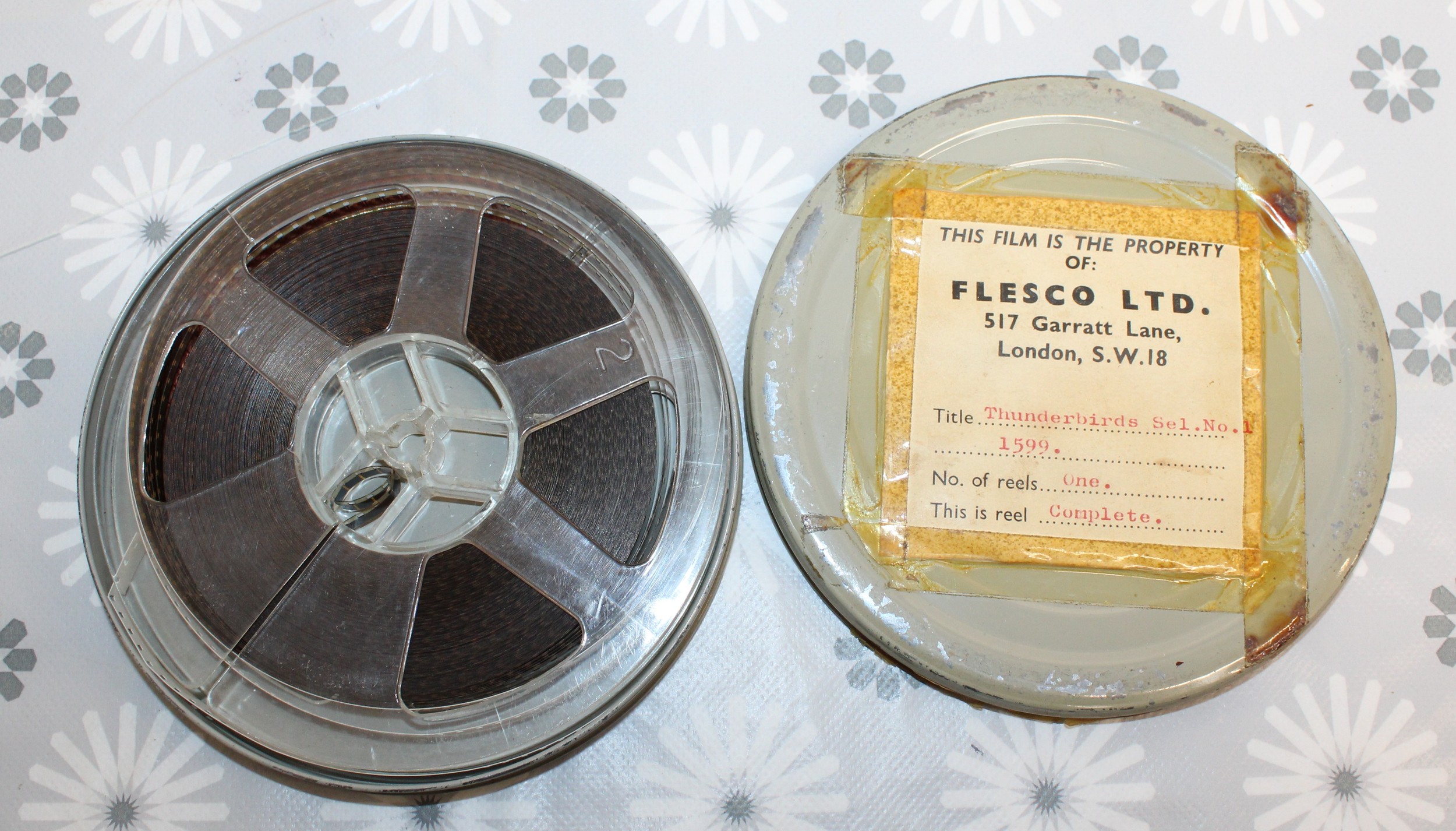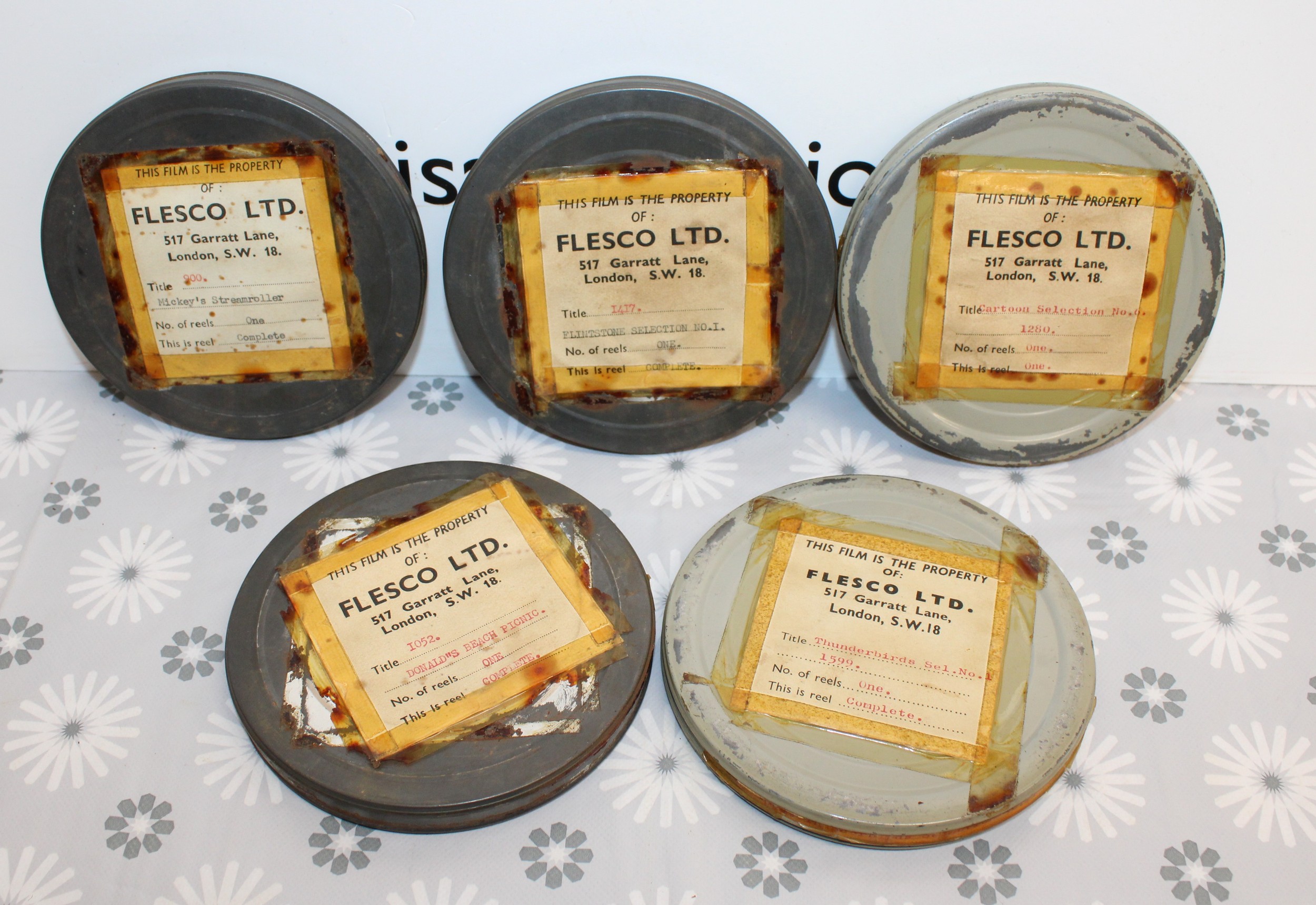 Five FLESCO FILM REELS INC-Thunderbirds Sel/.No.1 1599/DONALD''S BEACH PICINIC 1052. /Cartoon Selection No.6. 1280/FLINTSTONE SELECTION No. 1. 1417./Mickey's Streamroller 900 In Case All As Found