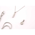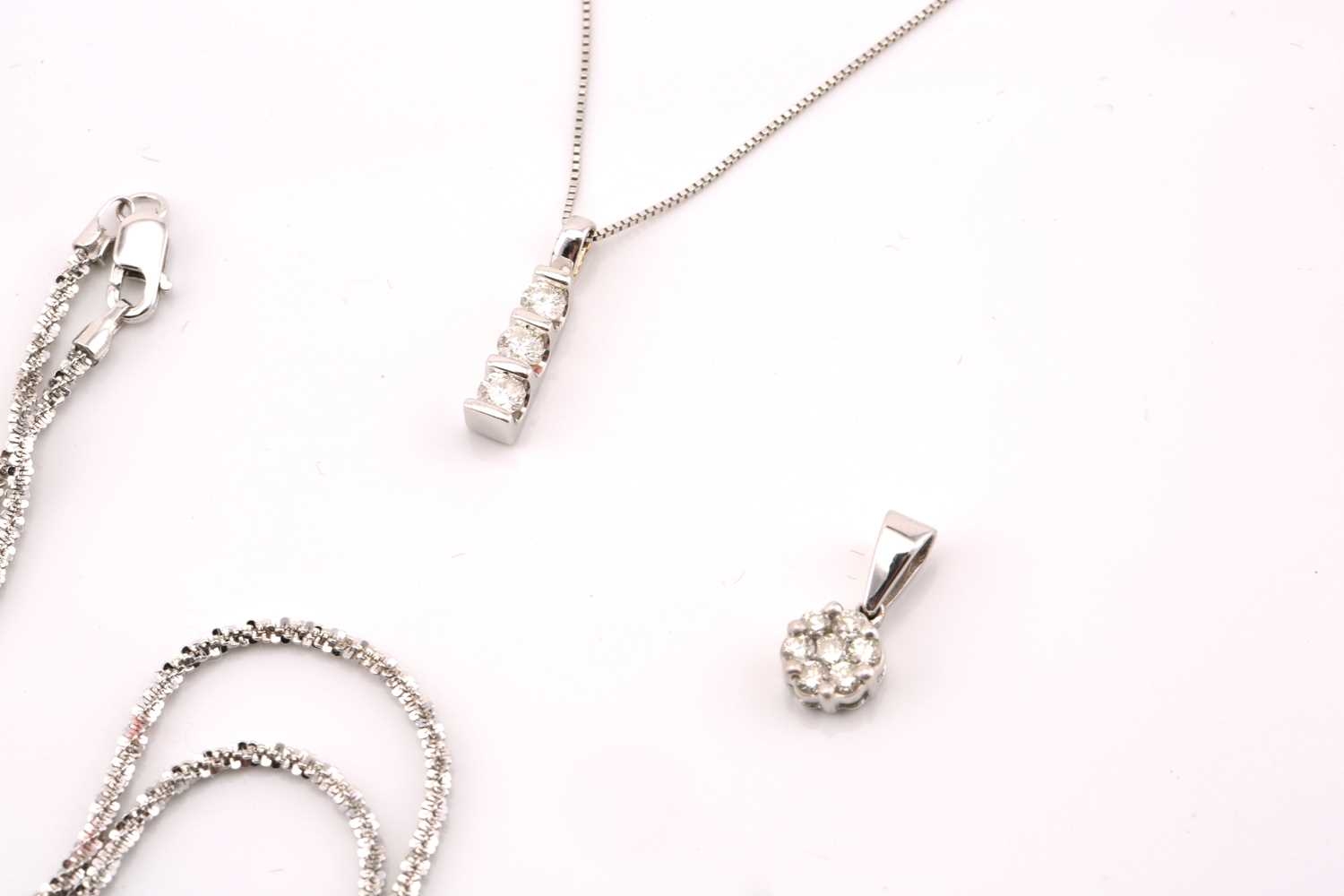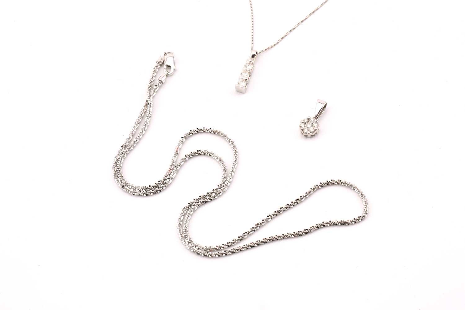 A lot consists of two diamond pendants and a chain, one comprises three graduated round diamonds with an estimated total weight of 0.21ct, bar set on a 9ct white gold mount, on a fine box chain, Birmingham hallmarked '375', chain measuring 46.0 cm long, pendant overall measuring 1.5 x 0.3 cm; another includes a diamond cluster with an estimated total weight of 0.14ct, claw set on a 9ct white gold flower head mount, to a bail, Birmingham hallmarked as '375', overall measurements 1.4 x 0.6 cm; One sparkle glitter chain measuring 39.5 cm, stamped as '750'. Total weight of items 6.7 grams (3).