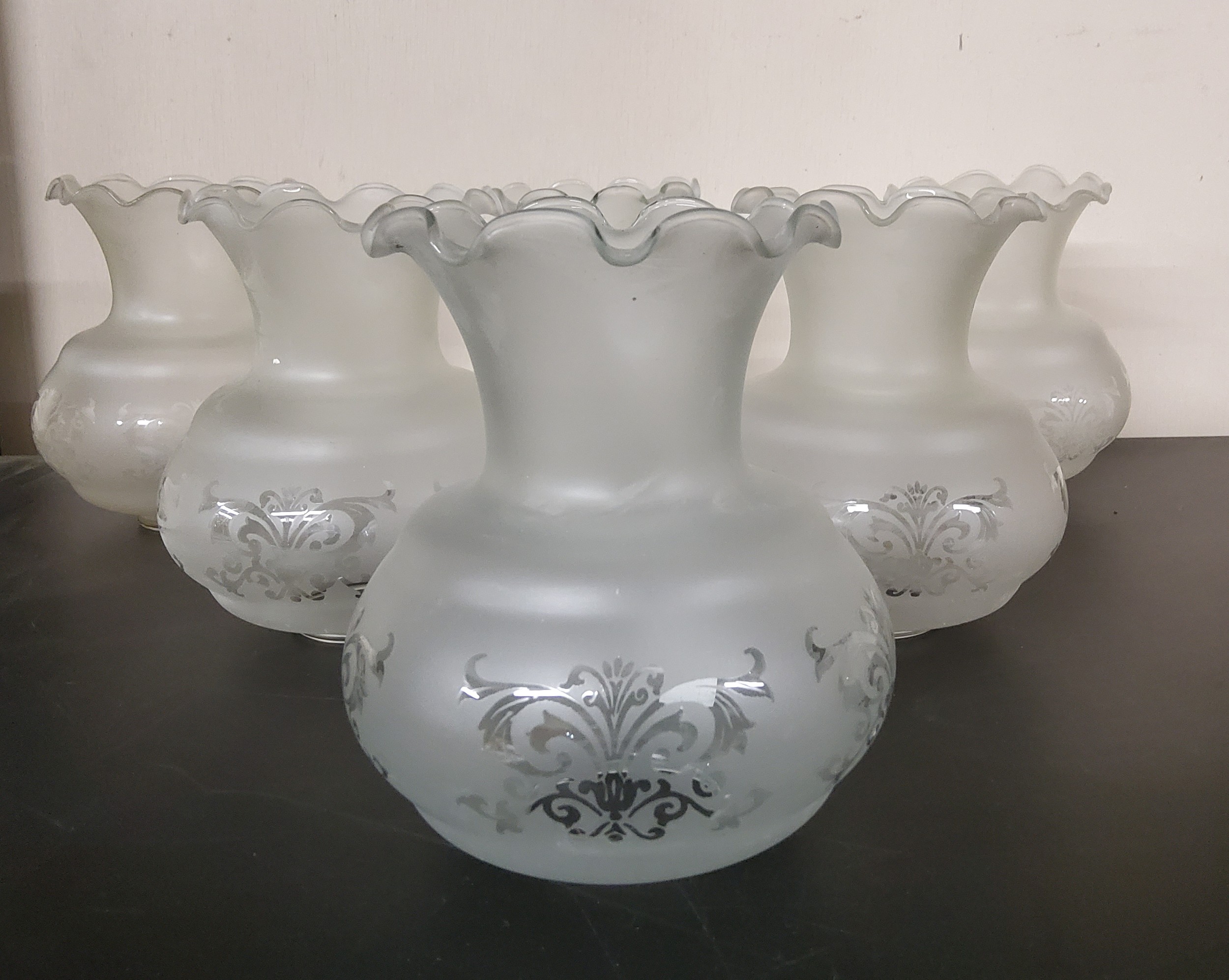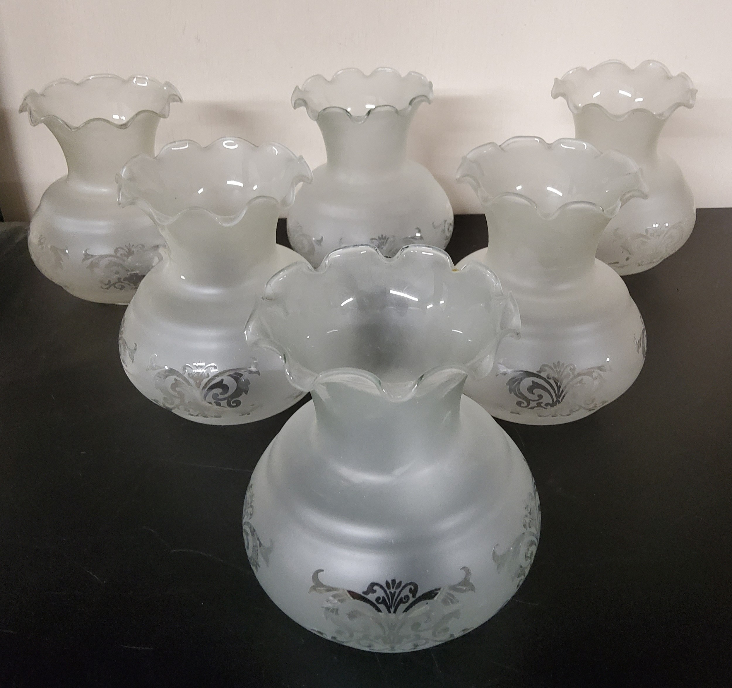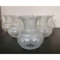 Six opaque etched glass lamp shades: approx 15cm heigh x 12.5 cm in dia