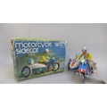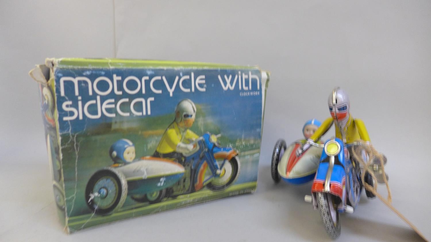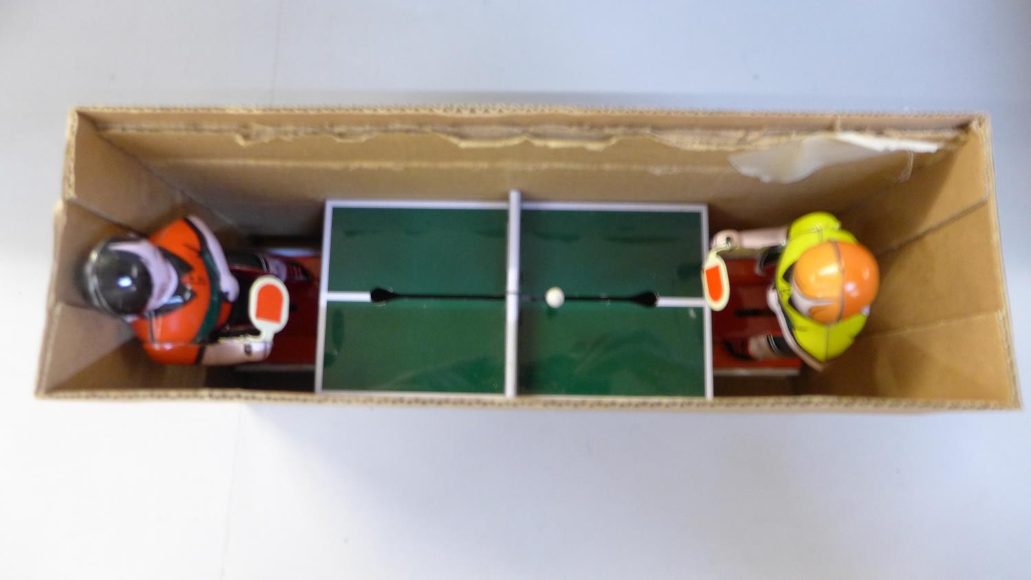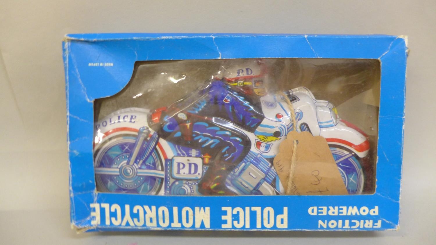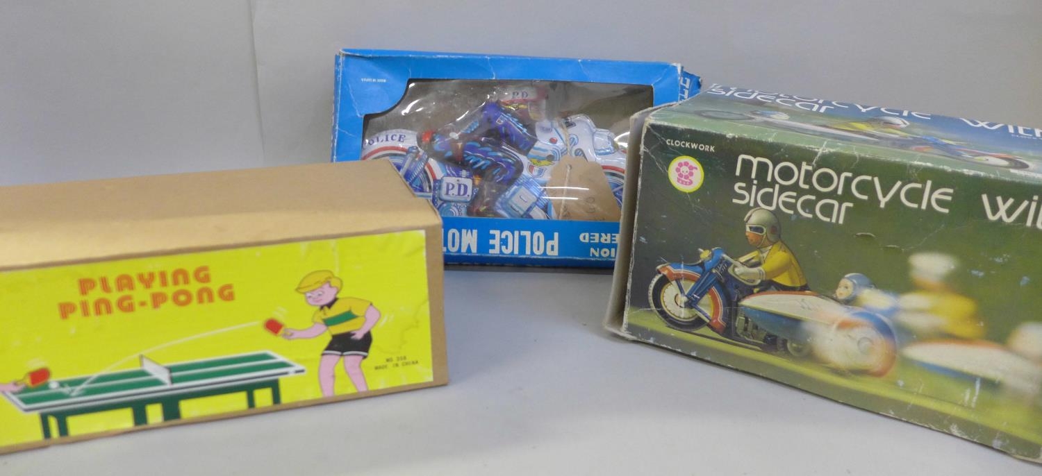 Three tin-plate toys, two motorcycles and ping-pong
