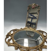 A painted wooden wall mirror, bombe form with asymmetric rococo carving to the top, bevelled glass plate, approx height 90cm, width 69cm, together with a small shield shape mirror, crackle paint effect over gold, height 69cm (2)