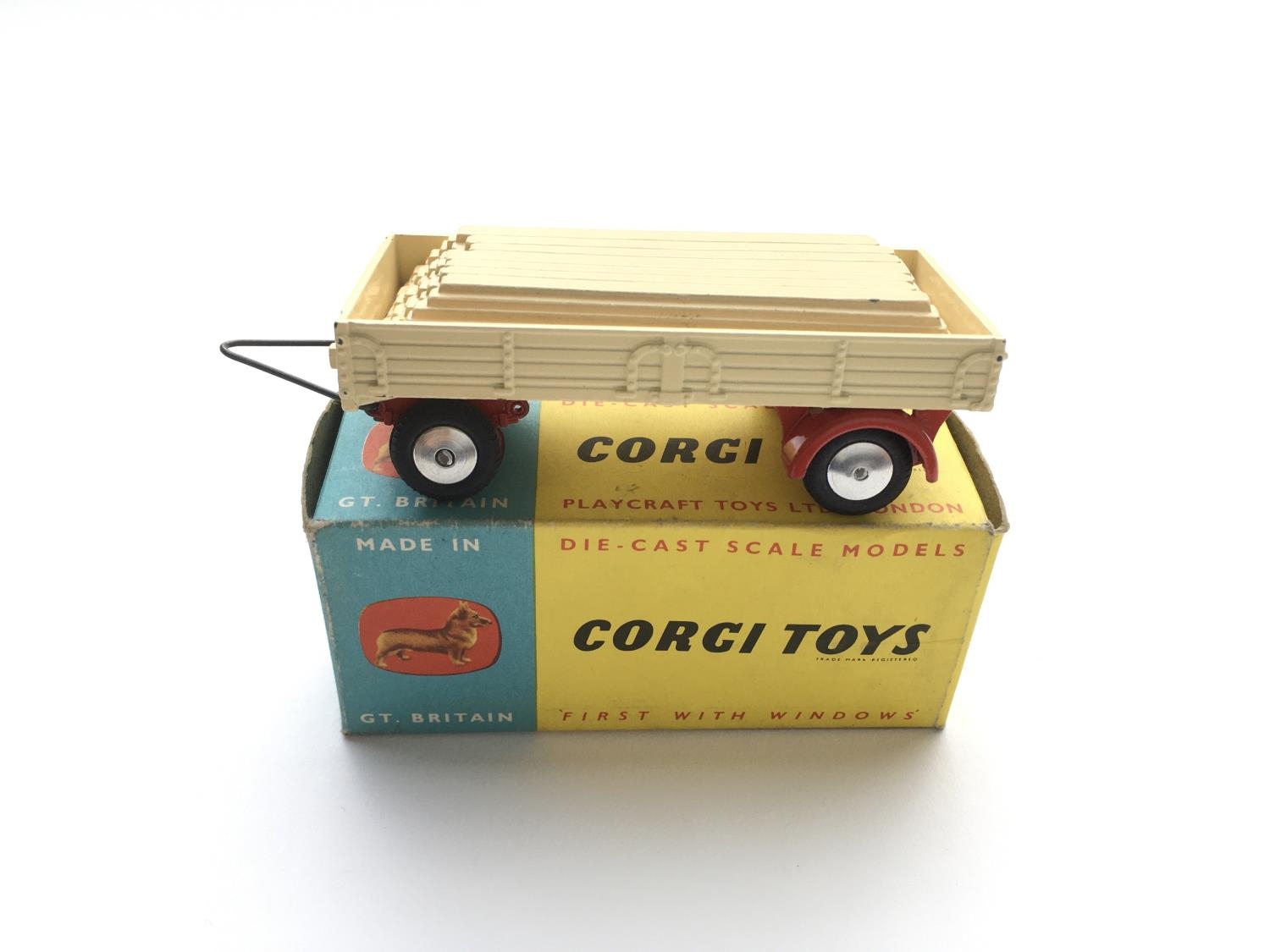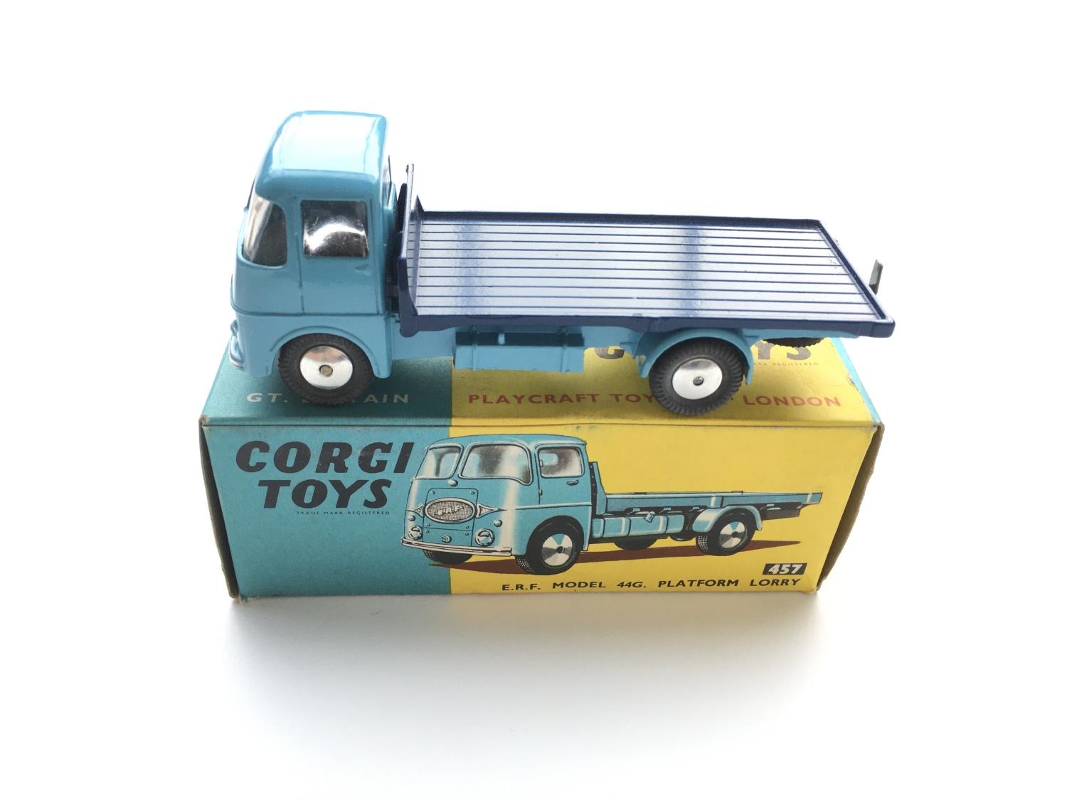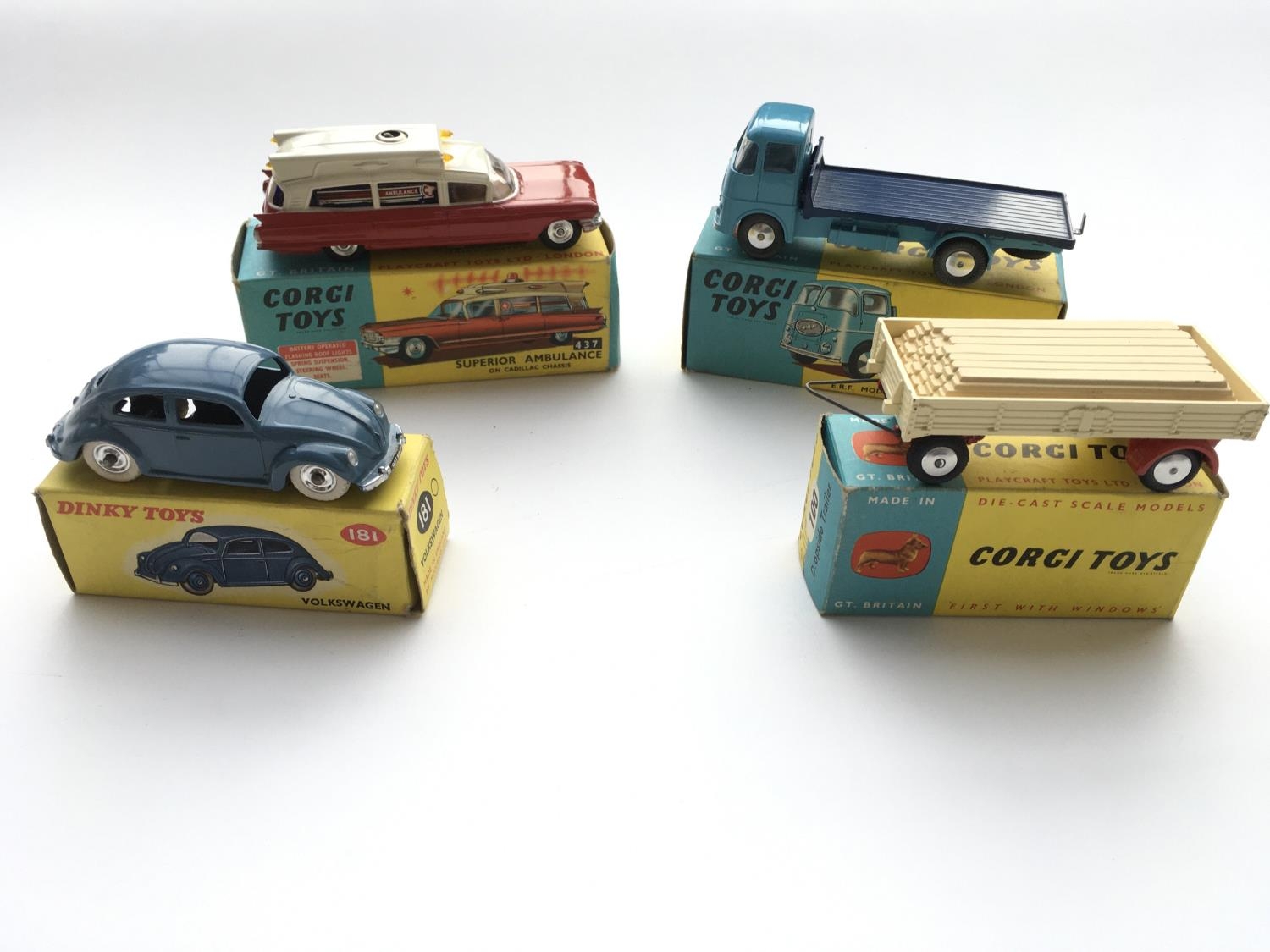 4 boxed Corgi vehicles #181 Volkswagen, #437 Superior Ambulance,#457 E.R.F Platform Lorry, #100 Dropside Trailer.