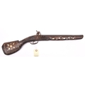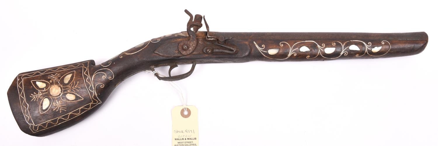 A decorative Indian bazaar “flintlock” pistol, 21½” overall, with wire and M.O.P. inlaid stock and crude non working lock. QGC £30-40