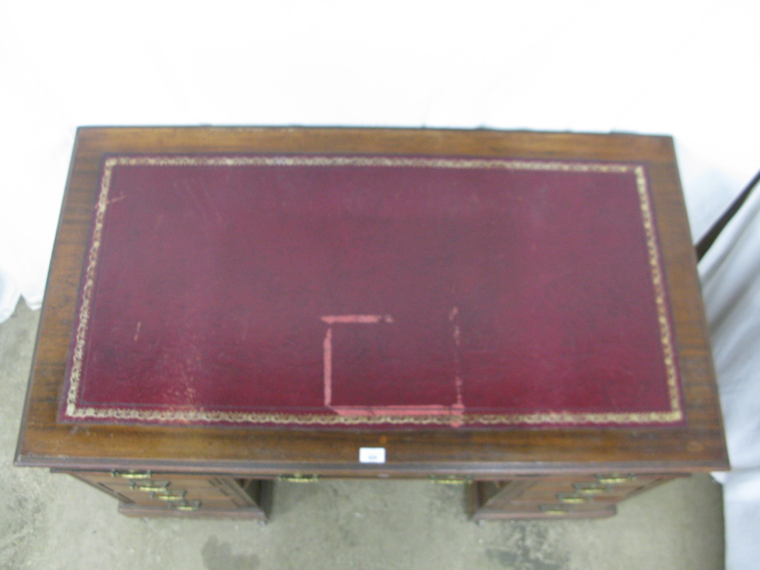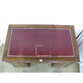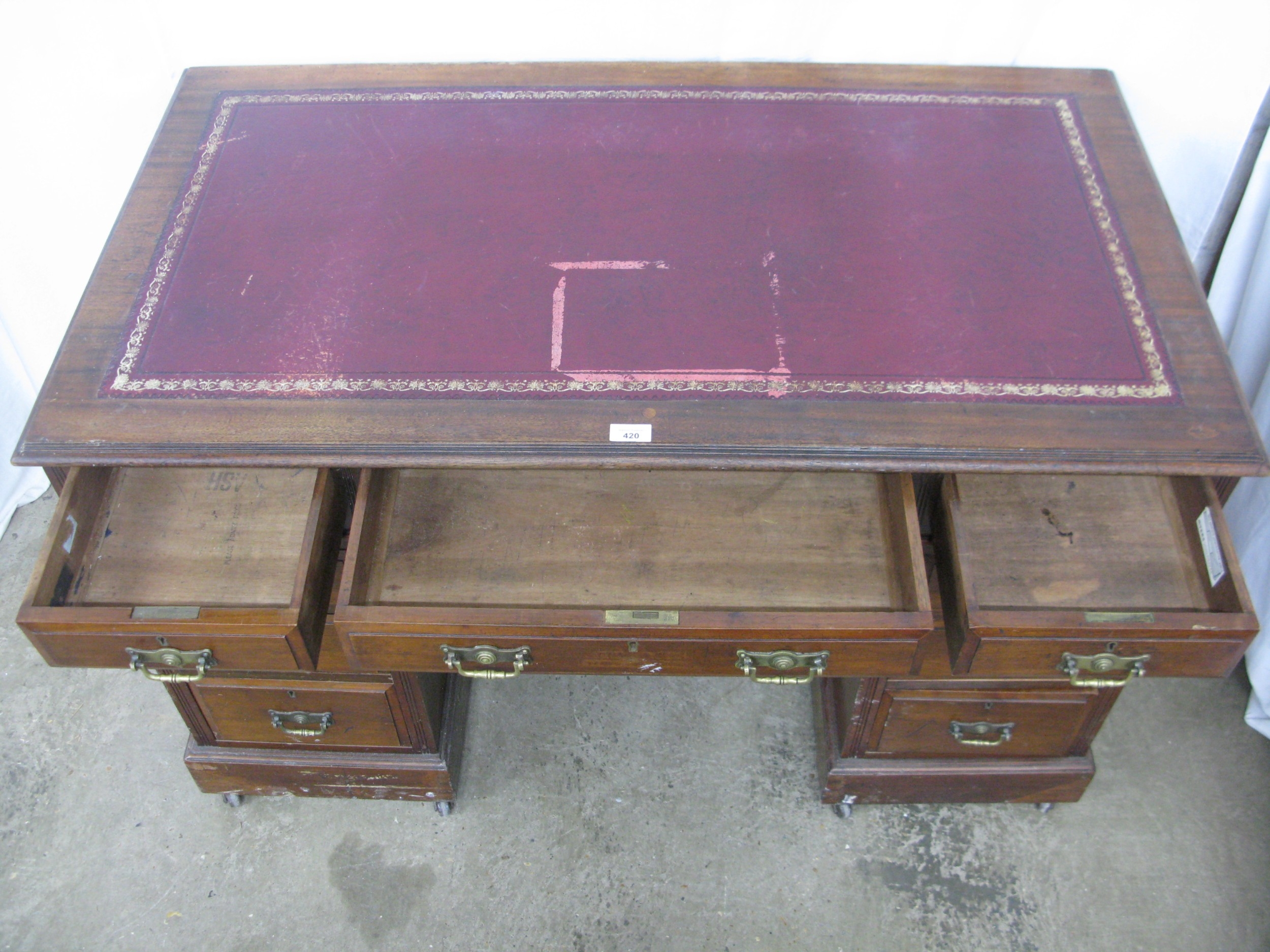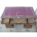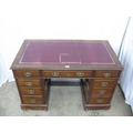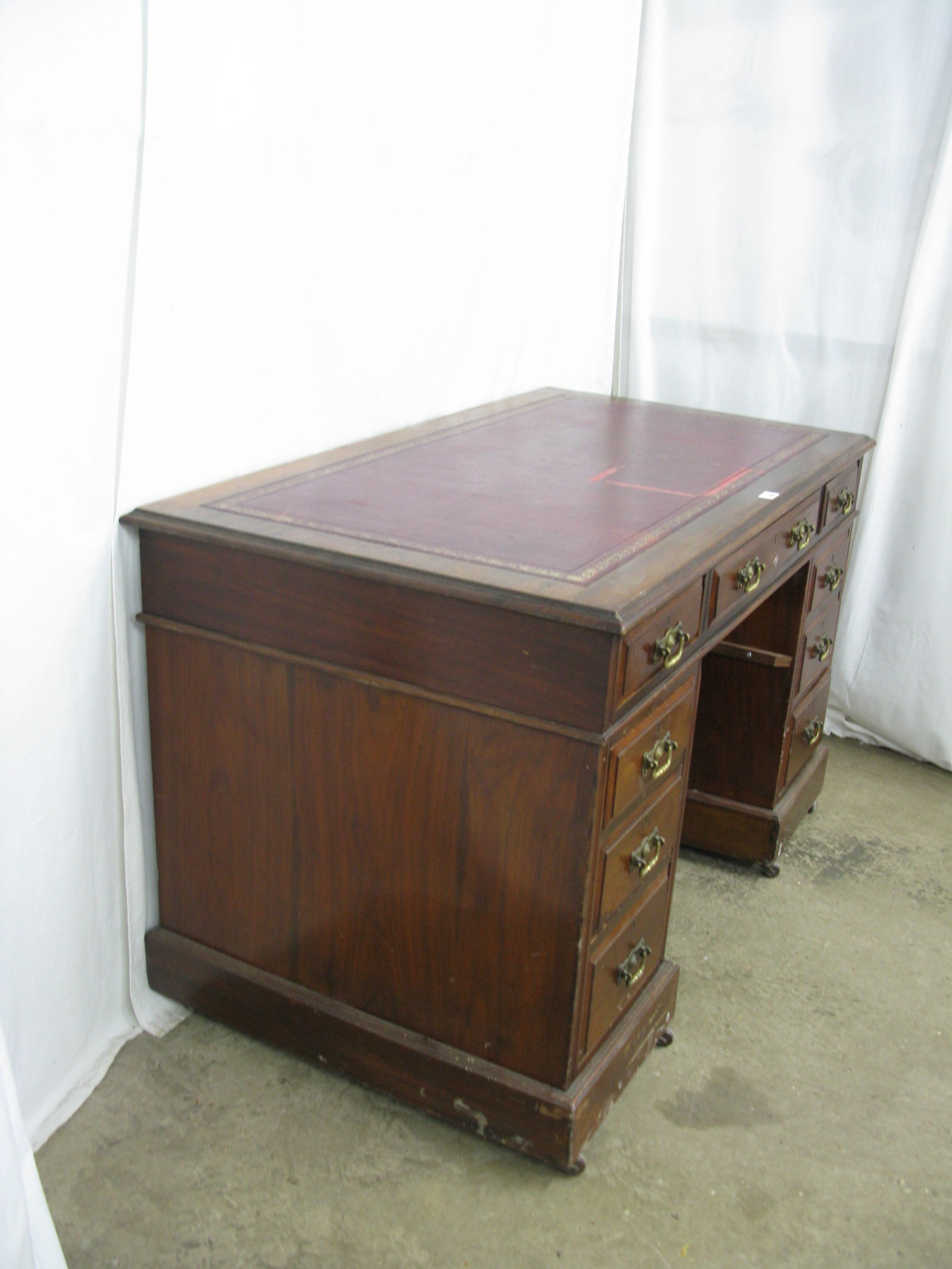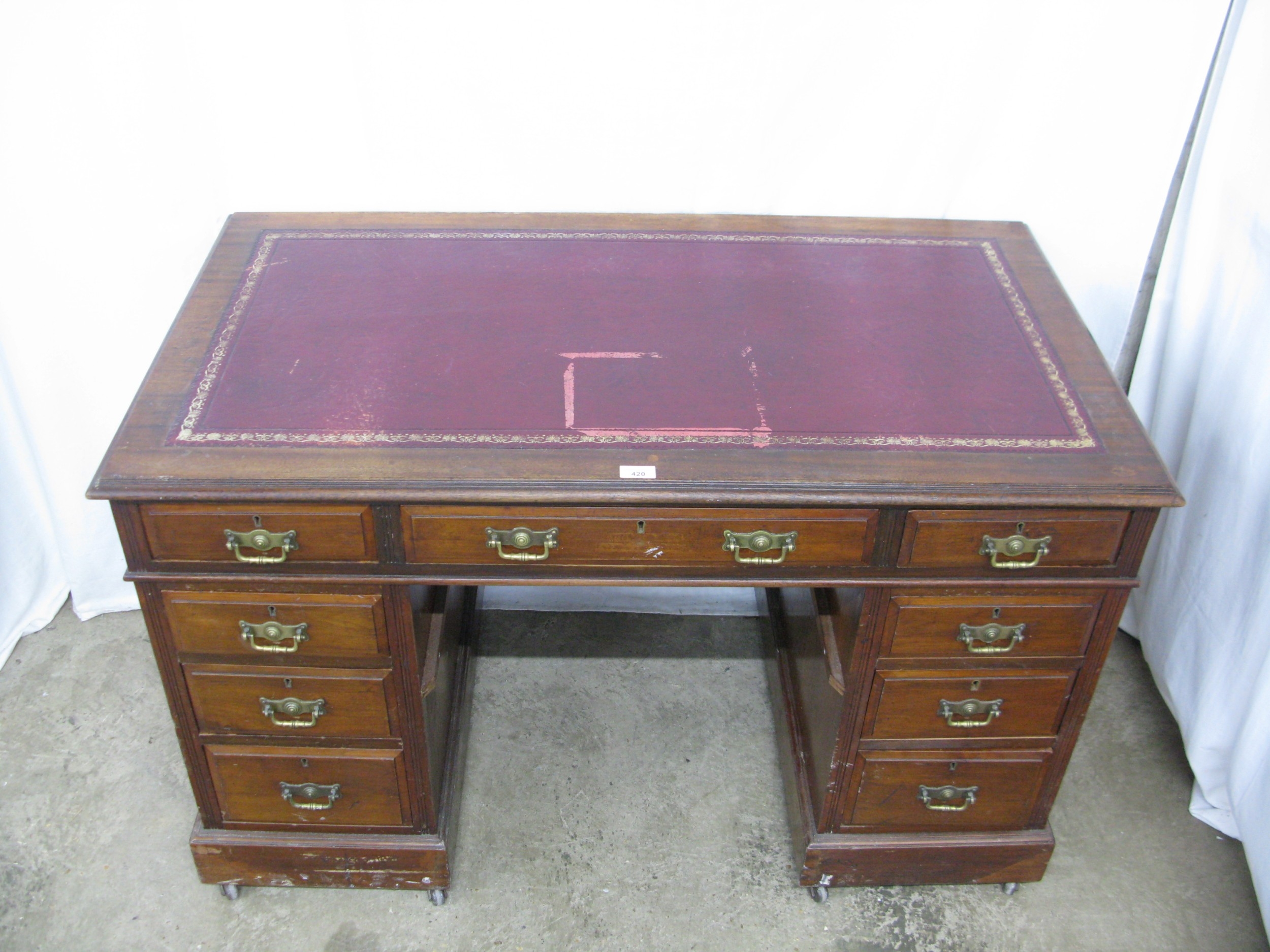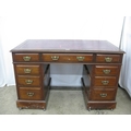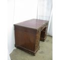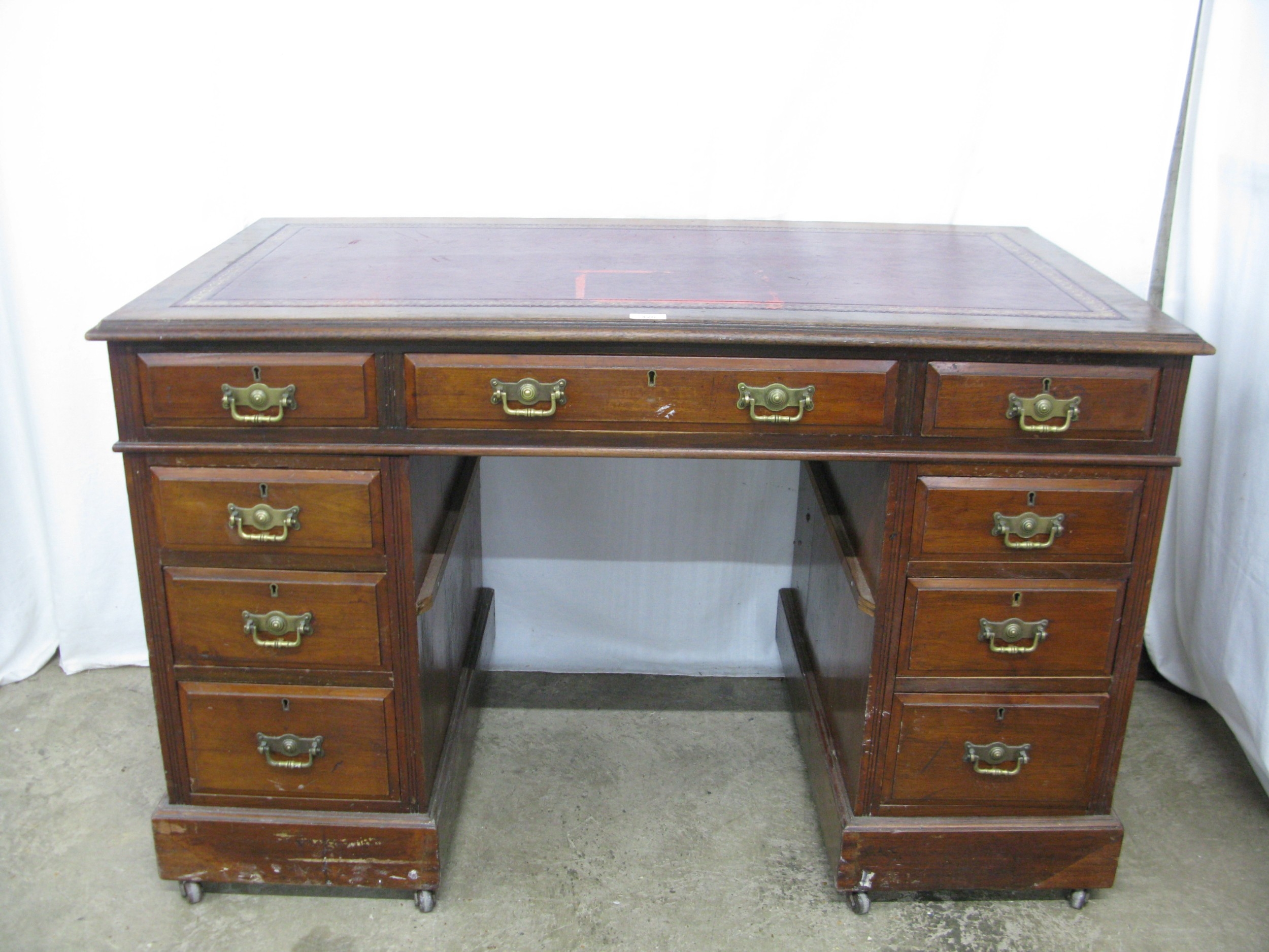 Mahogany twin pedestal desk having a red leather gilt tooled insert over three frieze drawers, standing on two pedestals of three drawers each with brass swan neck handles, standing on plinth bases with castors - 122cm x 69cm x 77cm tall (leather insert af)
