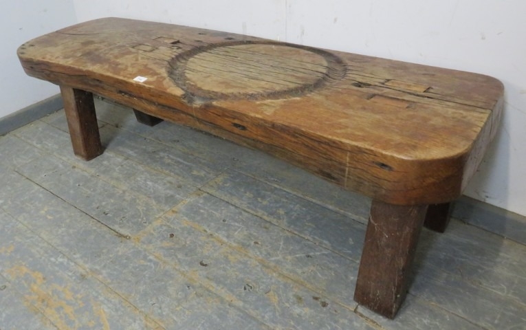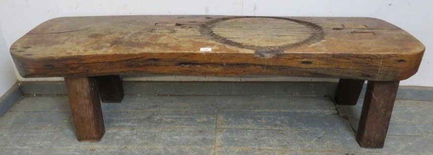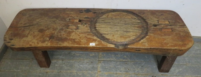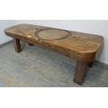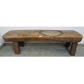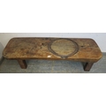 A very rustic oak heavy pig bench. Solid top on four chunky legs, the top has a carved out circle (intriguing). H43cm x W155cm x D48cm approx.