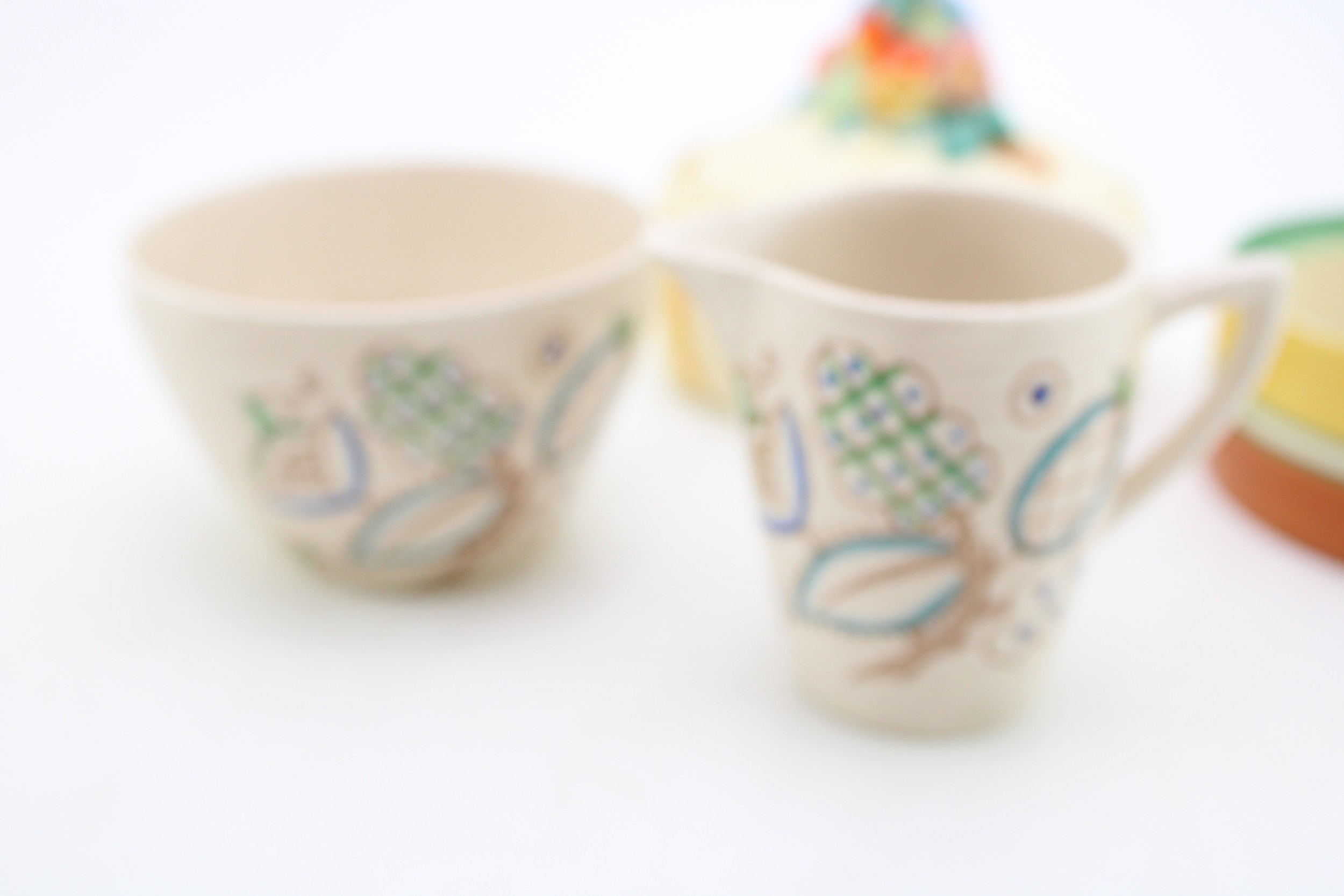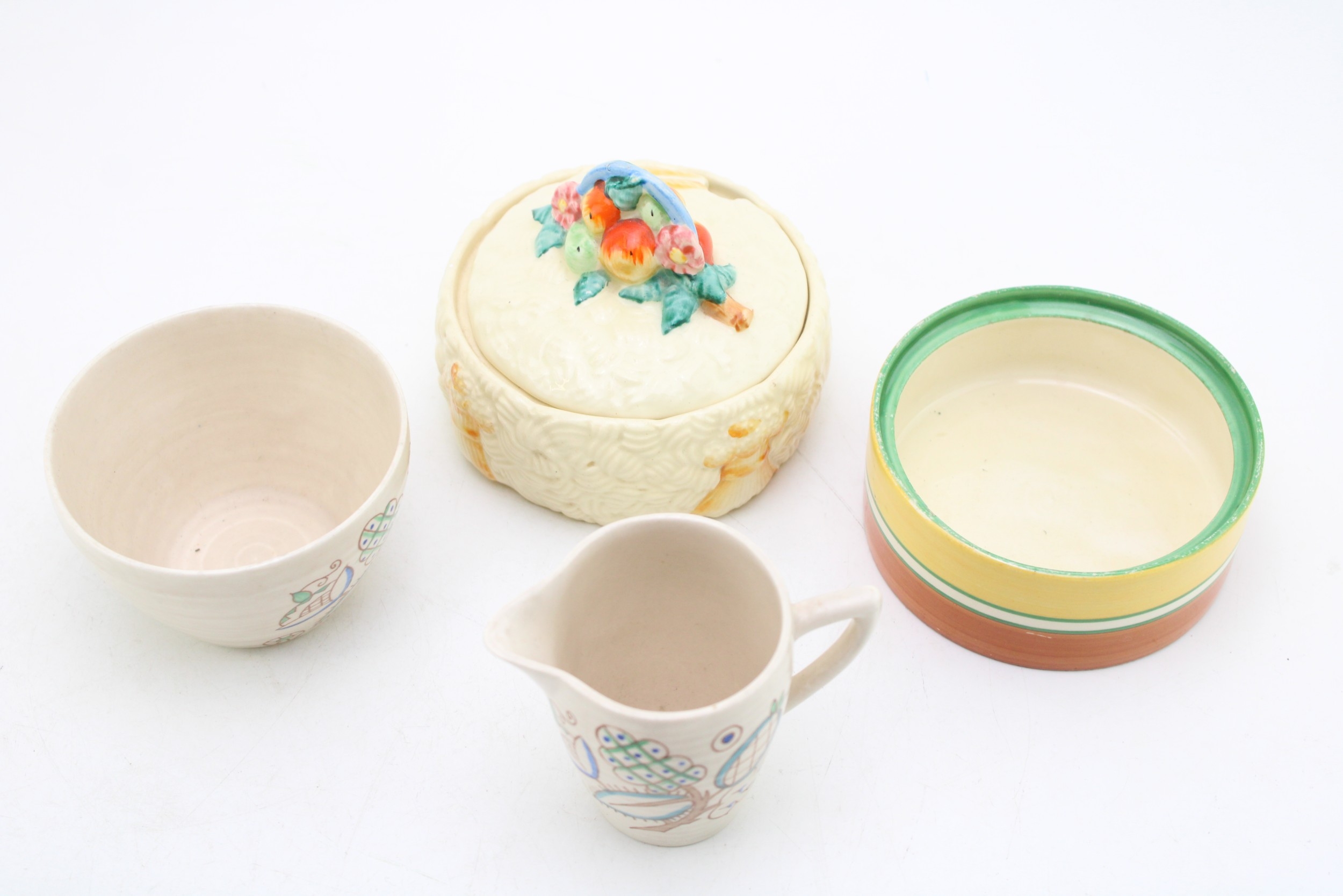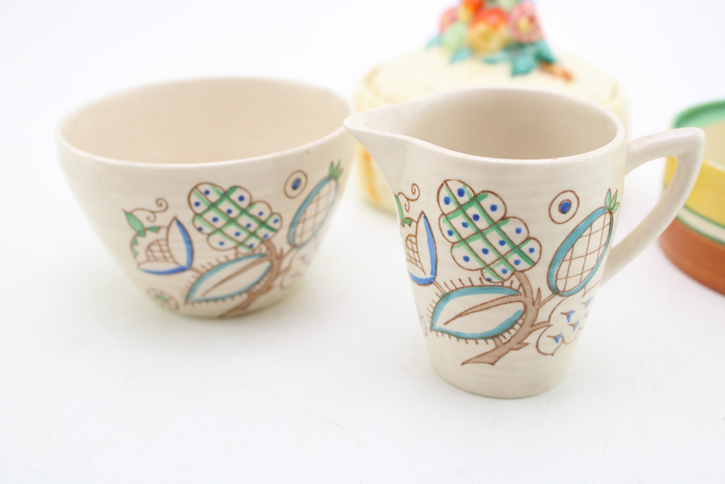 Clarice Cliff to include a Celtic Harvest lidded jar, a Crocus base with a Wilkinson milk and sugar bowl with a floral design (4).