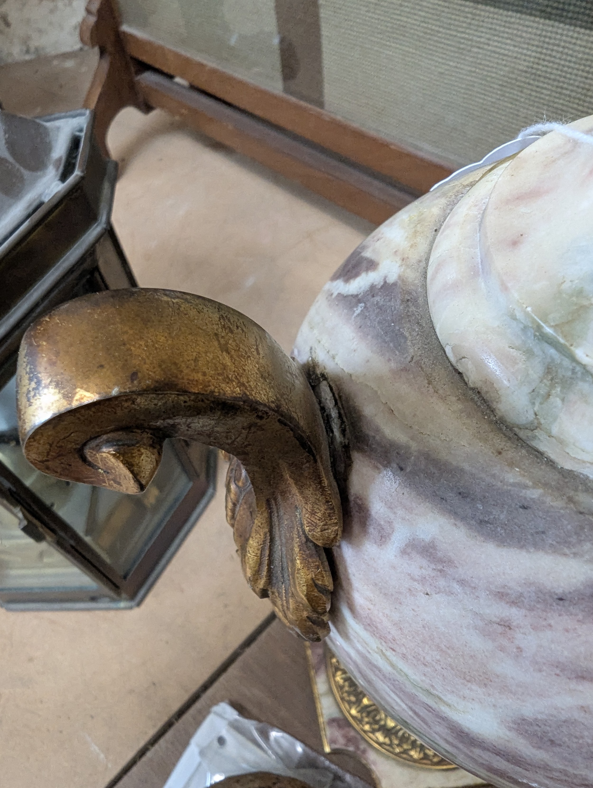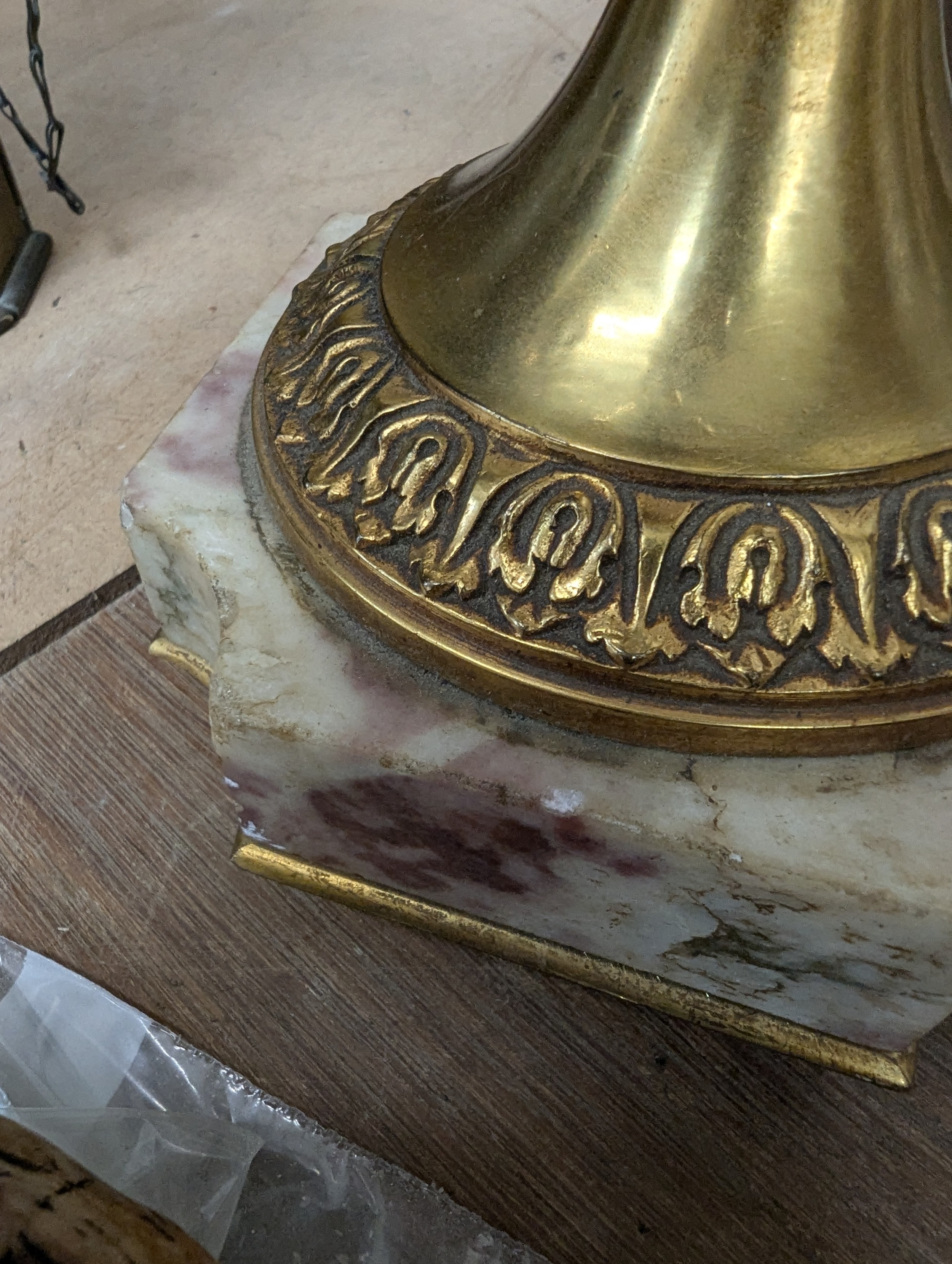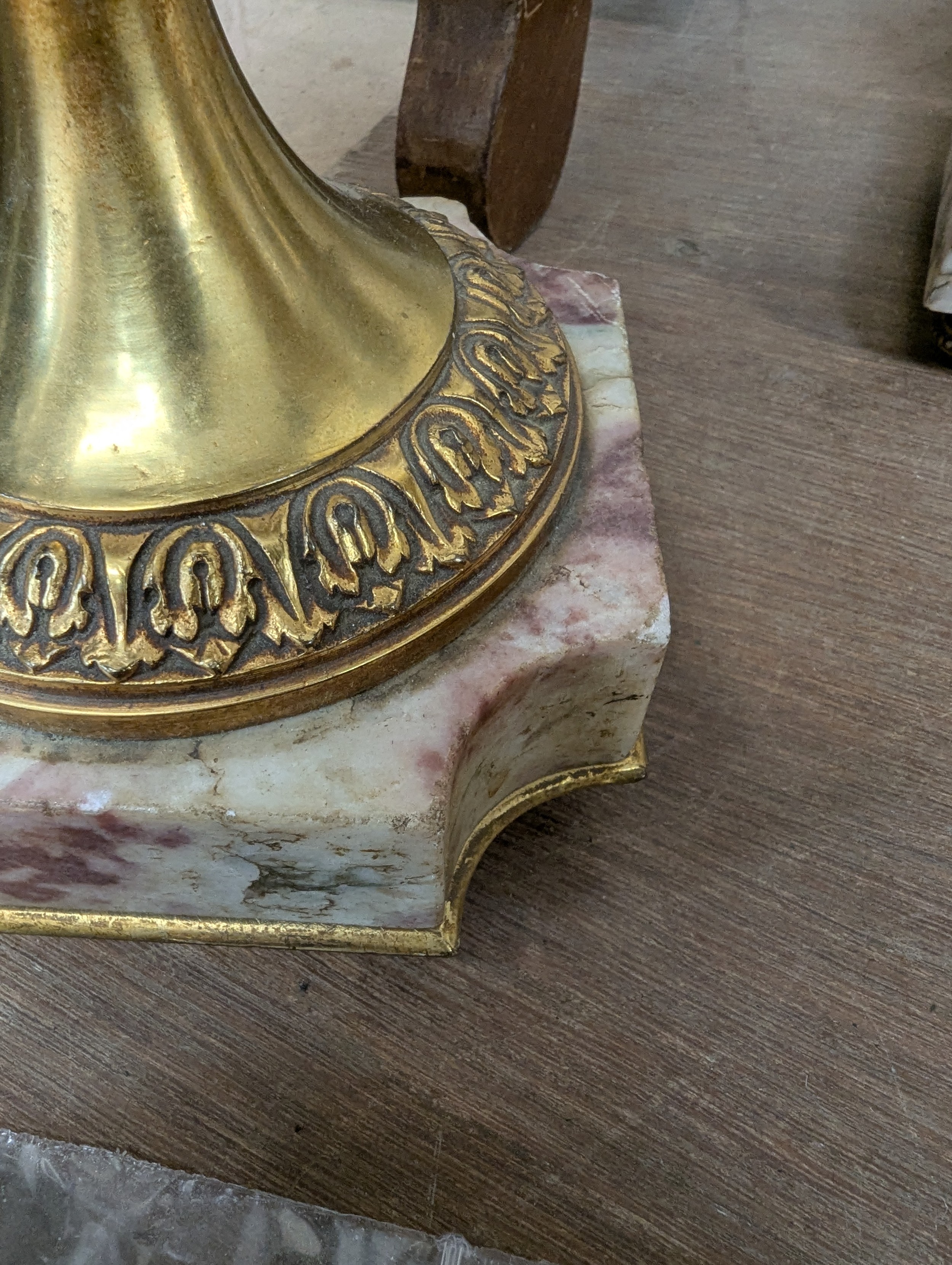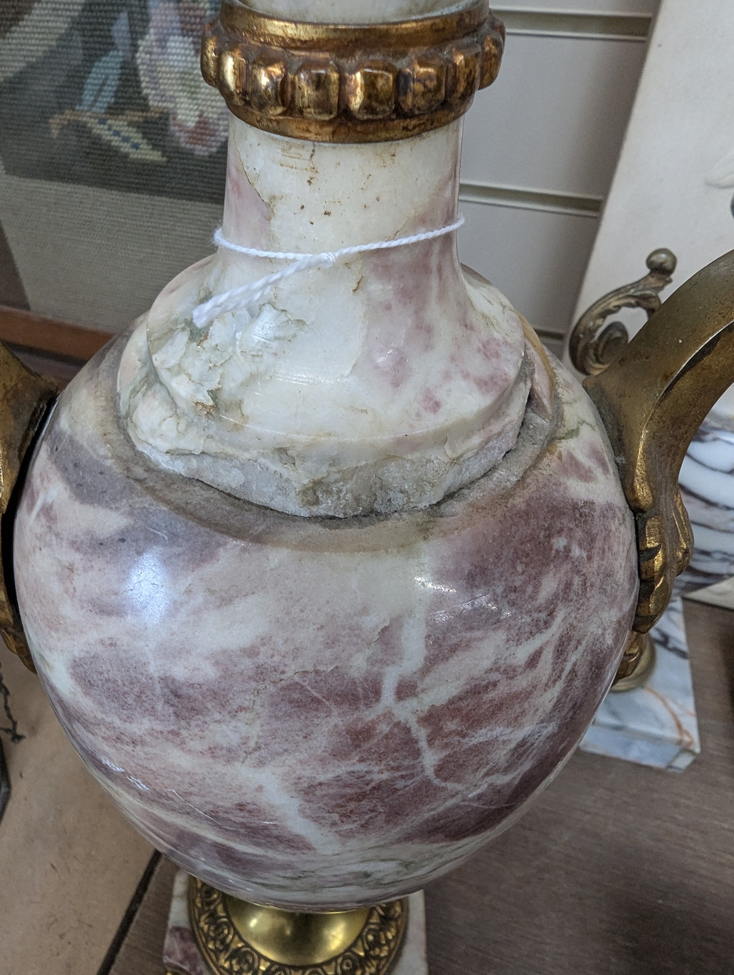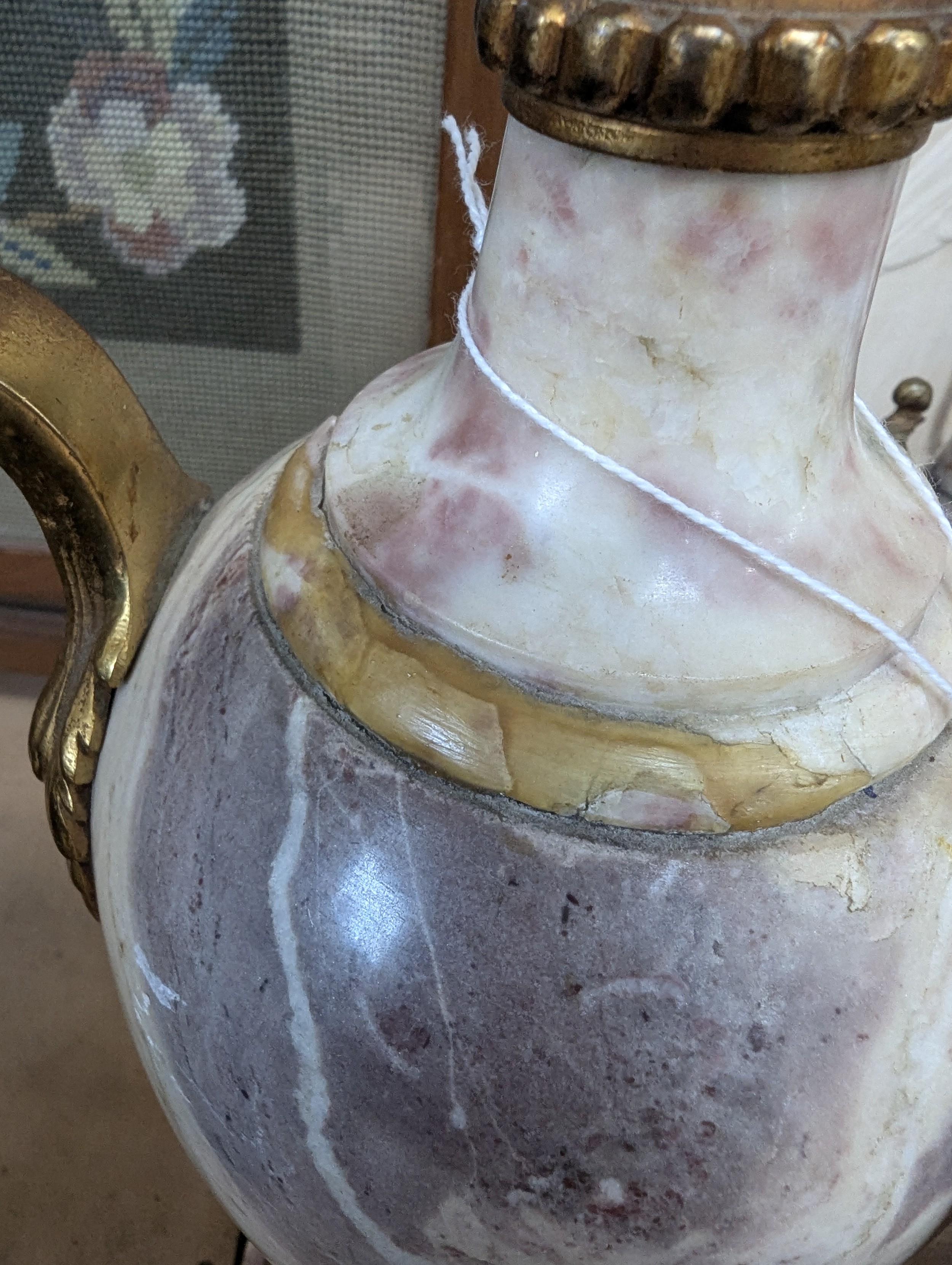 Empire style coloured marble table lamp, gilt-metal mounts on shaped marble base, height to top of bayonet fitting 54cm