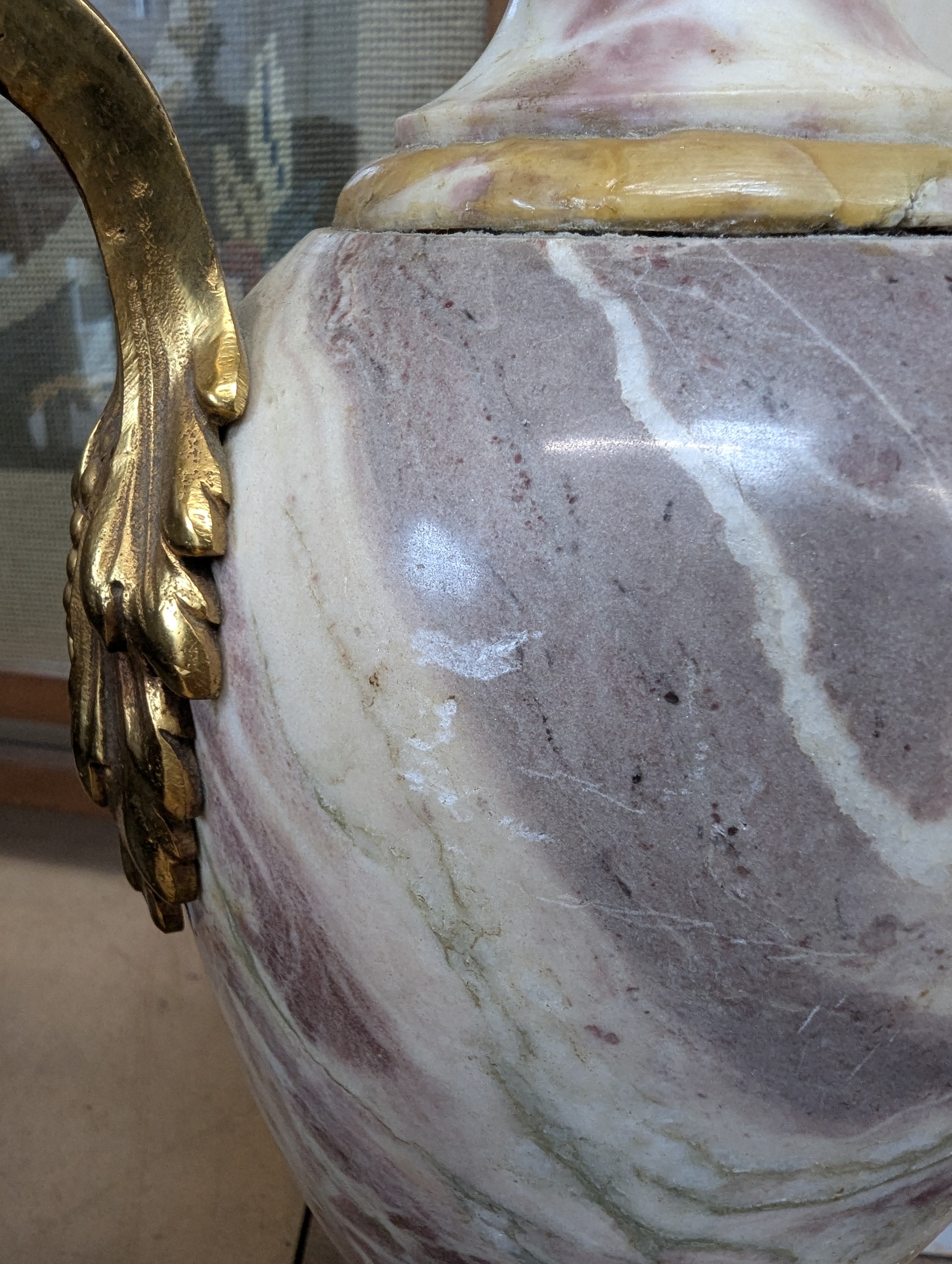 Some visible repair just to the top of the 2 handles, some surface chips and signs of wear