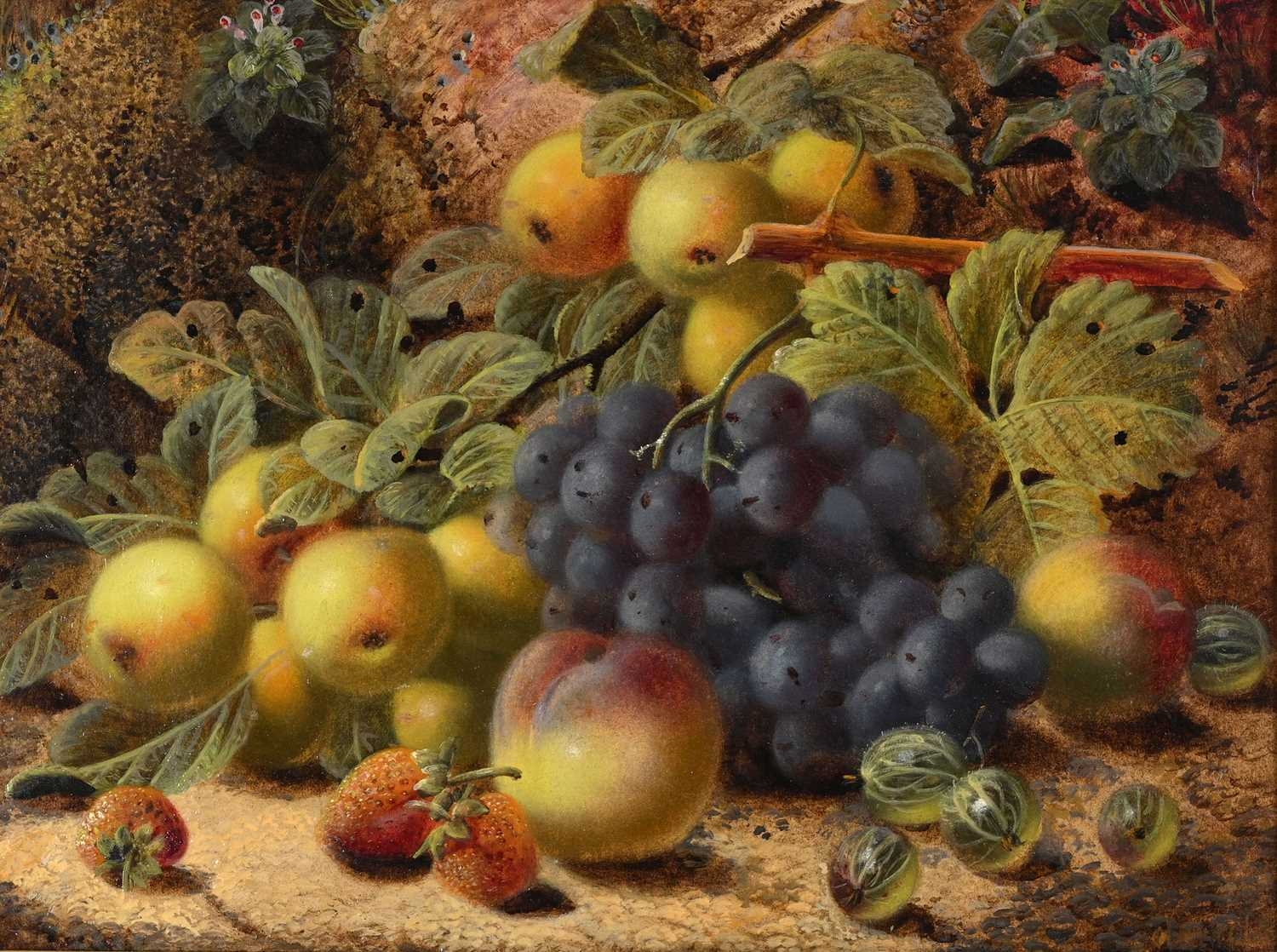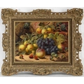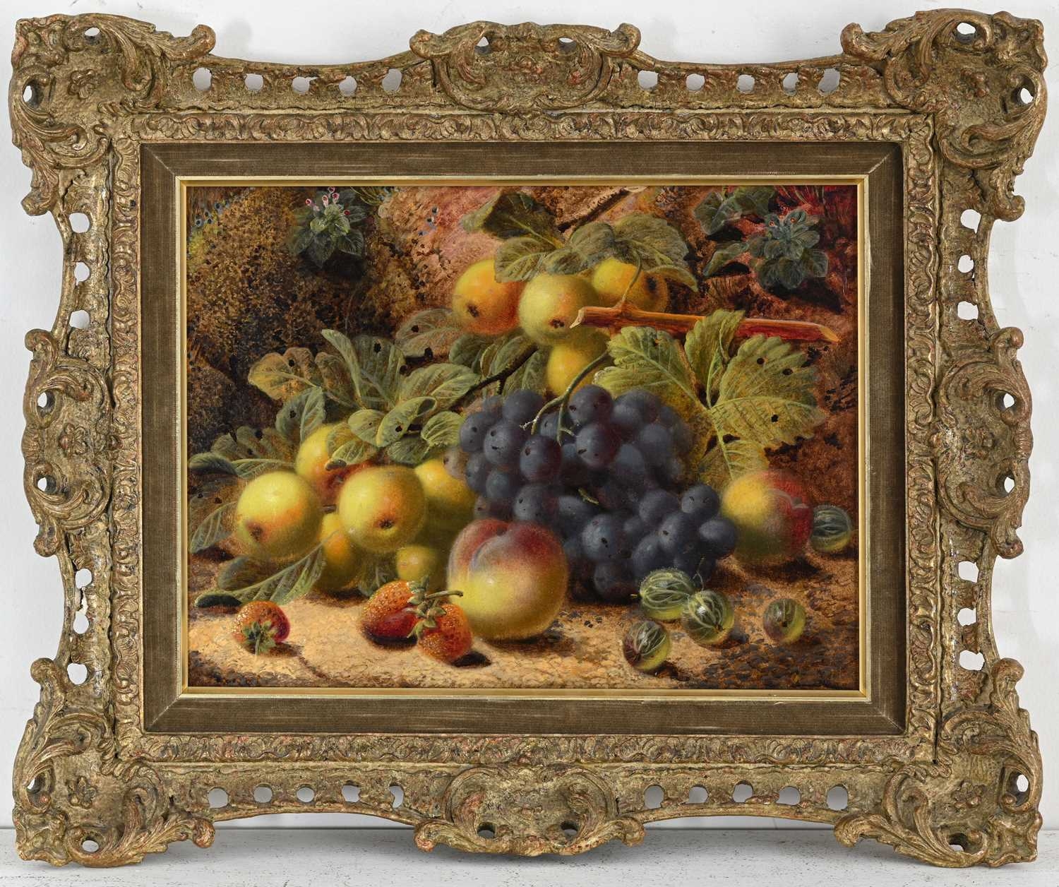 Oliver Clare (British, 1853-1927), still life of grapes, apples, strawberries, and gooseberries on a mossy bank, oil on board, 23 by 30cm, gilt frame. Provenance: with John Noott, Broadway