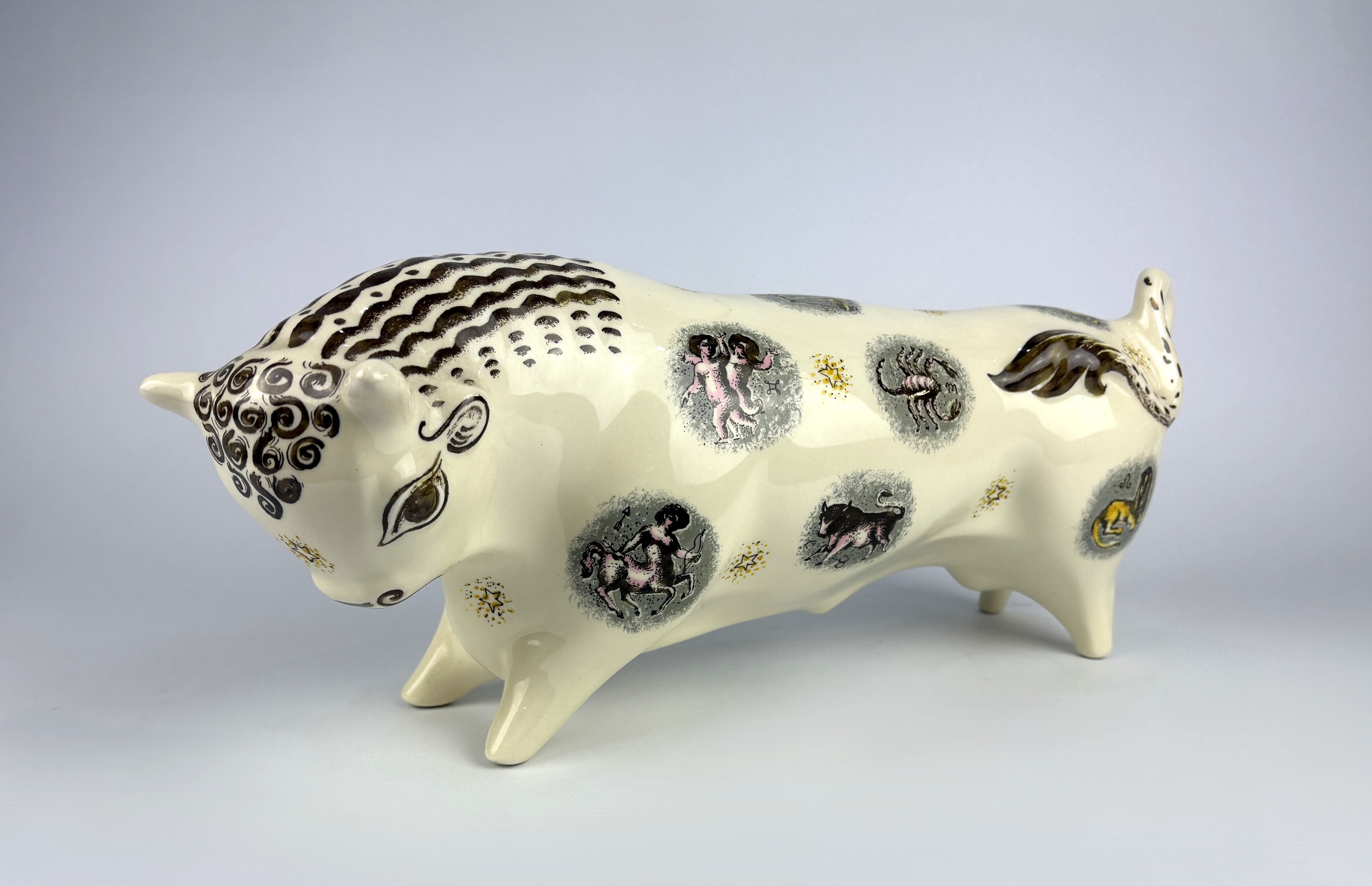 A Wedgwood Pottery Zodiac bull designed by Arnold Machin, designed in 1946, printed with star sign vignettes in colours, impressed marks, printed factory marks, 40cm long