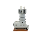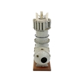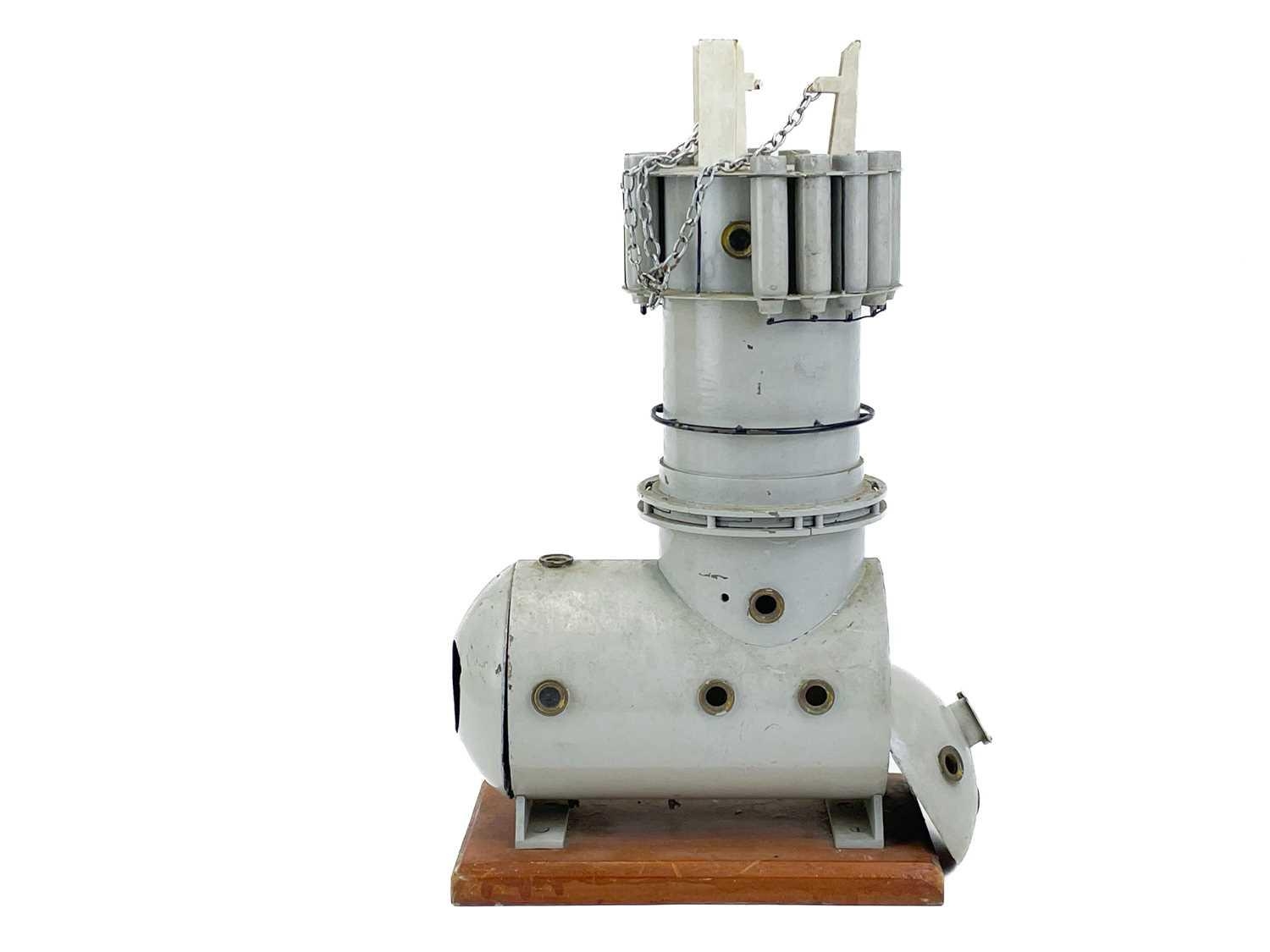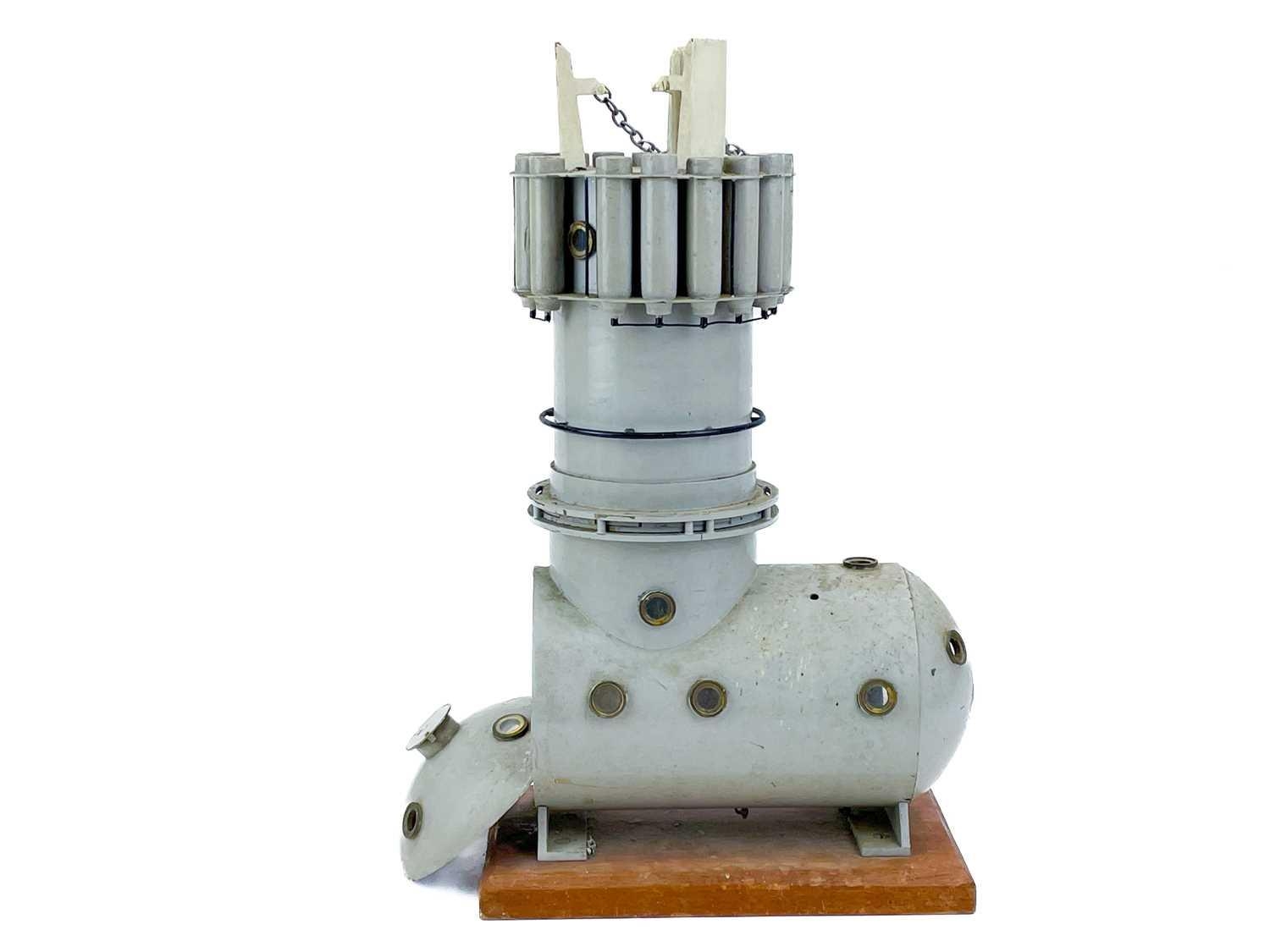 A painted copper and brass model of a diving chamber. Fitted with a number of portholes, on a hardwood base, height 44cm, width 29cm.