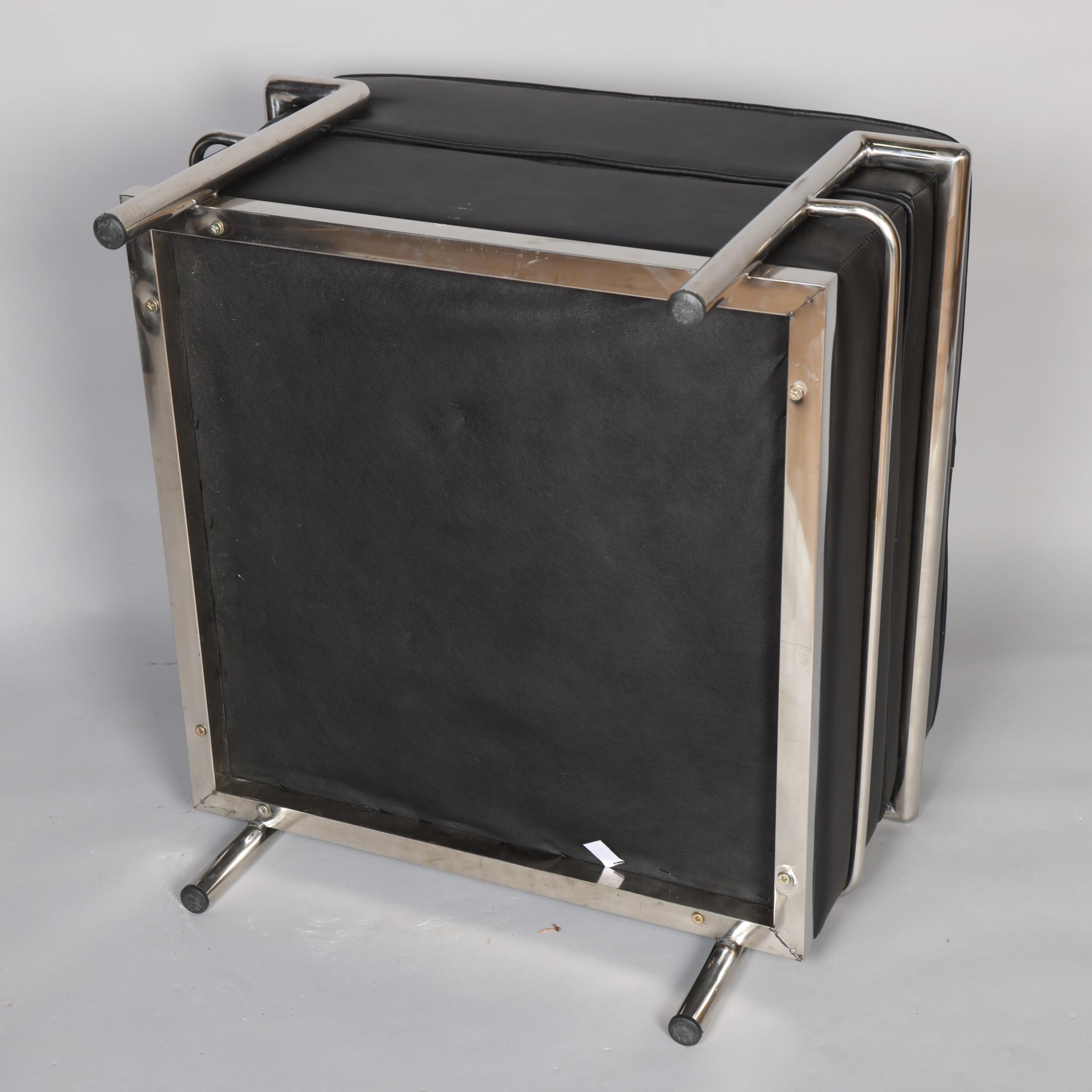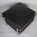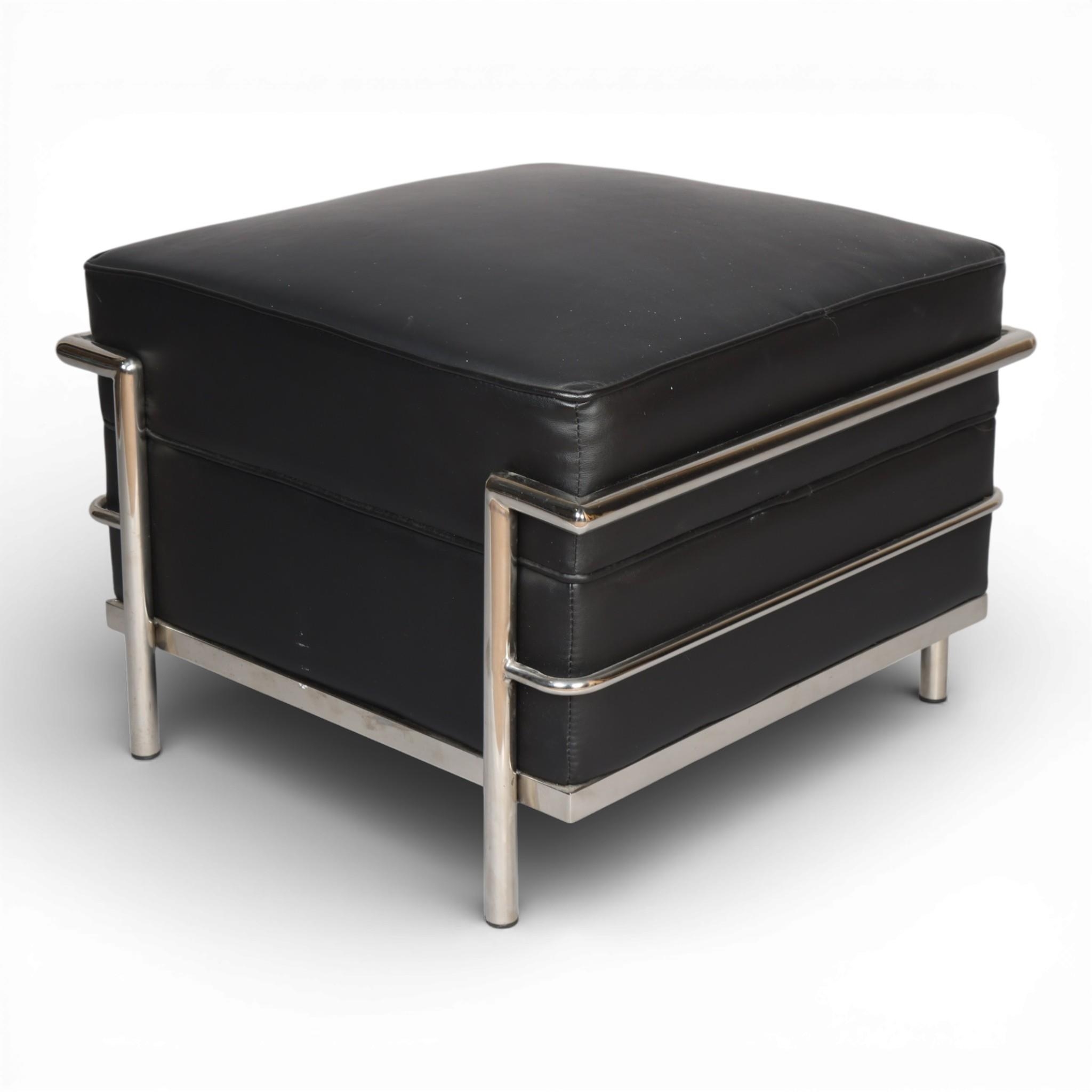 An Le Corbusier style Grand comfort footstool with black faux leather upholstery, height 44cm, frame 60cm Sq