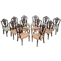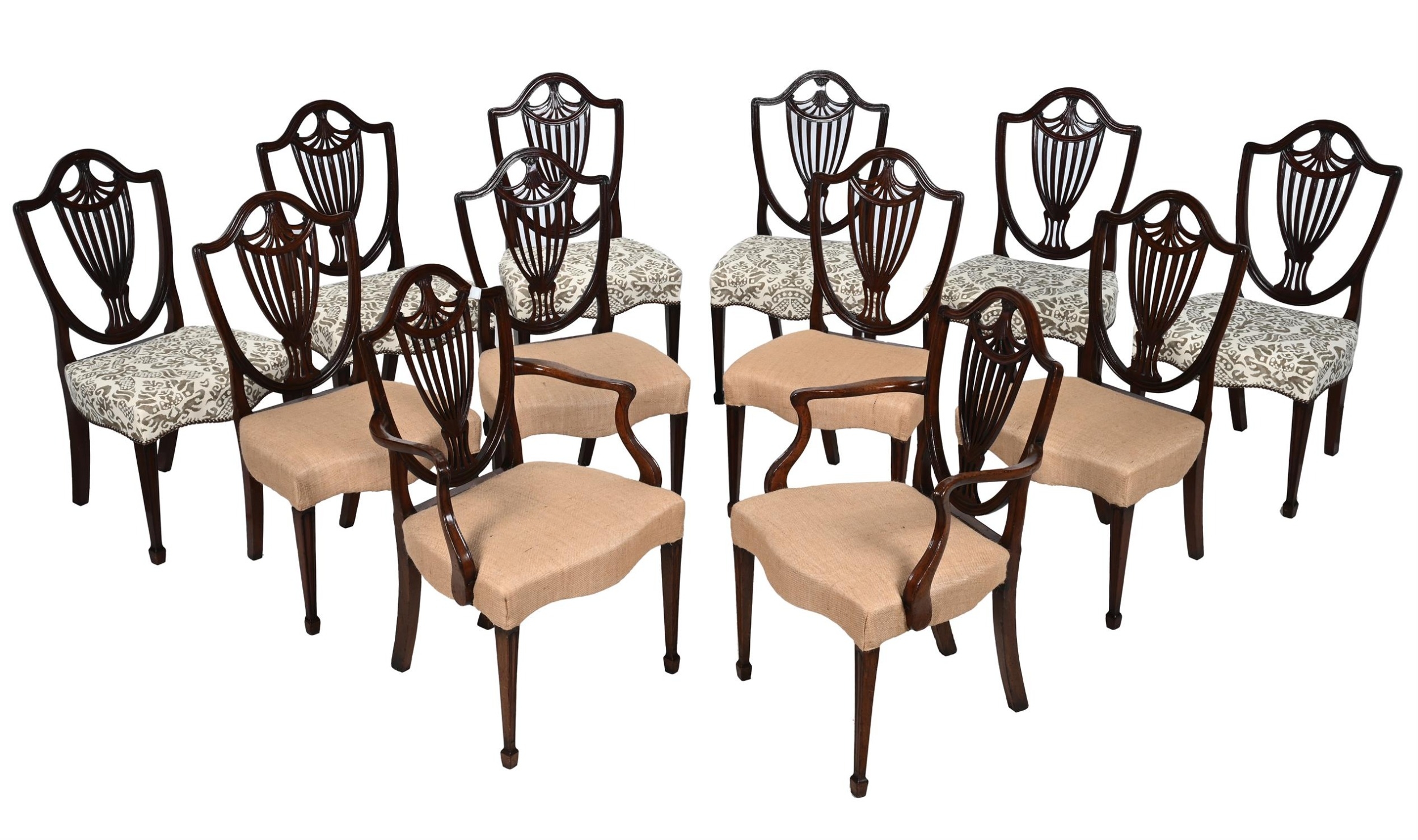 A HARLEQUIN SET OF TWELVE MAHOGANY DINING CHAIRS LATE 18TH CENTURY AND LATERComprising a set of period examples and six later, each with a shield back above upholstered seat and square tapering legs side chairs 94.5cm high, 54cm wide, 49cm deeparmchairs 94.5cm high, 62cm wide, 53cm deepPLEASE NOTE: ALL LOTS ARE LOCATED AT SACKVILLE WEST STORAGE IN ANDOVER (SP10 3SA) AND ARE NOT AVAILABLE TO VIEW.