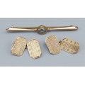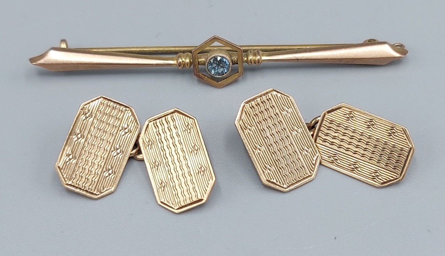 A 9ct gold bar brooch set with Aquamarine together with a pair of 9ct gold cufflinks, 5.2gms