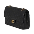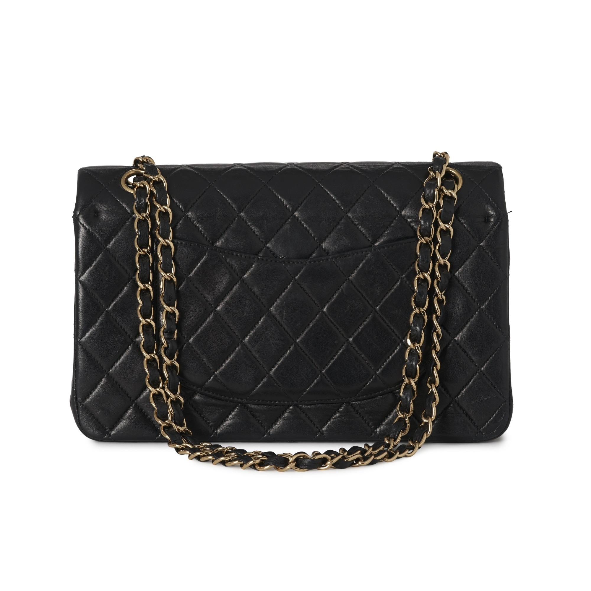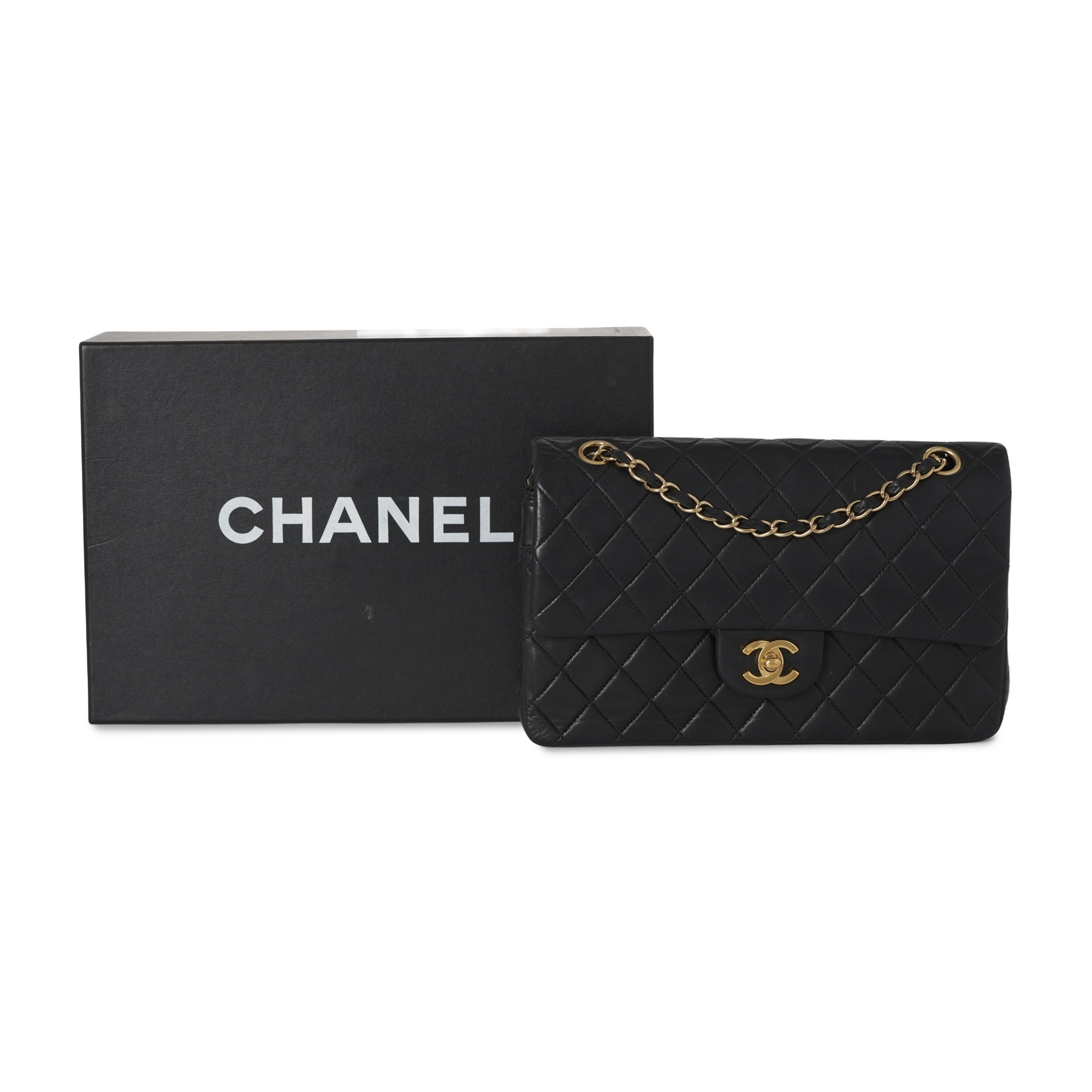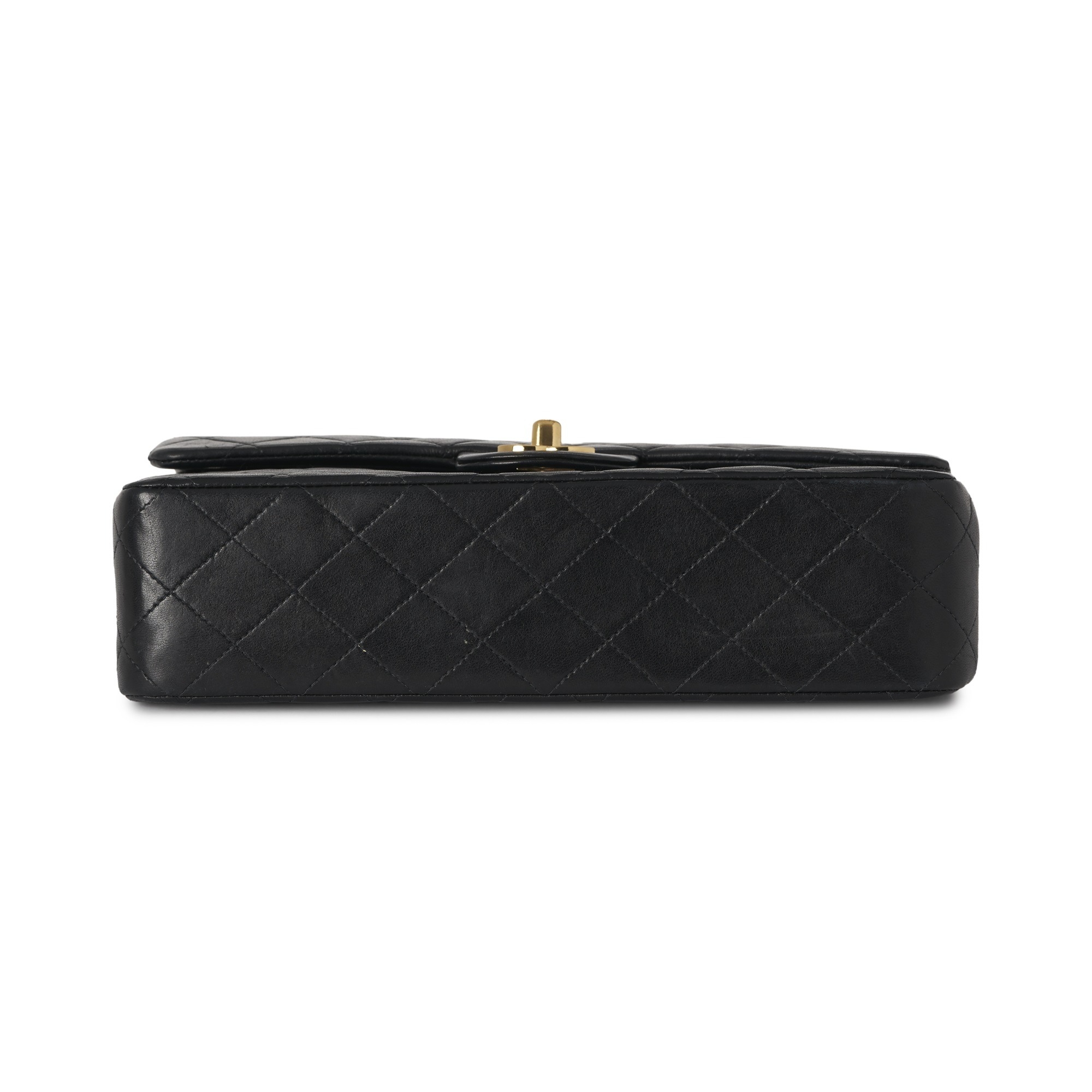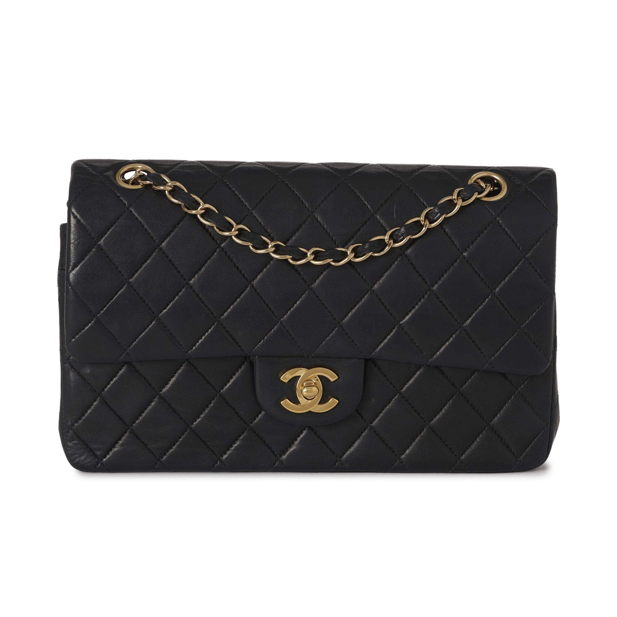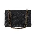 Chanel, a vintage Medium Classic Double Flap handbag, designed with a diamond quilted black lambskin leather exterior, with 24k gold-plated hardware, a rear patch pocket, maker's signature turn-lock logo fastening, double chain and interwoven leather shoulder strap, and an inner flap closure with burgundy leather lining, measuring 6 by 15 by 25.5cm, with maker's care guide, authenticity card, dust bag and box