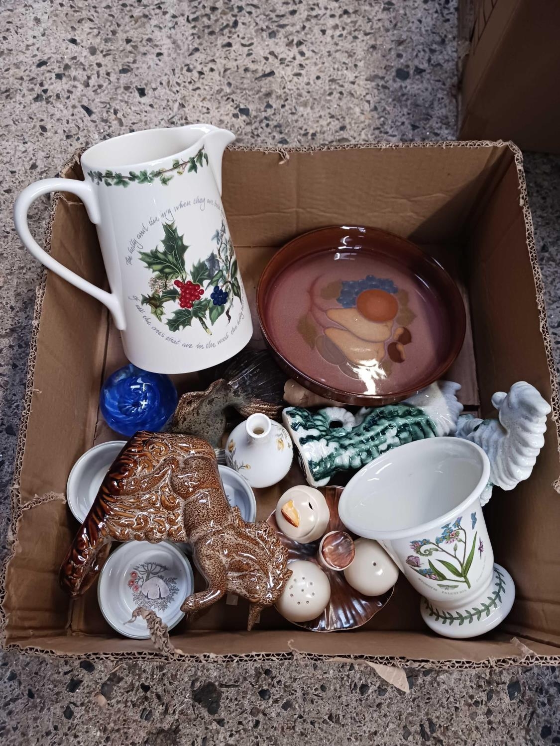 CARTON WITH MISC CHINAWARE INCL; PORTMEIRION, THE HOLLY & THE IVY JUG, 2 SEAHORSE ORNAMENTS BY JOHN BOURDEAUX POTTERY, ISLE OF SILLY. A DENBY ORCHARD DISH & OTHER CHINAWARE