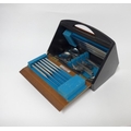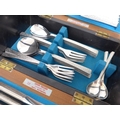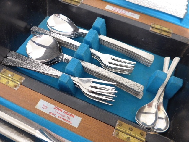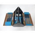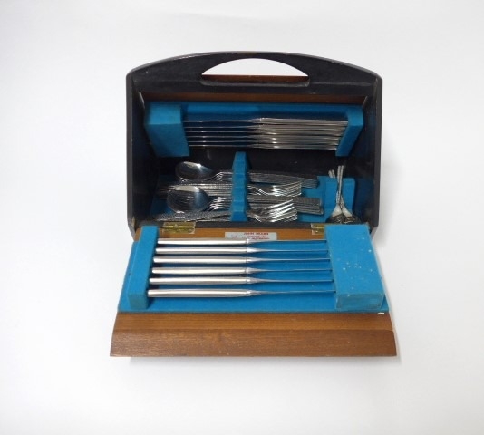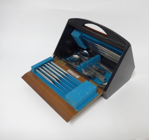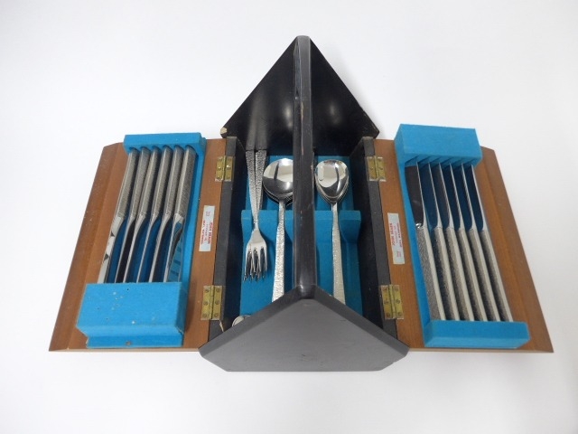 A Viners Studio canteen of cutlery designed by Gerald Benney, in its original fall flap canteen box in ebonised wood and teak finish