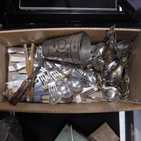 A collection of oriental and Persian metalware, together with silver salt spoons and sugar tongs