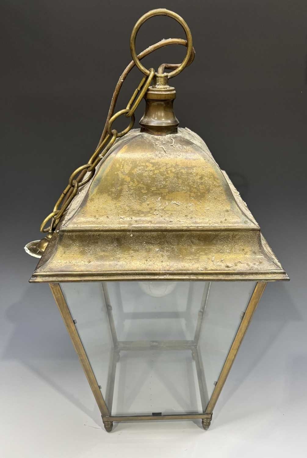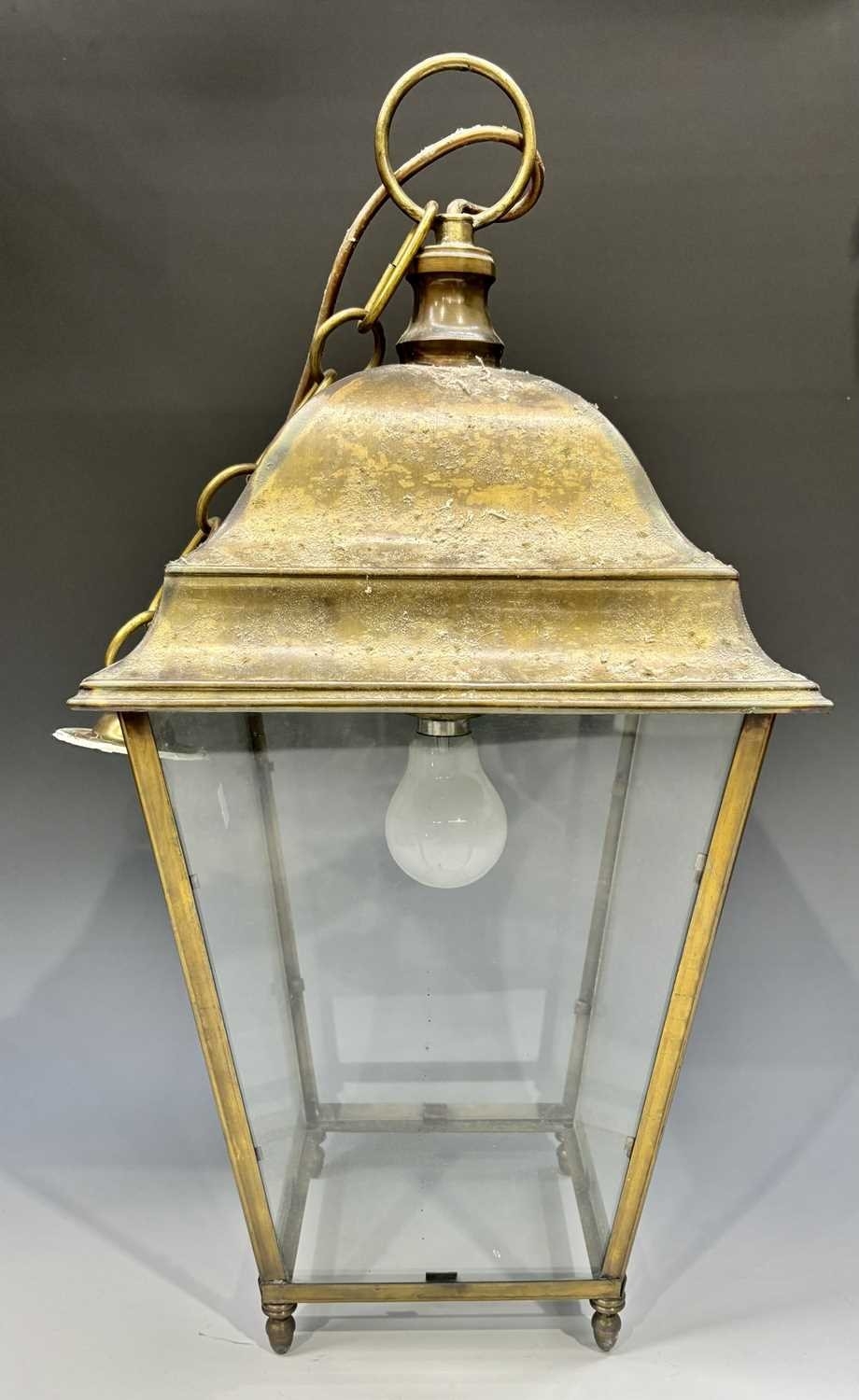 A four-pane, brass-framed, pendant hall light, 19th century style, 50cm high Provenance: from the collections of two prominent Anglo-Irish and British aristocratic families, directly descended from Lord Patrick James Stuart (1794- 1859), brother of John 2nd Marquess of Bute and great grandson of John Stuart, 3rd Earl of Bute (1713 -1792), Prime Minister to George III, resident at Cardiff Castle, Wales; Dumfries House, Scotland and Wilton Crescent, Belgravia, London