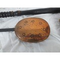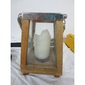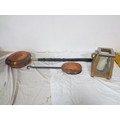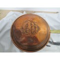 A brass warming pan, a brass chestnut roaster and a wooden framed and glazed candle lantern