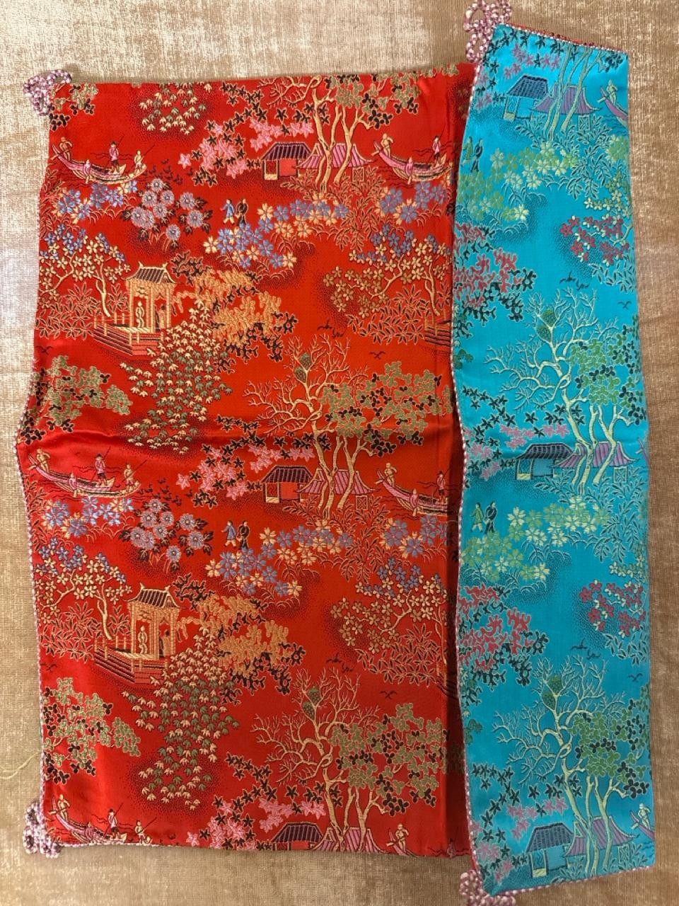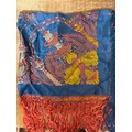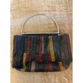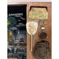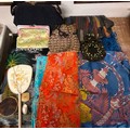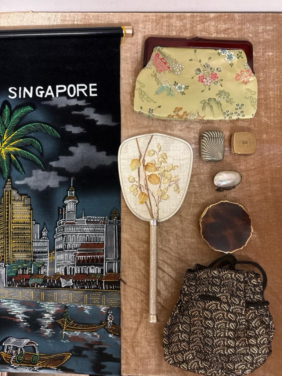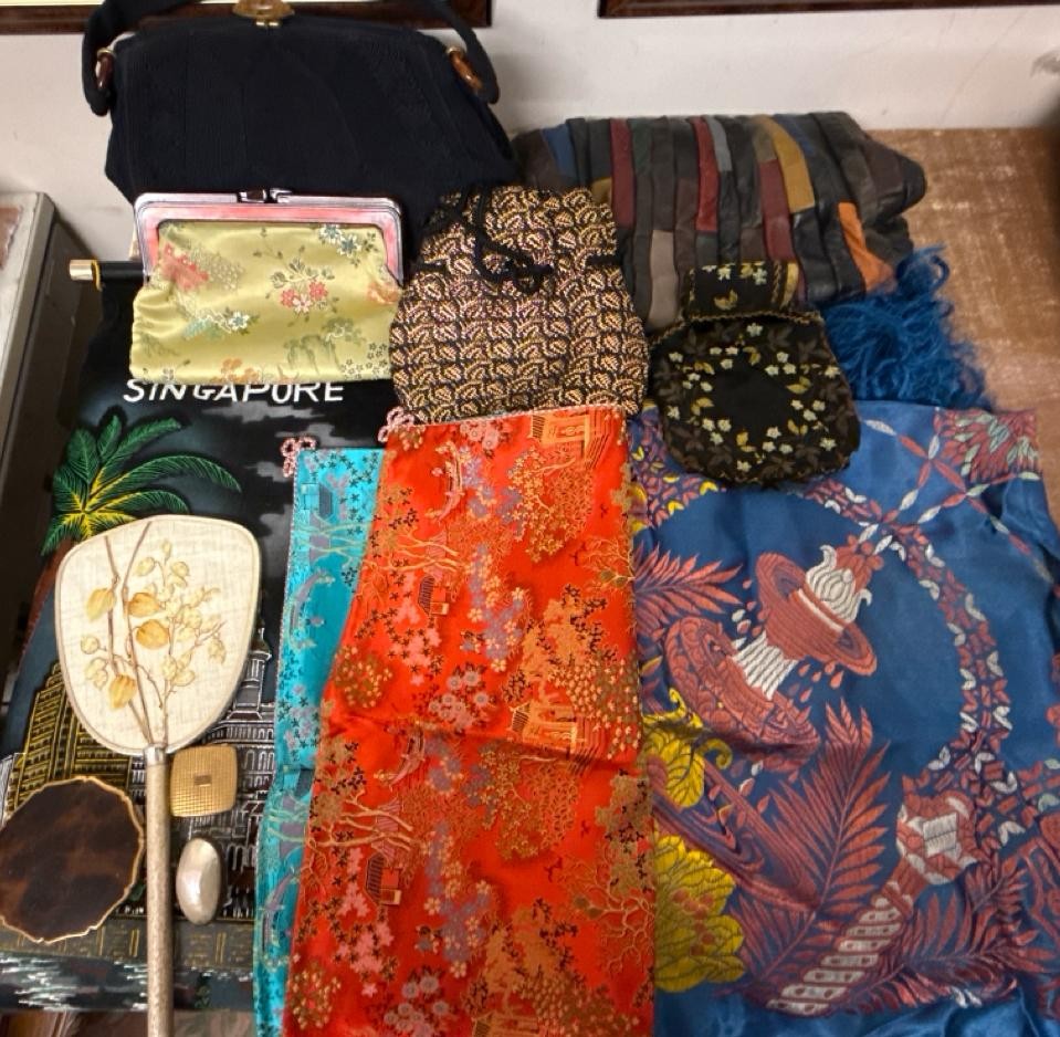 Beautifully silky tasselled shawl, Oriental / Chinese style cushion cover, handbag made of leather strips, a lovely black Cordé evening bag, two makeup bags, a Singapore wall hanging, vanity mirror, Vesta, pillbox, compact and mother of pearl thimble case