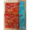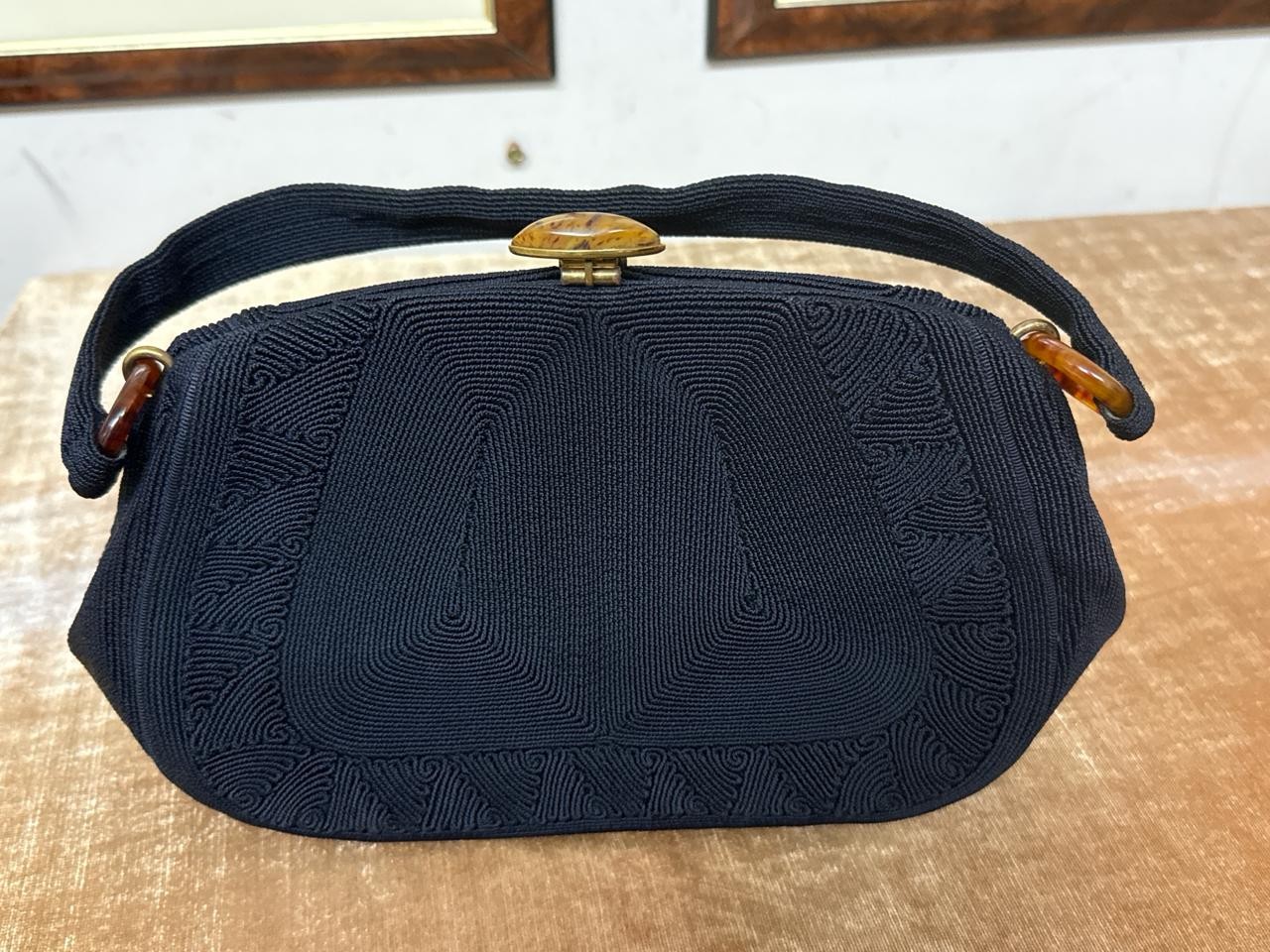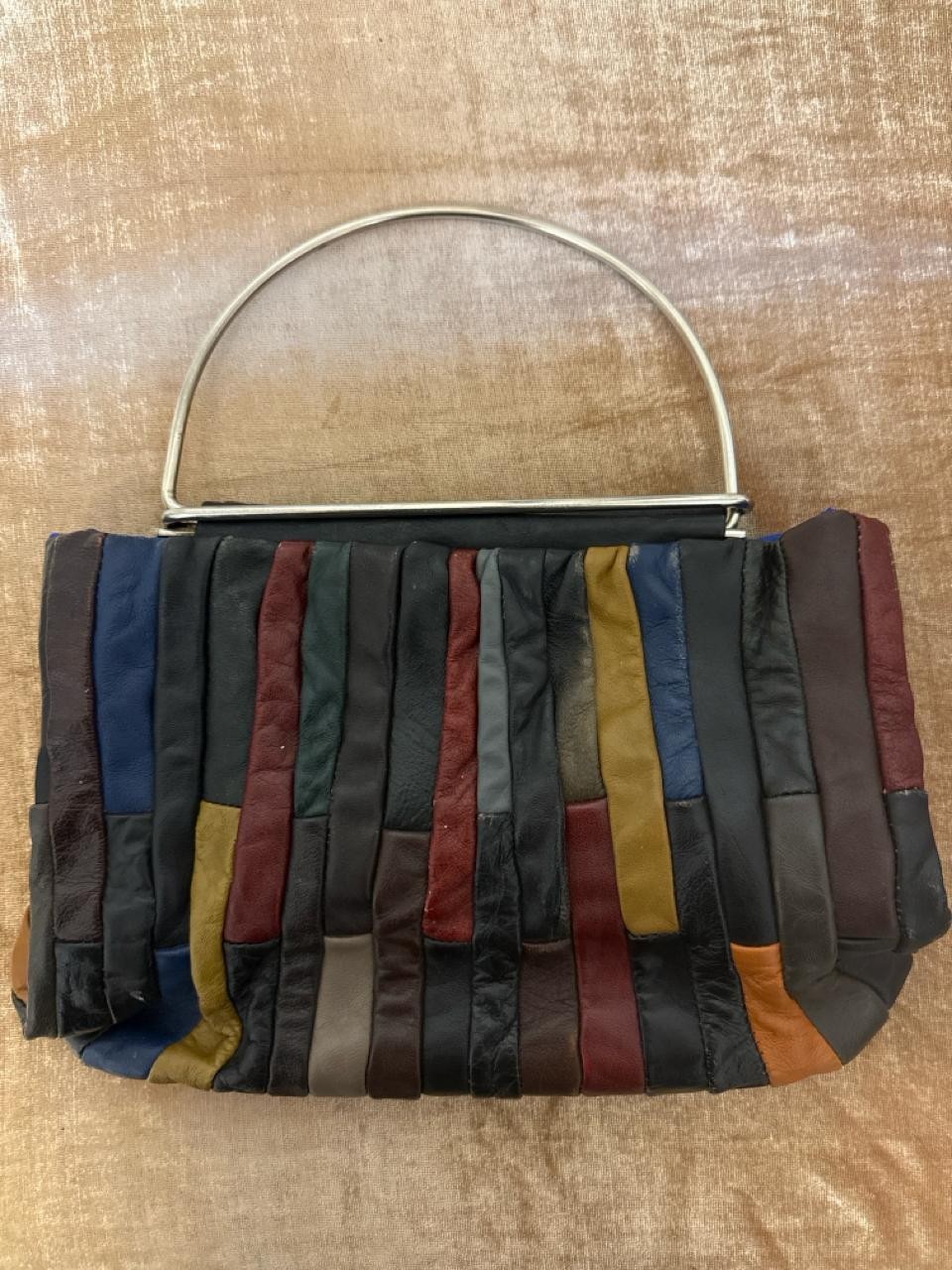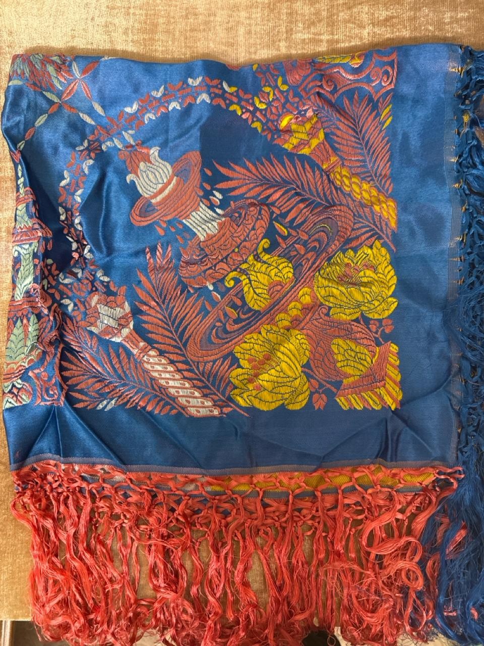Beautifully silky tasselled shawl, Oriental / Chinese style cushion cover, handbag made of leather strips, a lovely black Cordé evening bag, two makeup bags, a Singapore wall hanging, vanity mirror, Vesta, pillbox, compact and mother of pearl thimble case