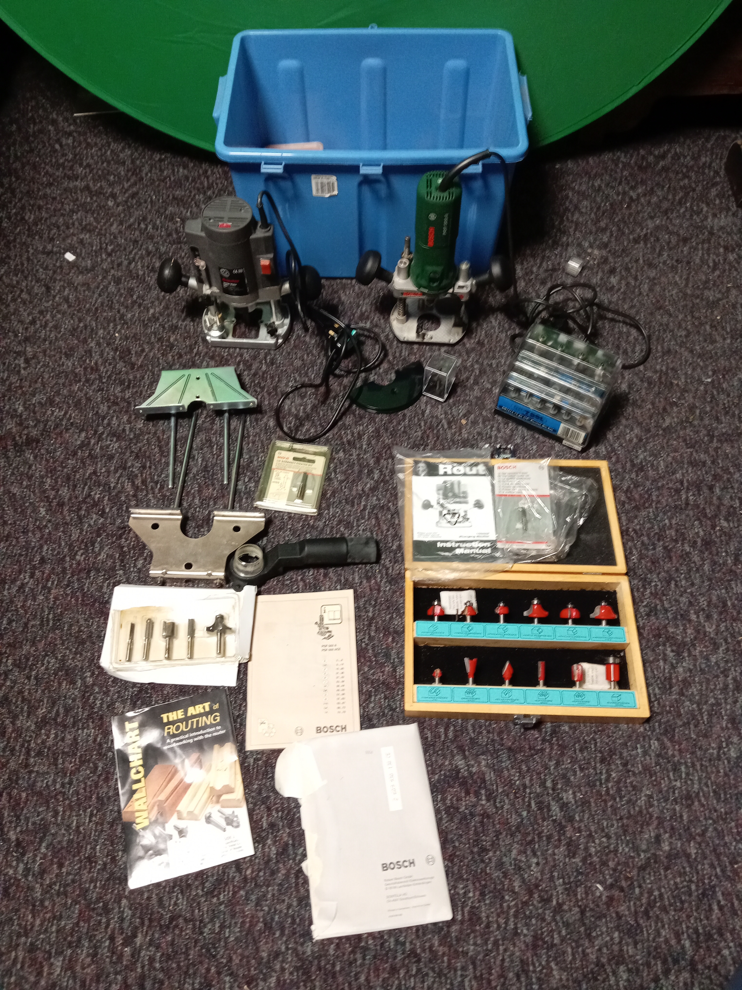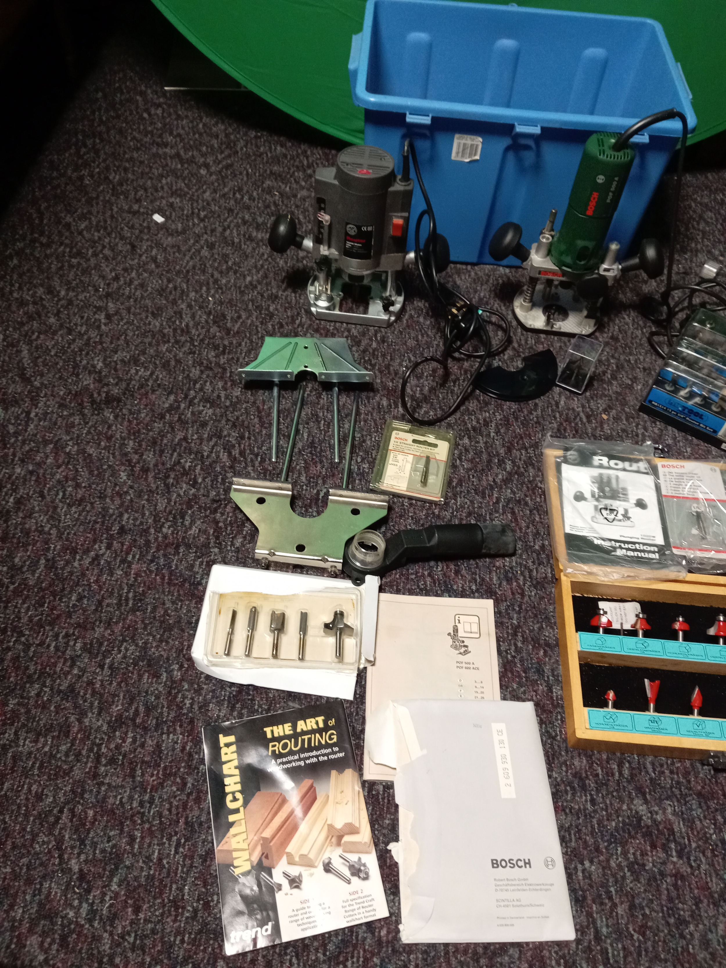 A pair of plunge routers. To include a bosch, a performance power, instructions, router bits, etc...
