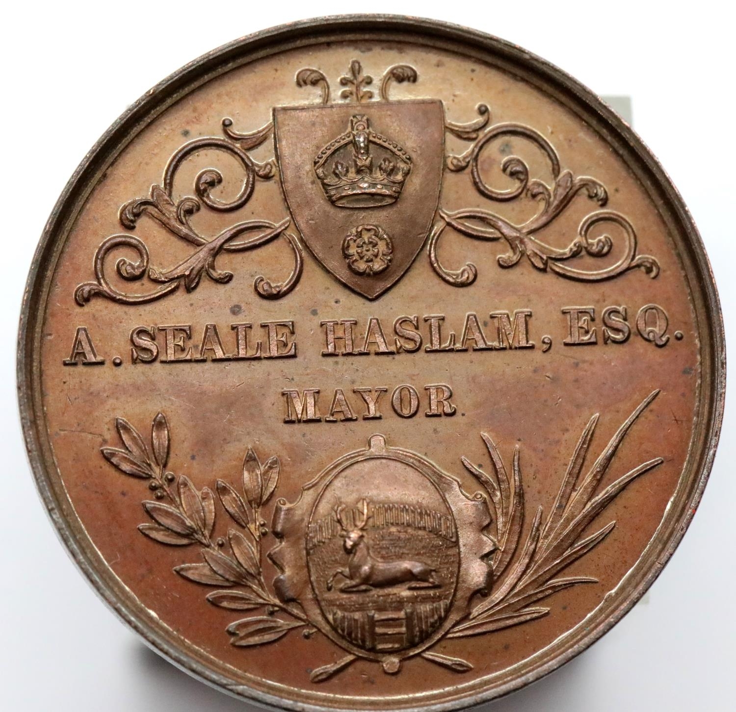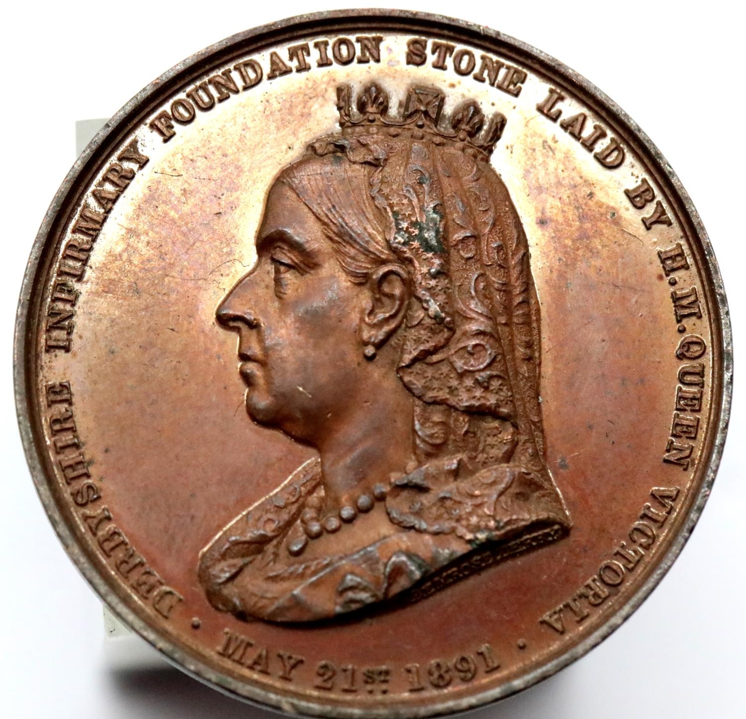 Queen Victoria medallion - Derbyshire Infirmary laying of foundation stone 1891. P&P Group 1 (£14+VAT for the first lot and £1+VAT for subsequent lots)