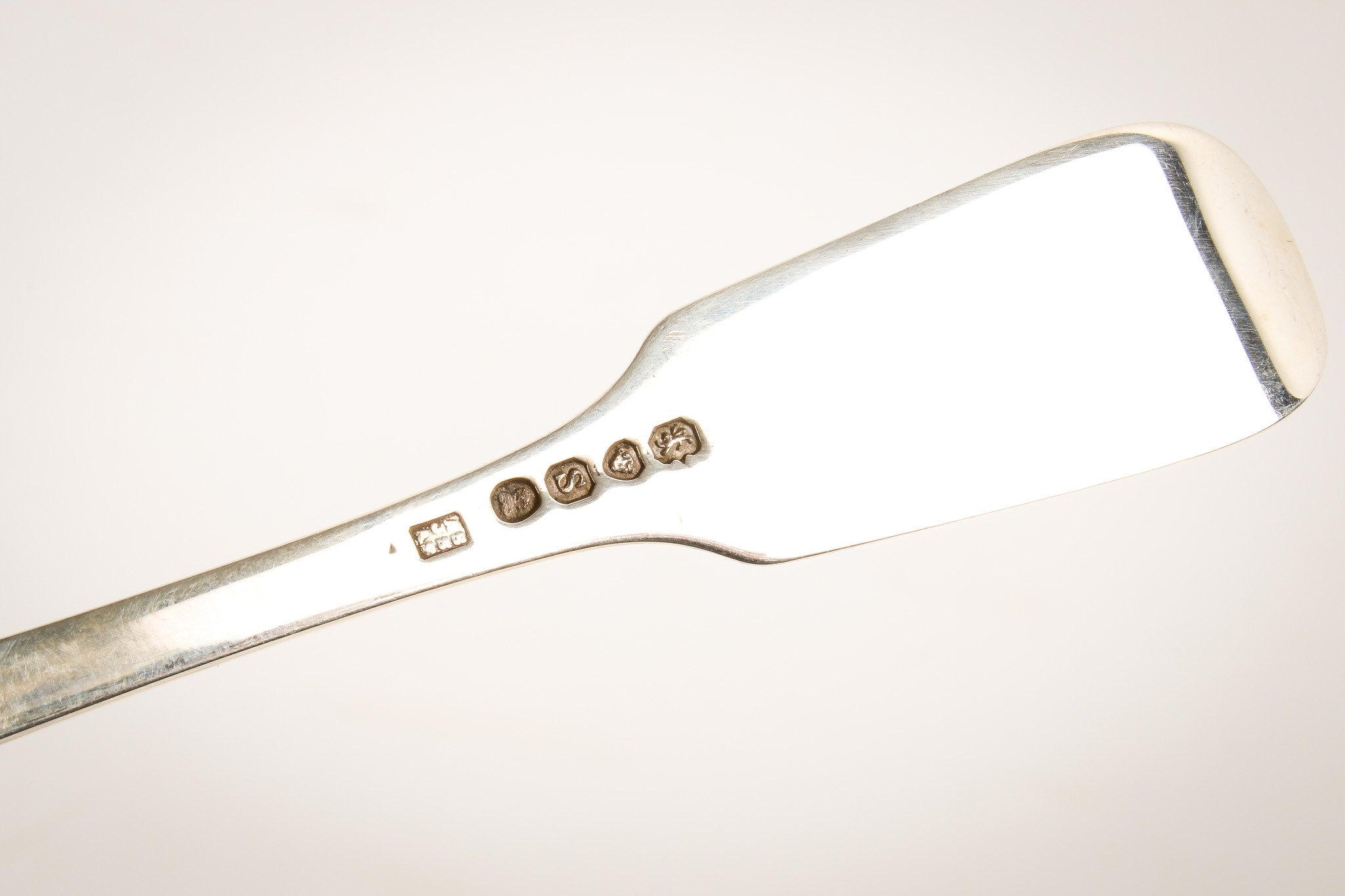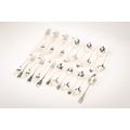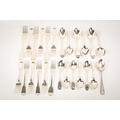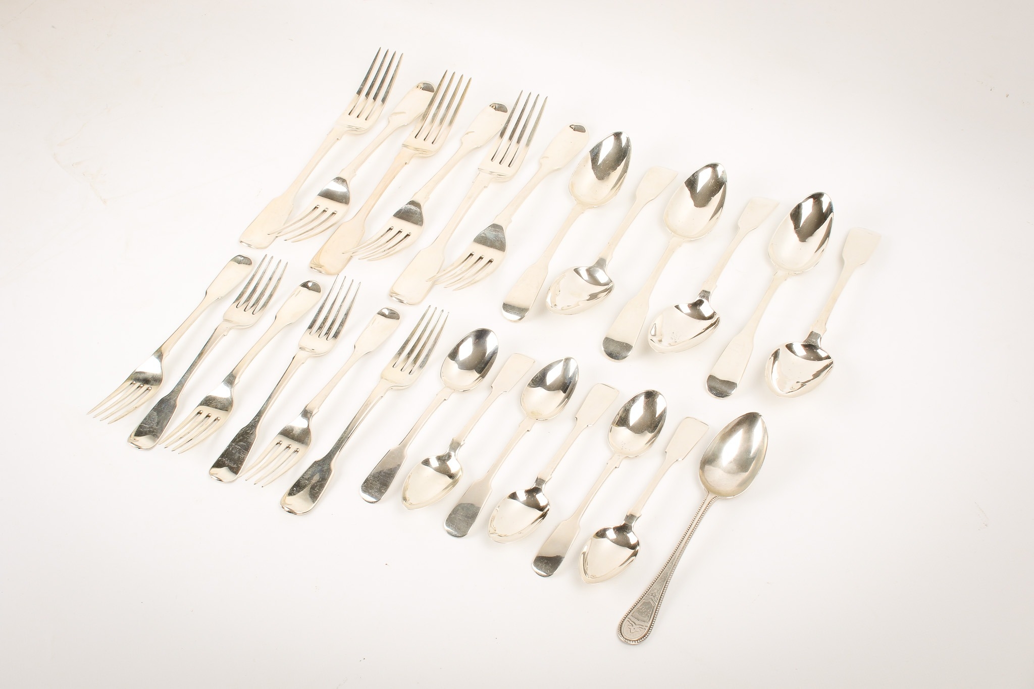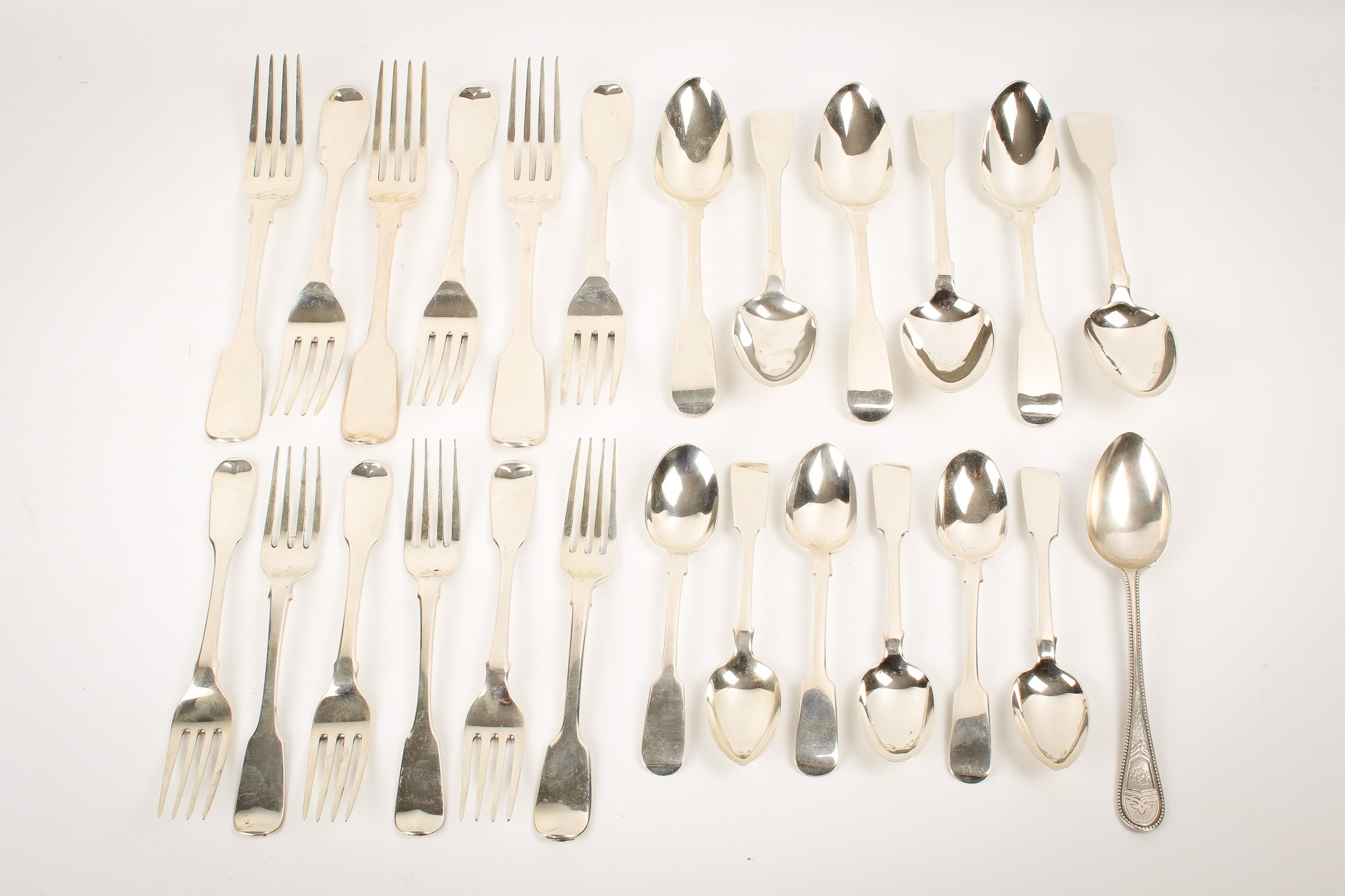 A quantity of 19th century silver flatware. Comprising a part Georgian set of six dessert spoons, six forks, (London 1809 and 1810) and six large forks (London 1833); together with a set of six Victorian teaspoons, Josiah Williams & Co, Exeter 1880, and a single Victorian dessert spoon. Gross weight 1093g.
