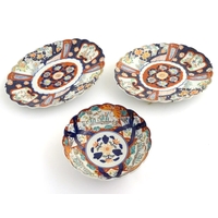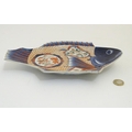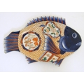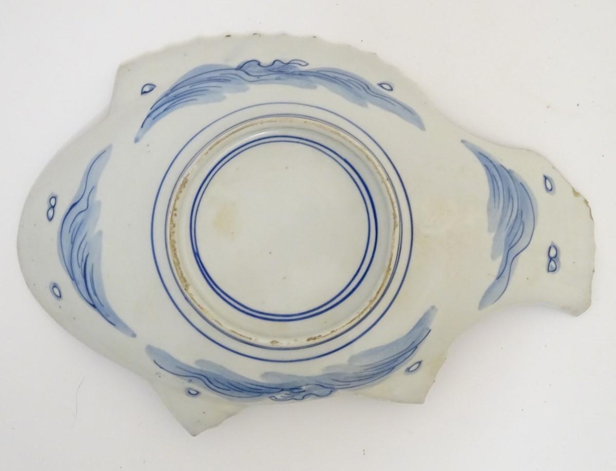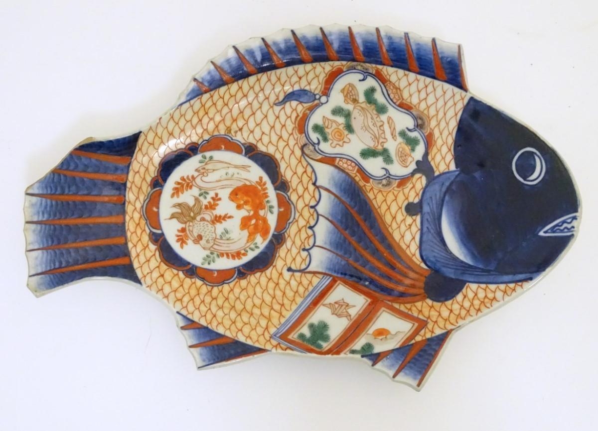 An Imari dish formed as a fish, decorated with panels depicting shells and fish, and stylised water patterns verso. Approx. 11 1/4'' x 7 1/2''
