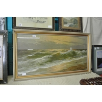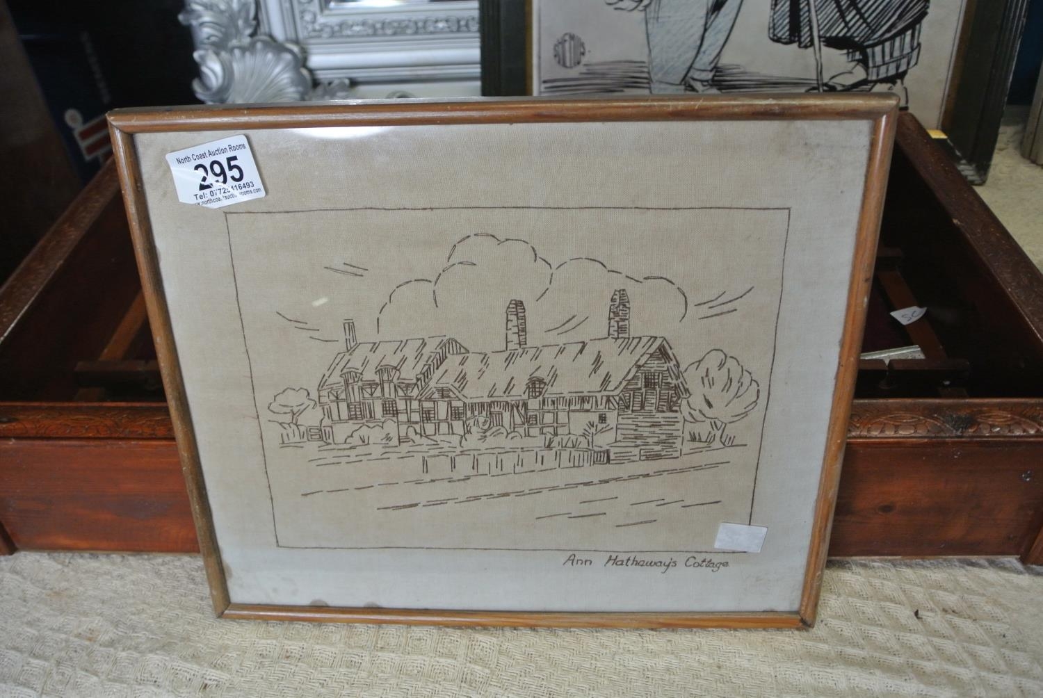 A framed stich work piece of Ann Hathaway's Cottage.
